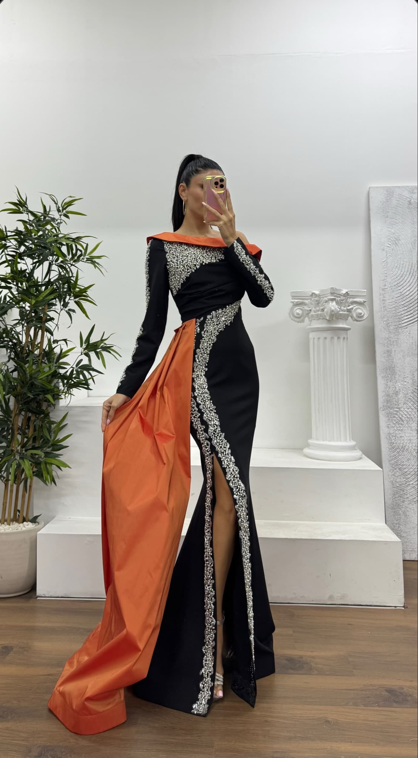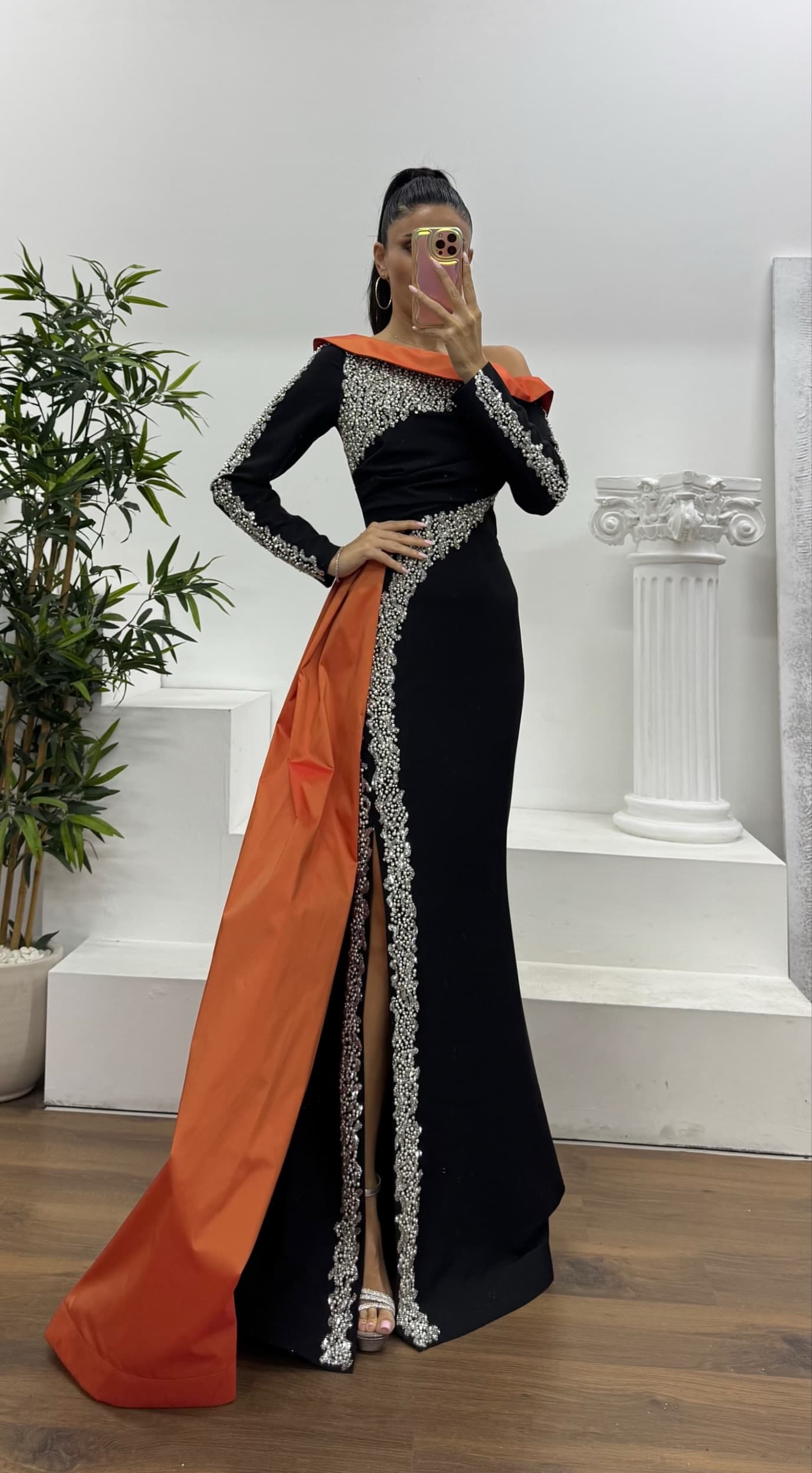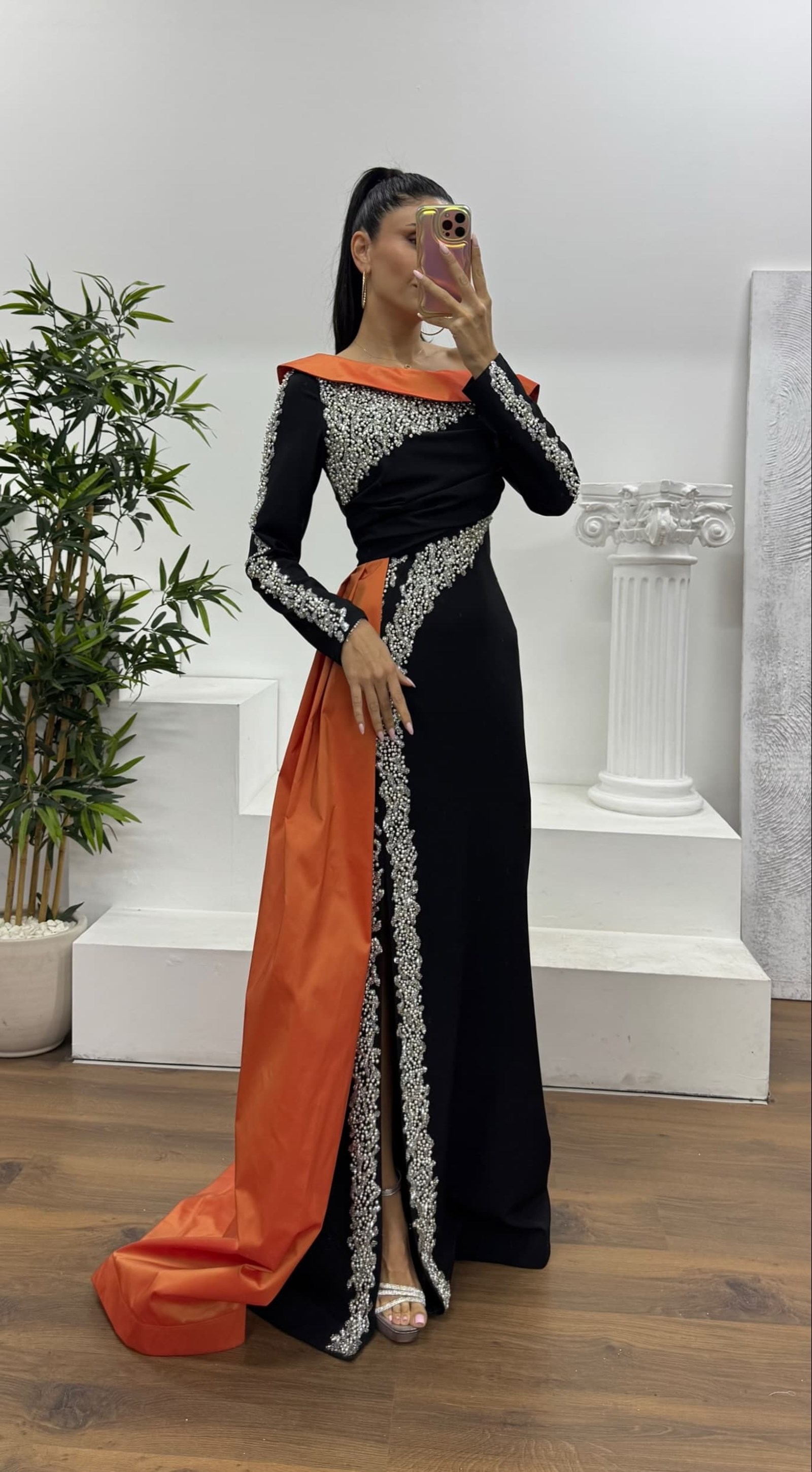 • Turuncu Kayık Yaka İnci İşlemeli Abiye Elbise