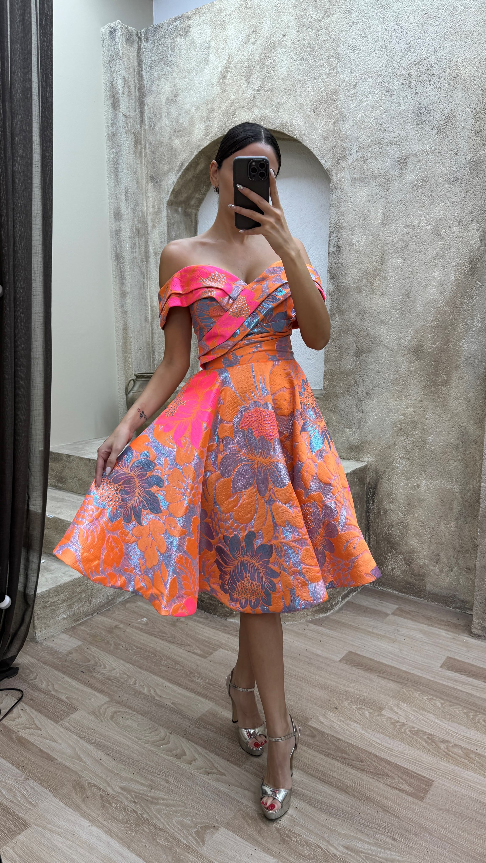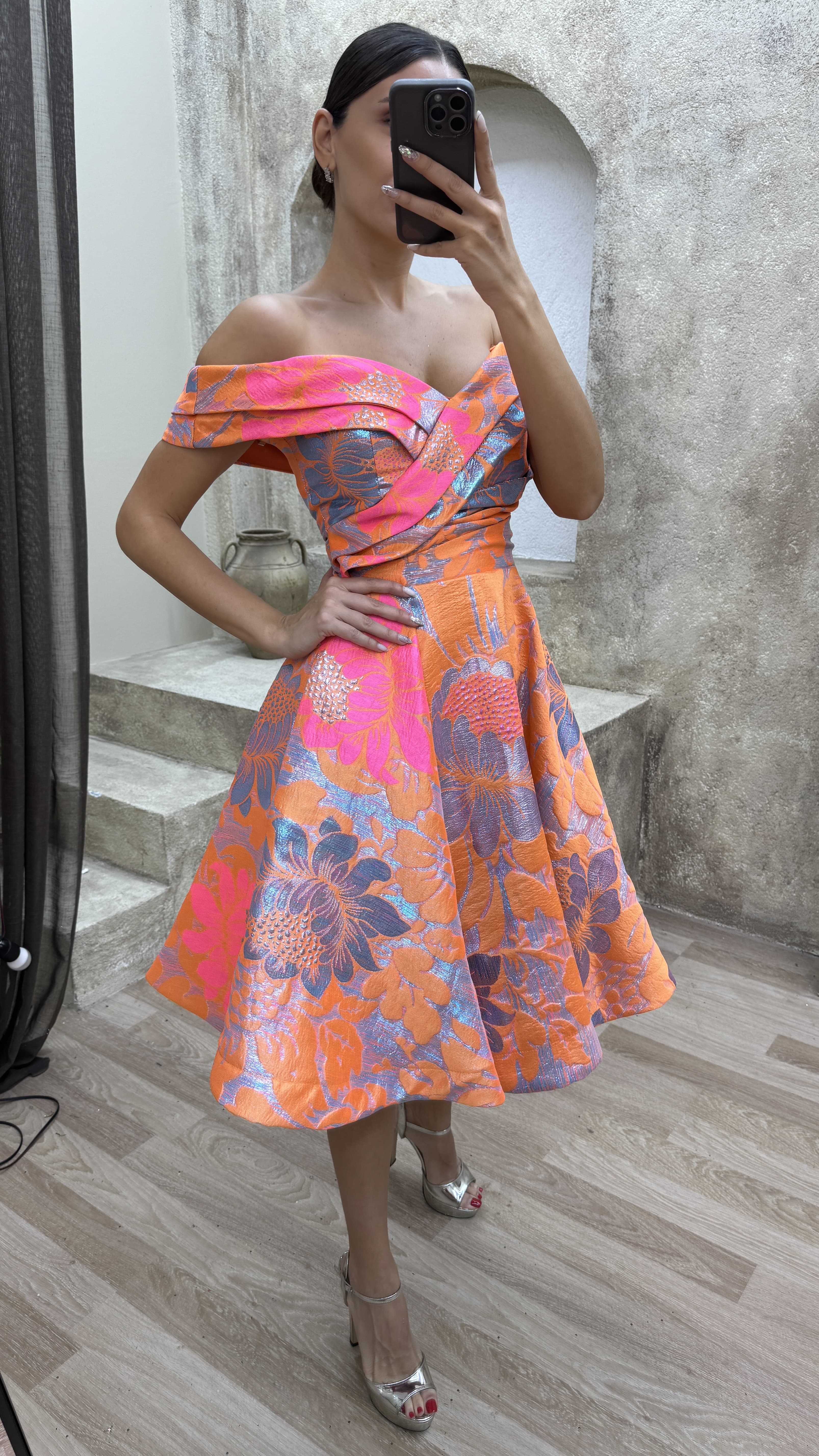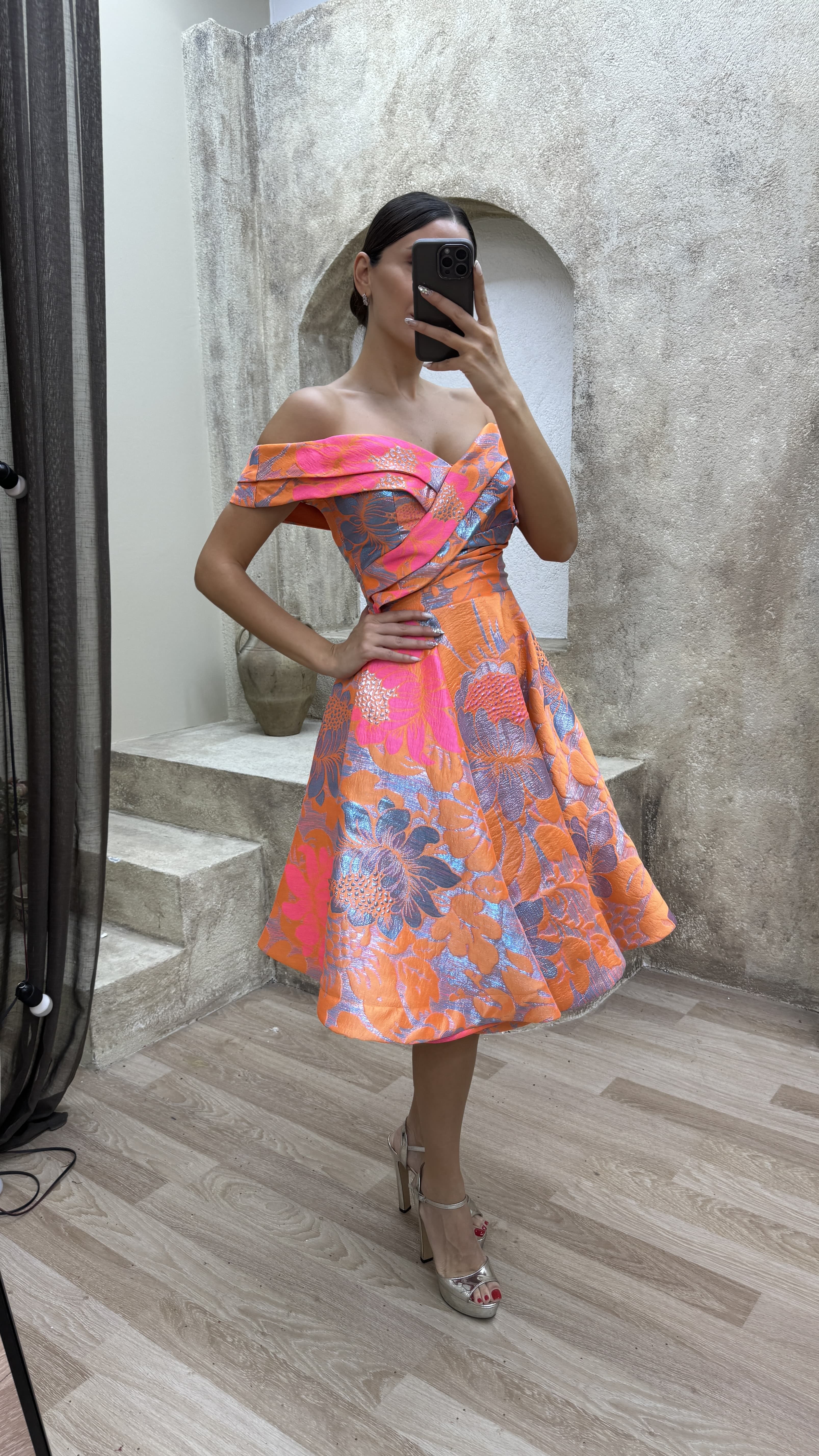 Turuncu Kayık Yaka Tasarım Midi Boy Elbise