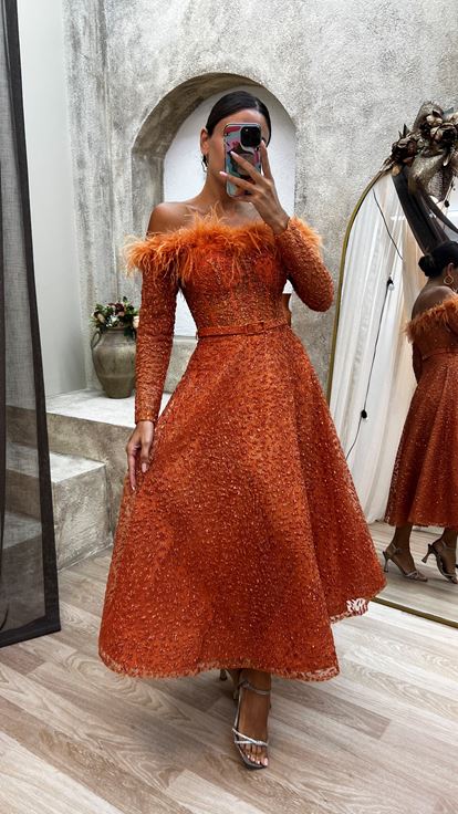 • Turuncu Straplez Göğsü Tüy Detay İşlemeli Midi Boy Elbise
