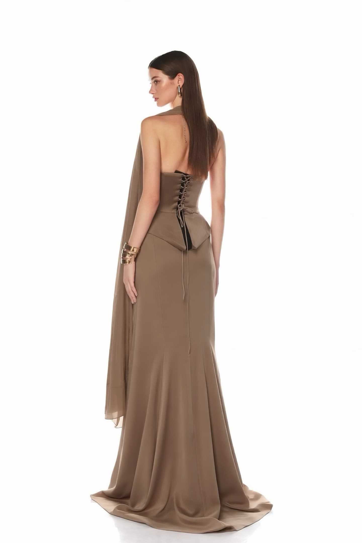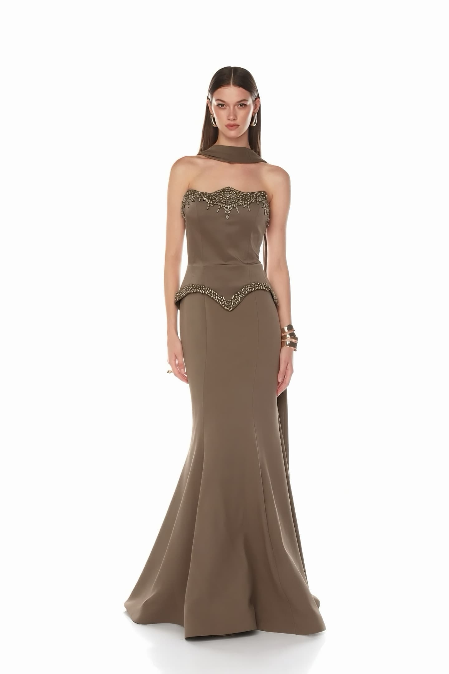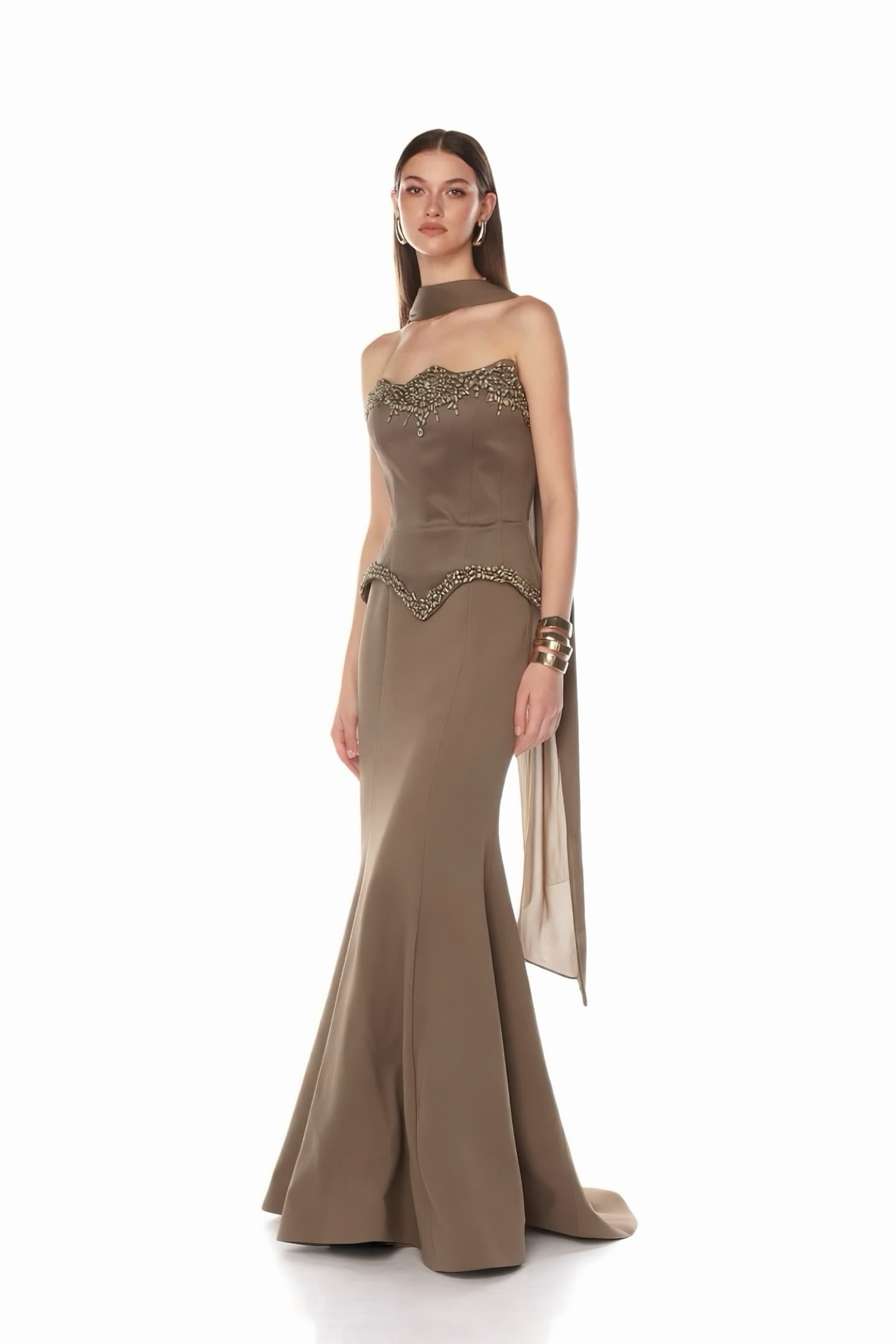 • Kemik Balık Kesim Taş İşlemeli Abiye Elbise