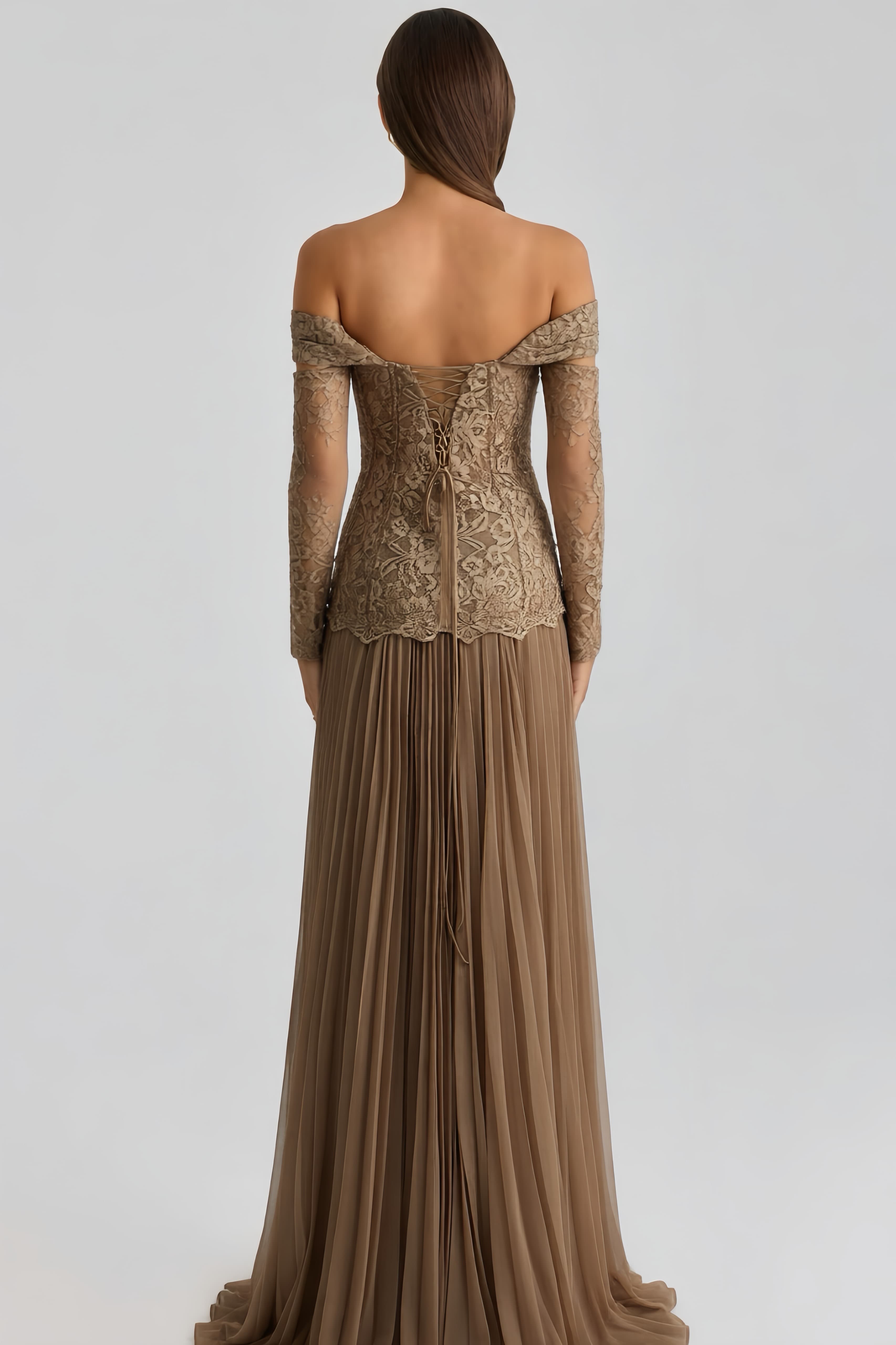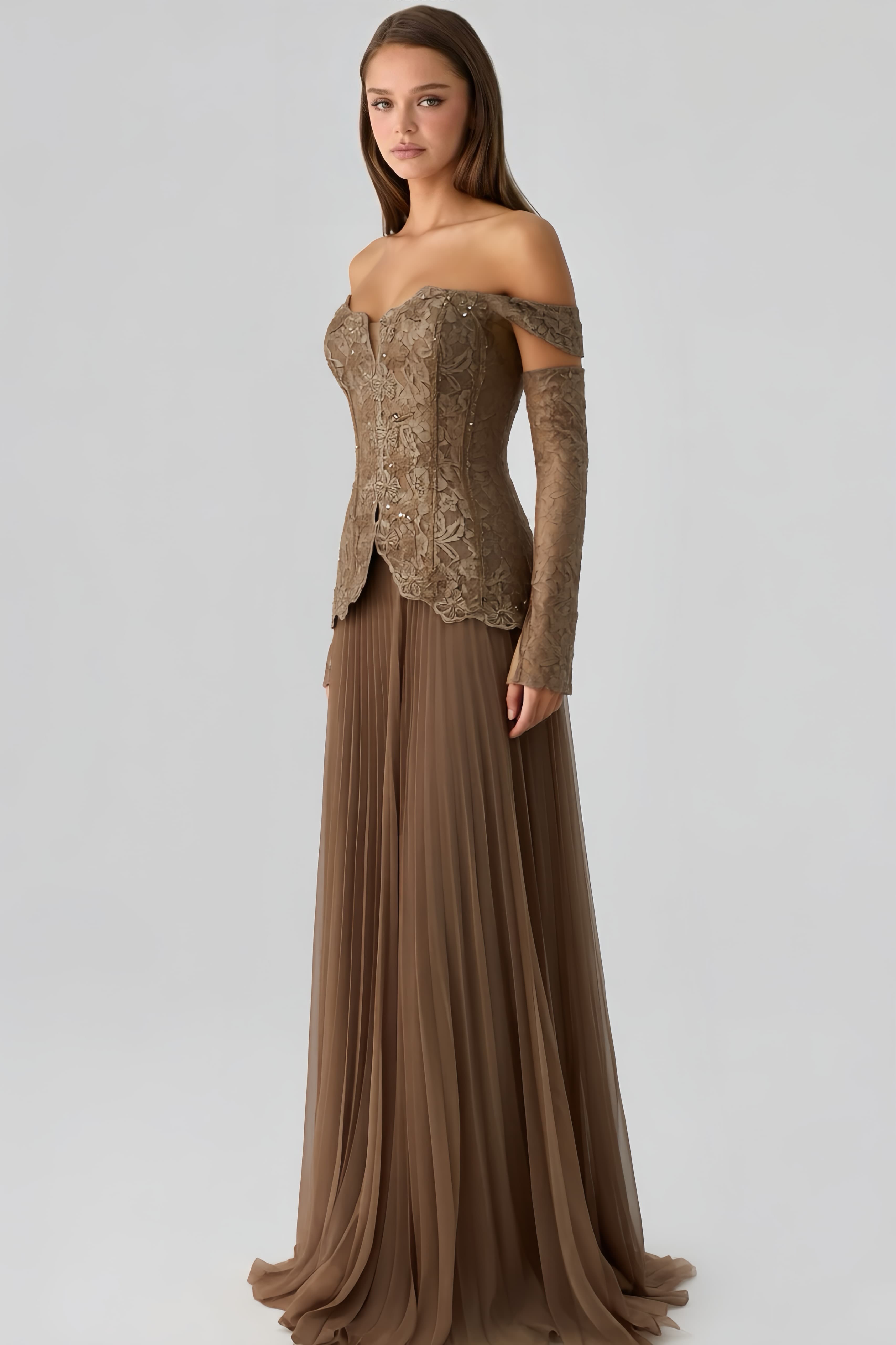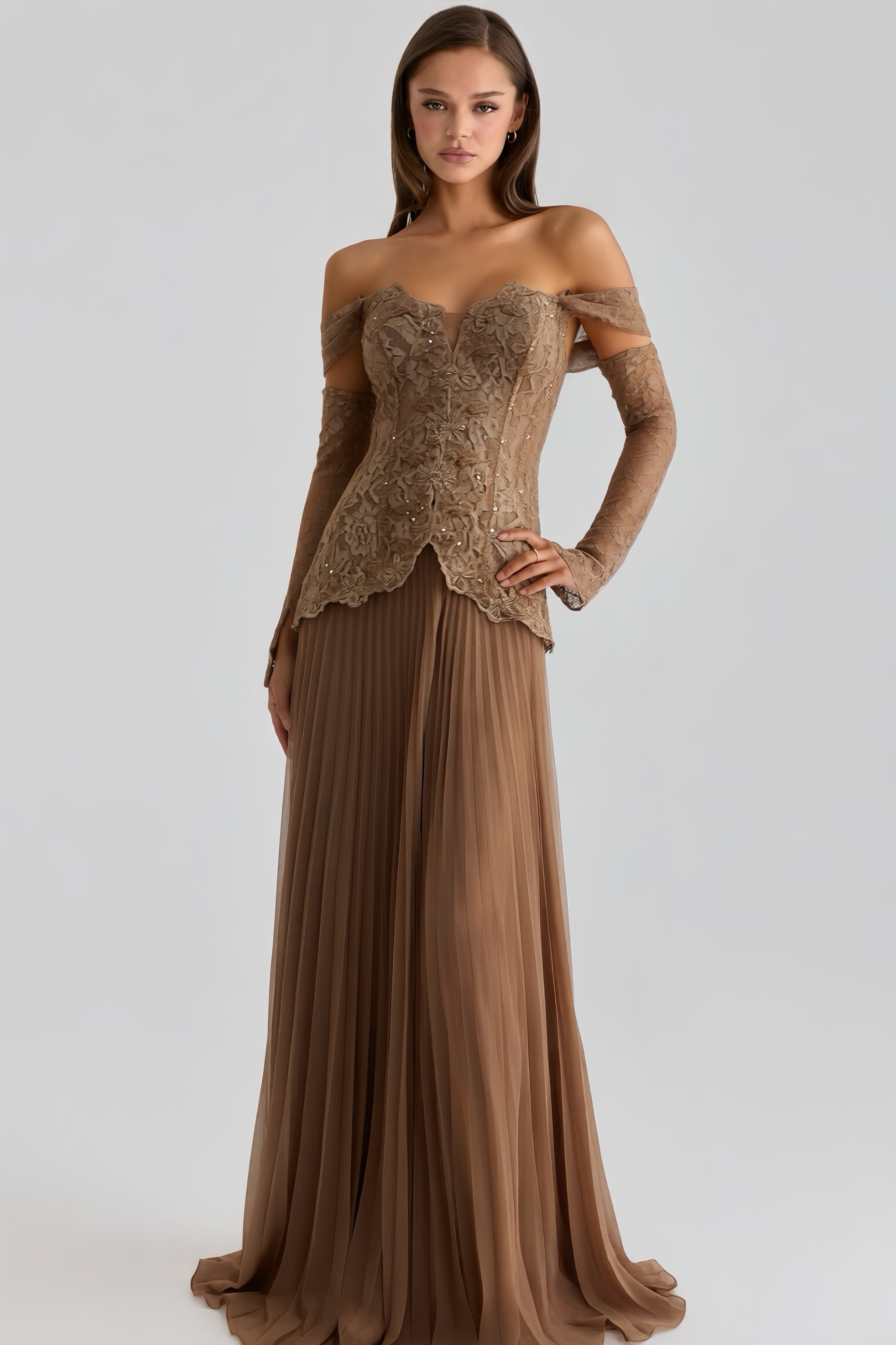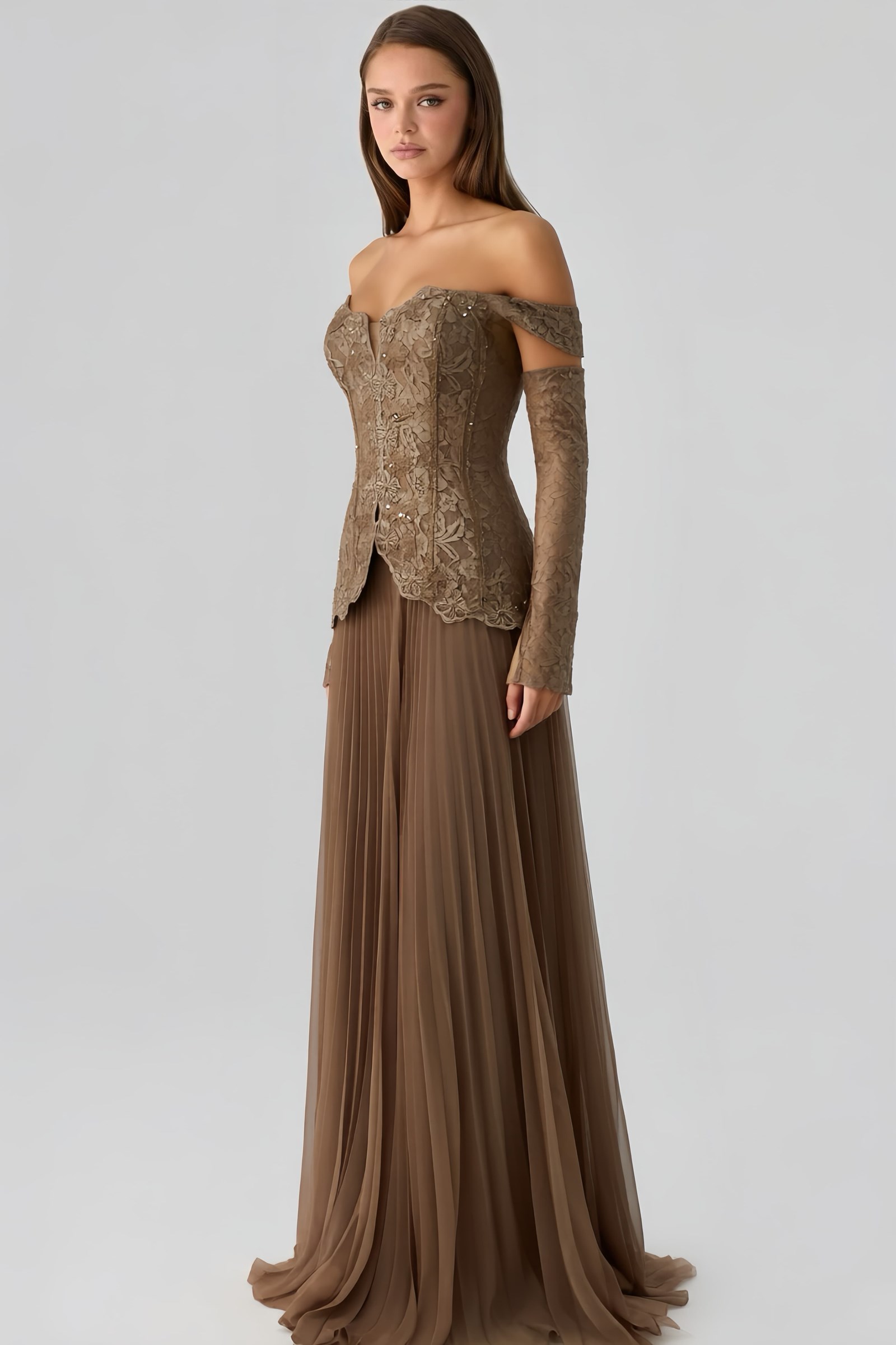 • Kahverengi Düşük Omuzlu Pileli Abiye Elbise