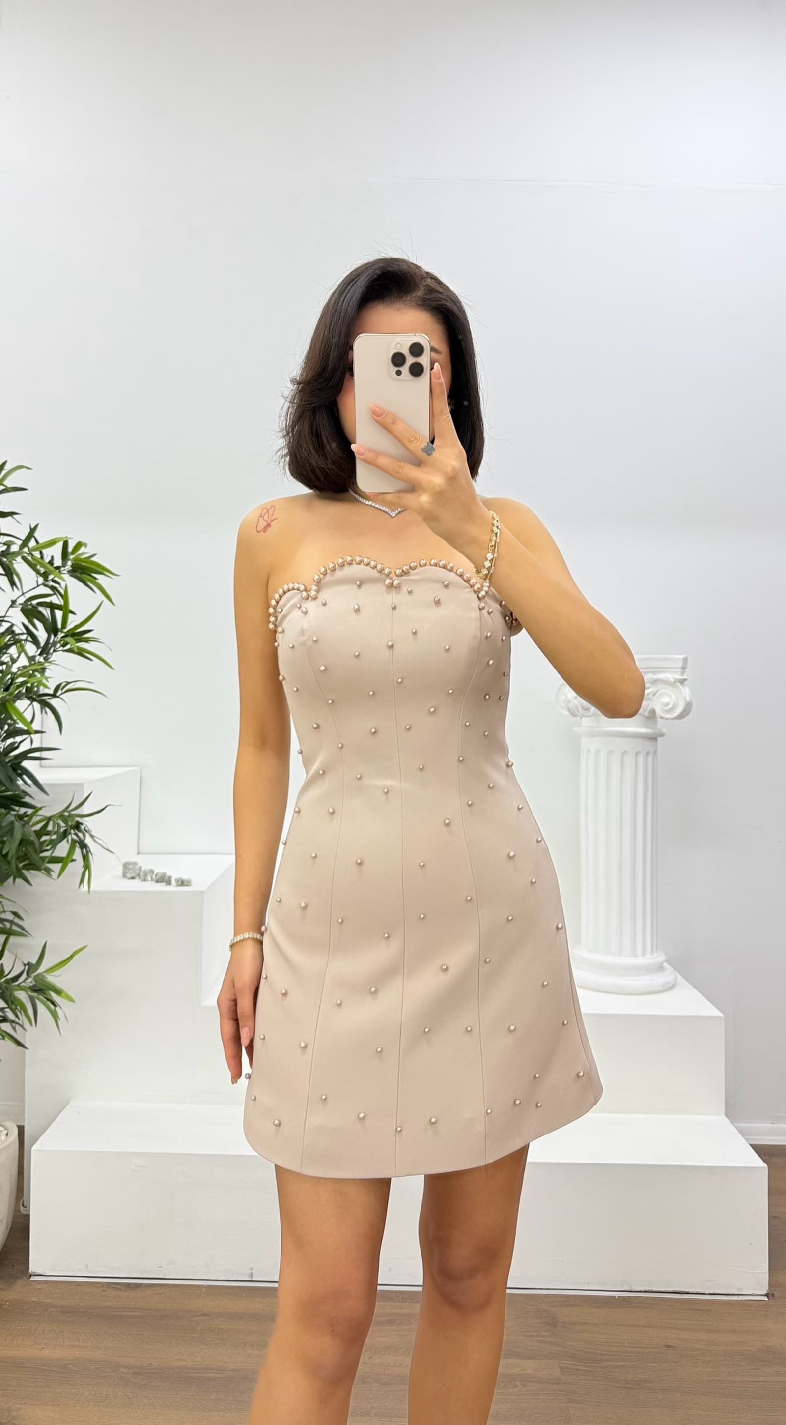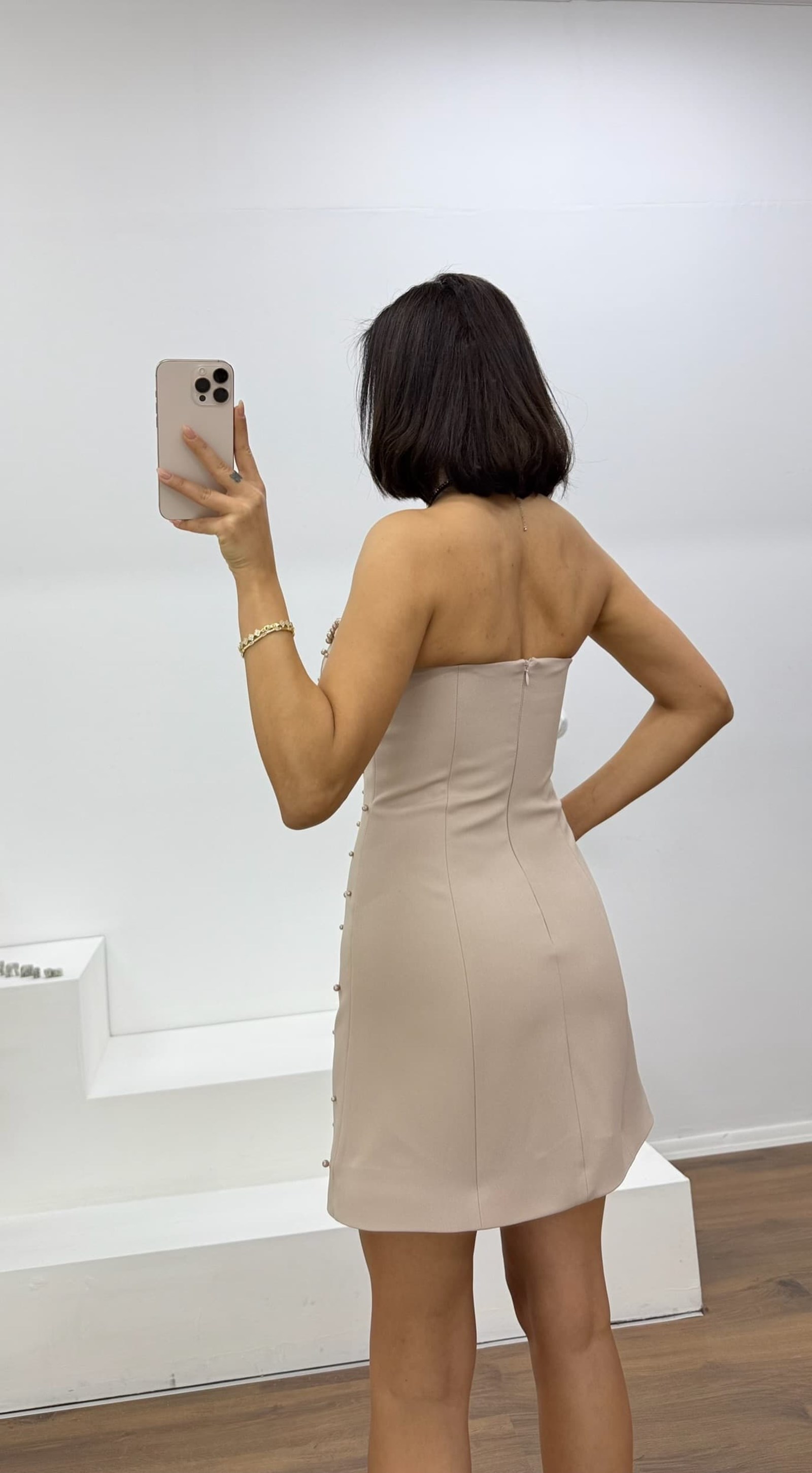 • Kemik İnci Detaylı Kalp Yaka Straplez Mini Abiye Elbise