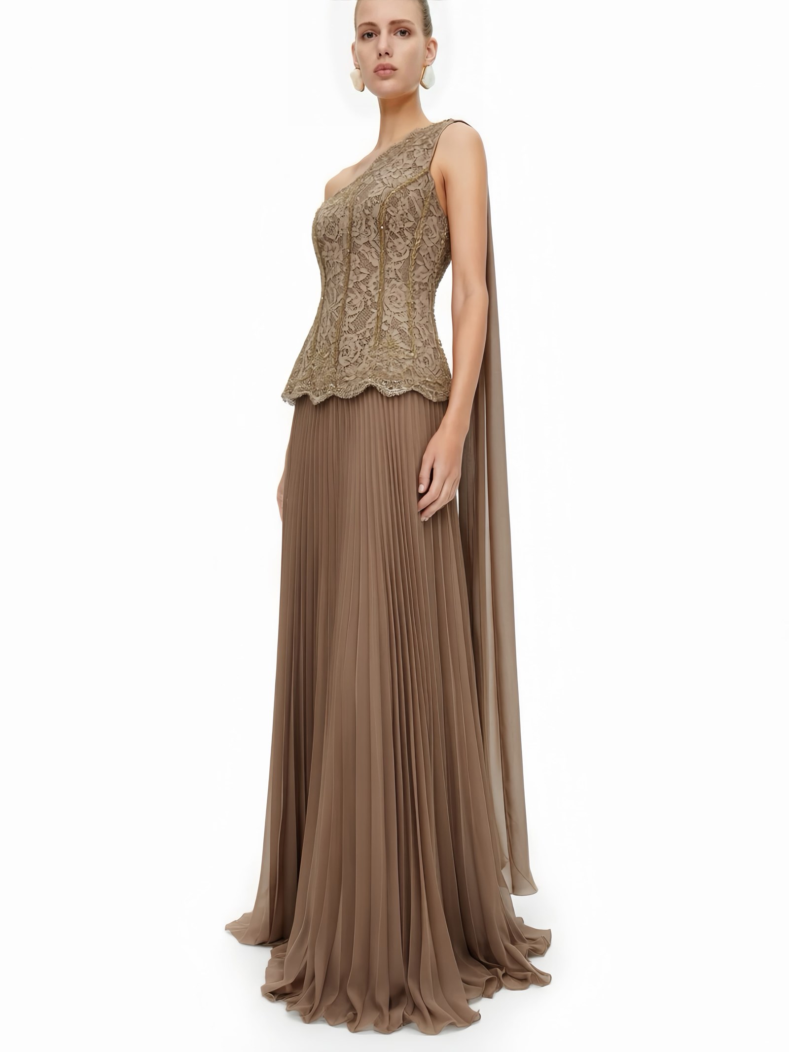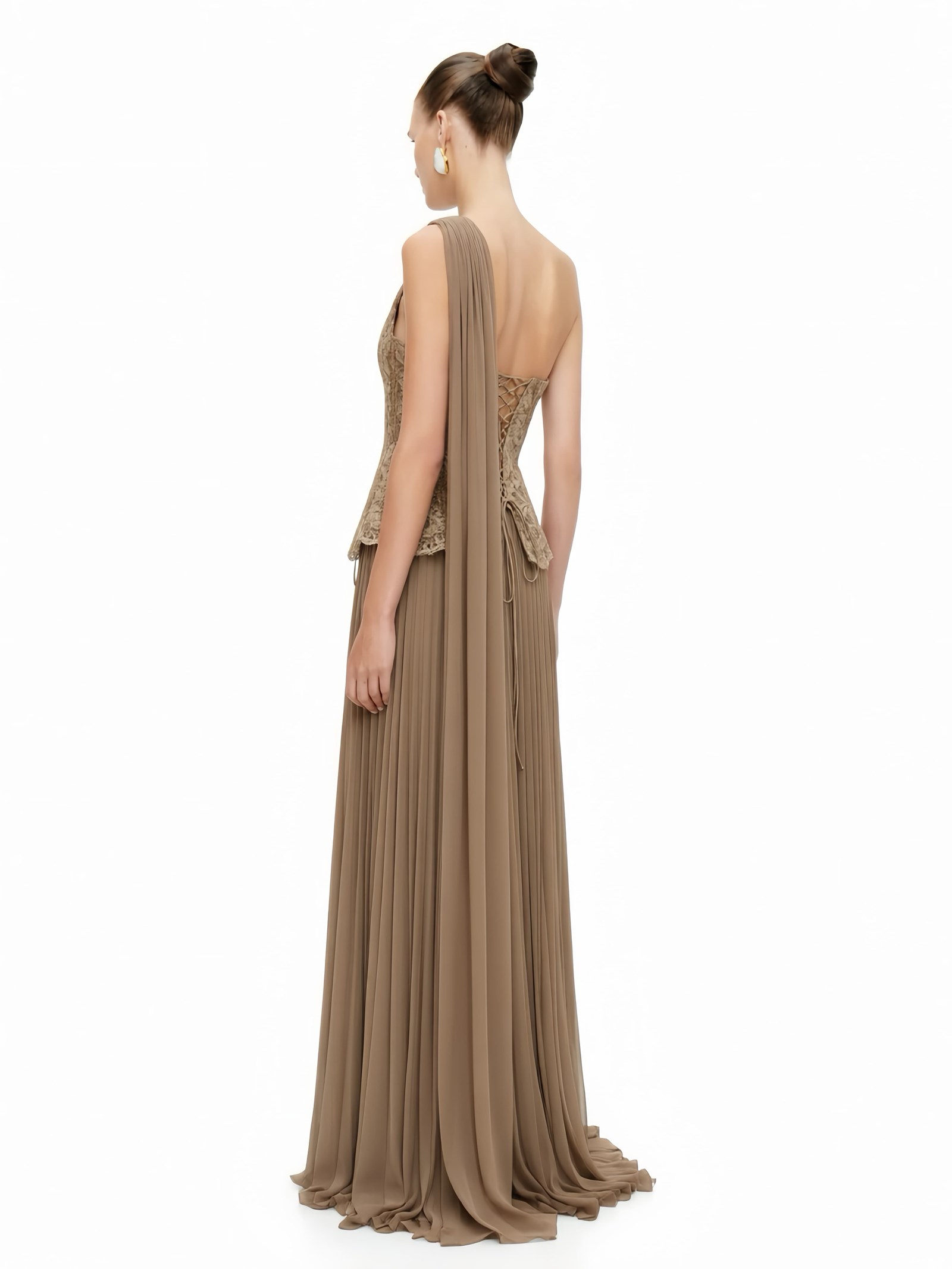 Modern ve dikkat çekici tasarımıyla öne çıkan bu özel abiye, Pileli etek yapısı, Şifon kumaş akışı, Korse üst yapı, Vücuda oturan kalıp detayları ile güçlü ve zarif bir duruş sunar. Modelin tasarım detayları elbiseye sofistike bir görünüm kazandırırken, vücuda uyum sağlayan formu sayesinde şık ve estetik bir siluet oluşturur.