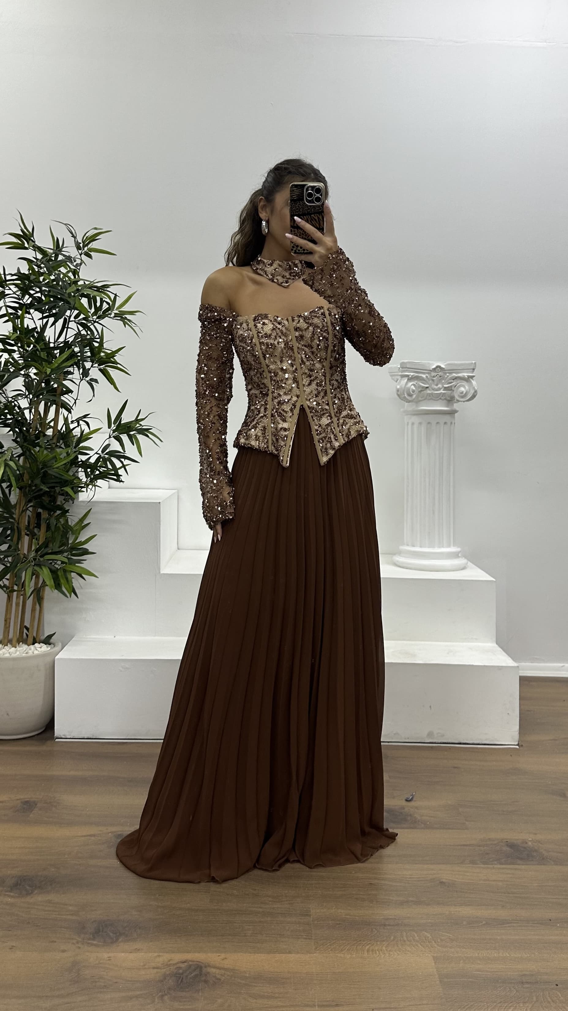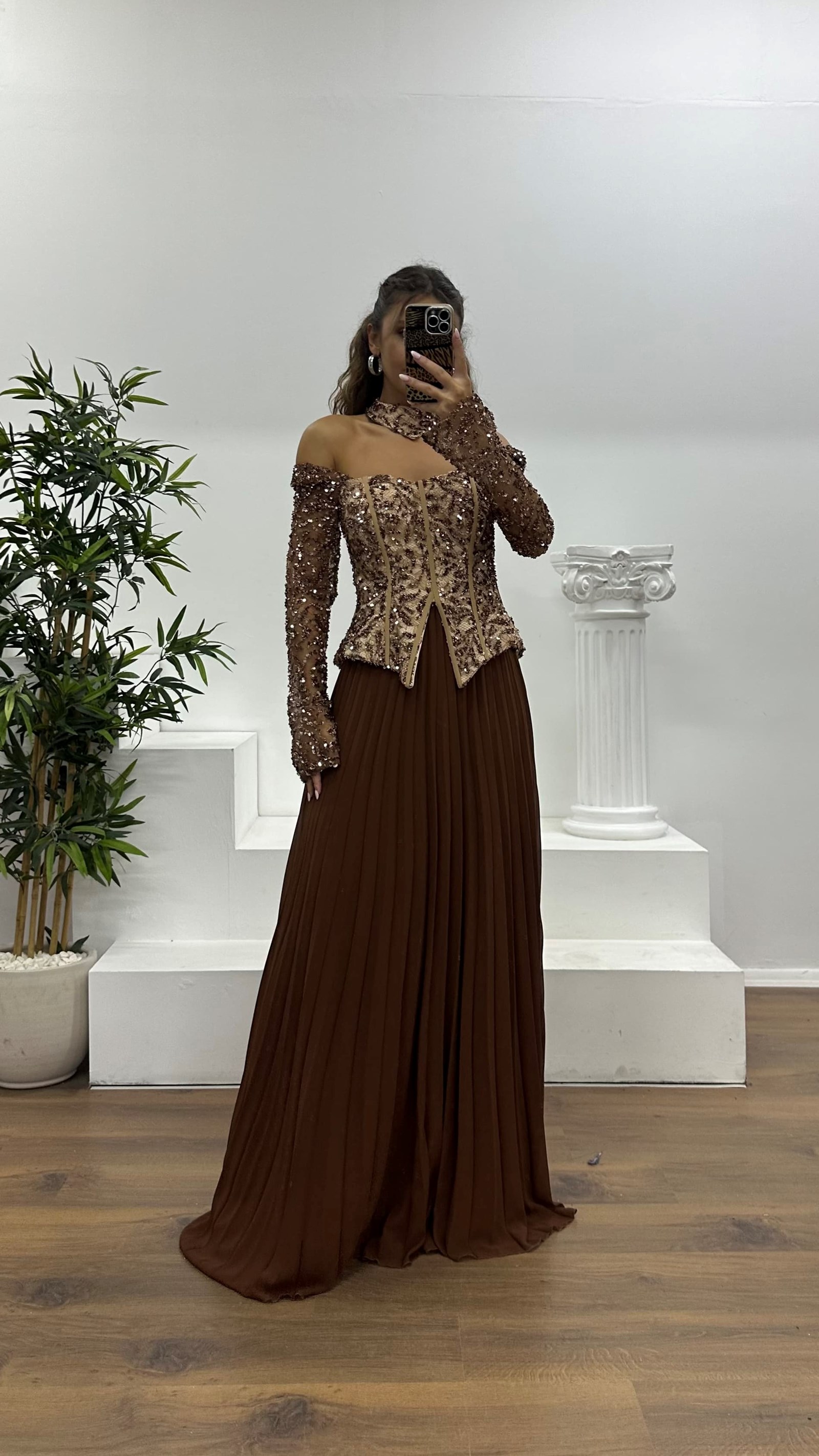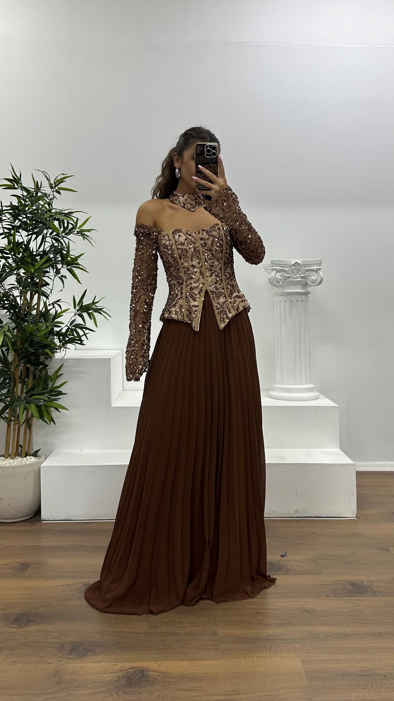 Ürün 36-42 bedene kadar uyumlu, göğüs pedli, astarlı, fermuarlı, boyun detay, işlemeli abiye olarak tasarlanmıştır.