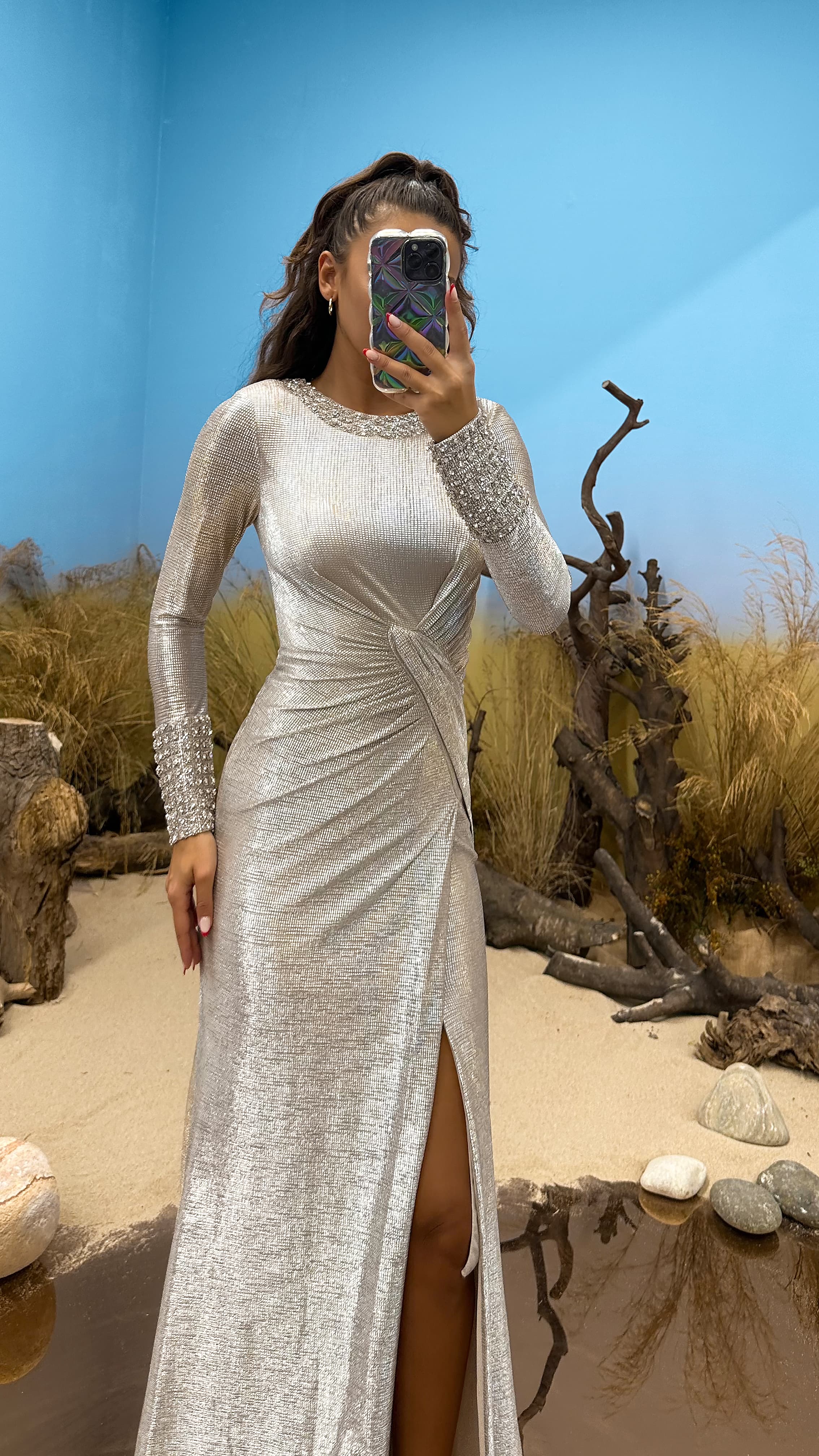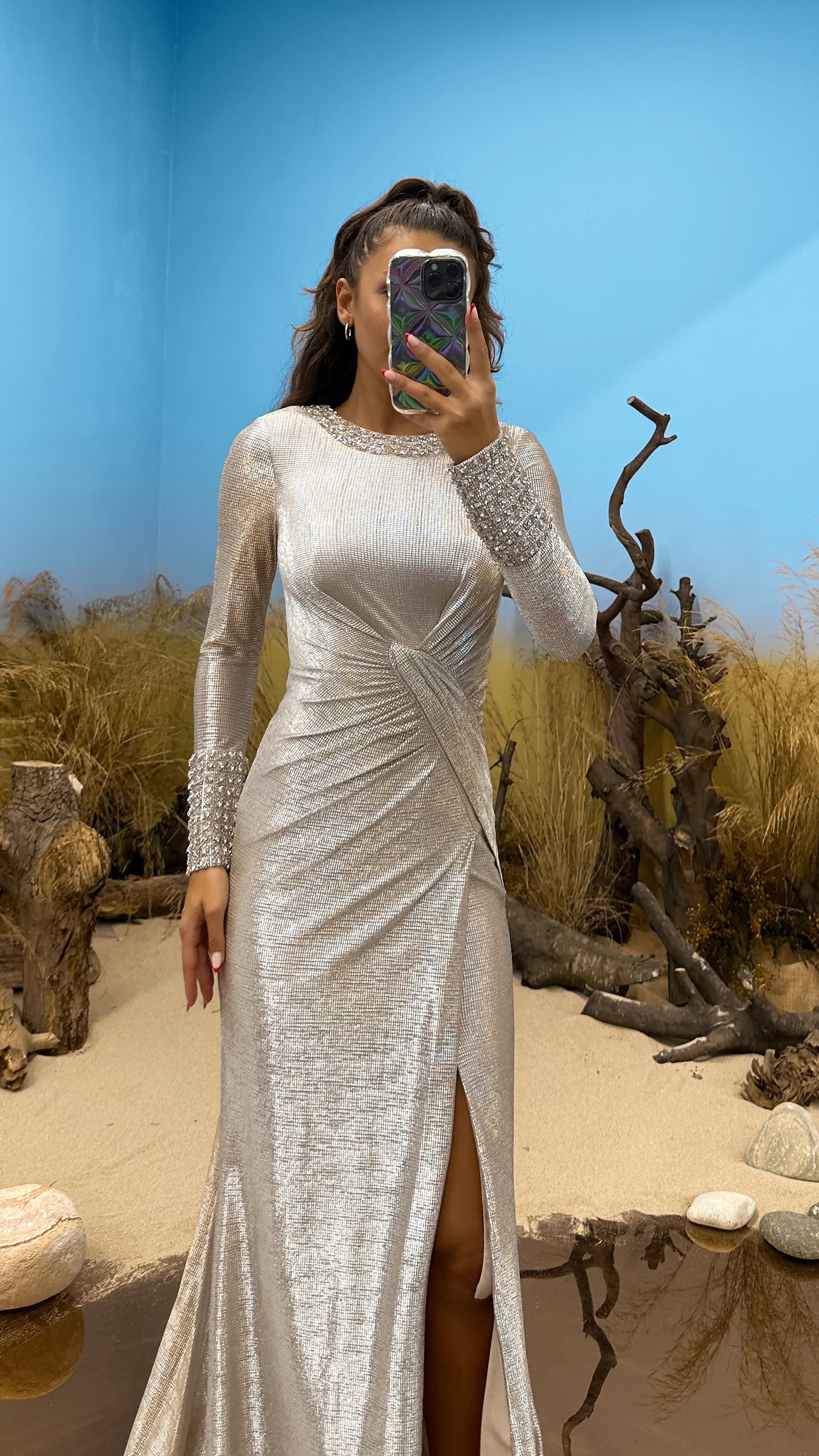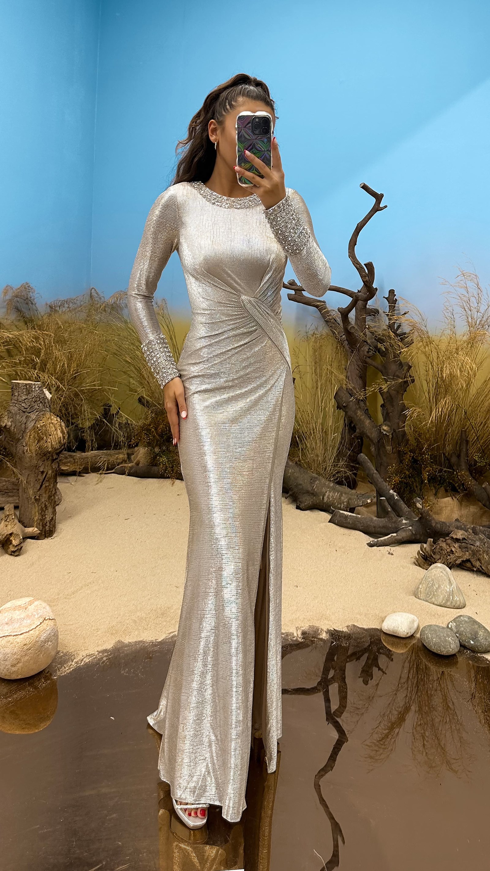 • Vizon Kol ve Yaka Taş Detay Abiye Elbise