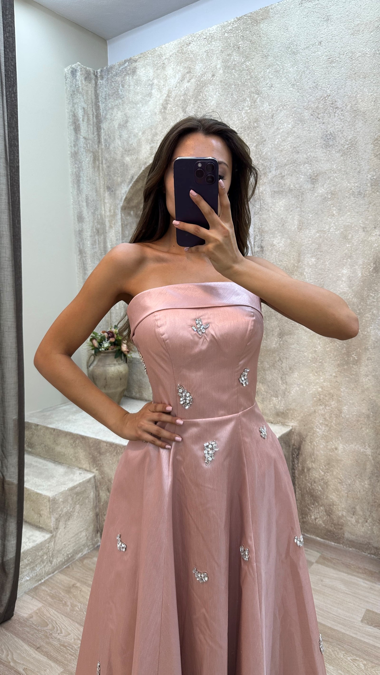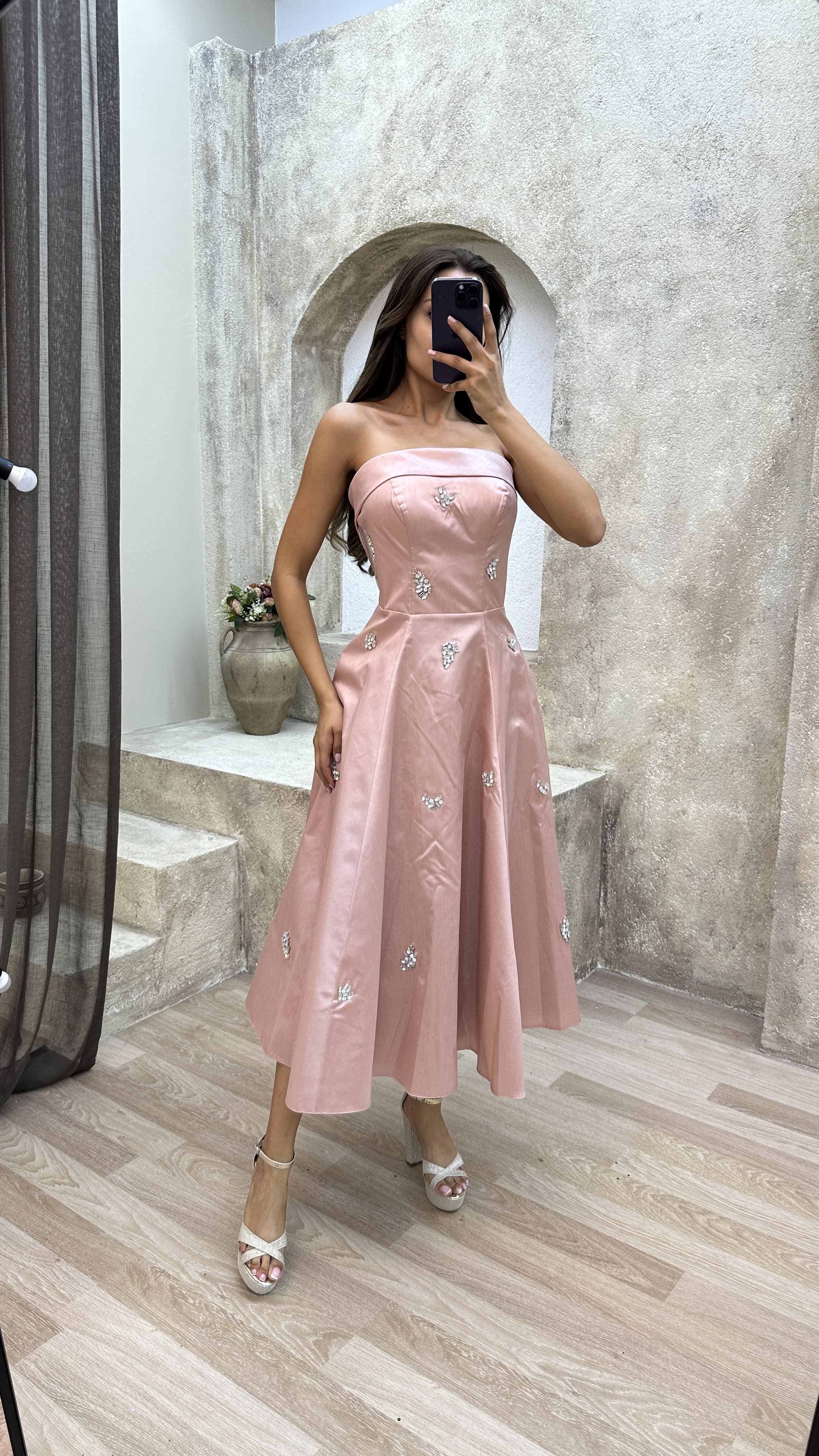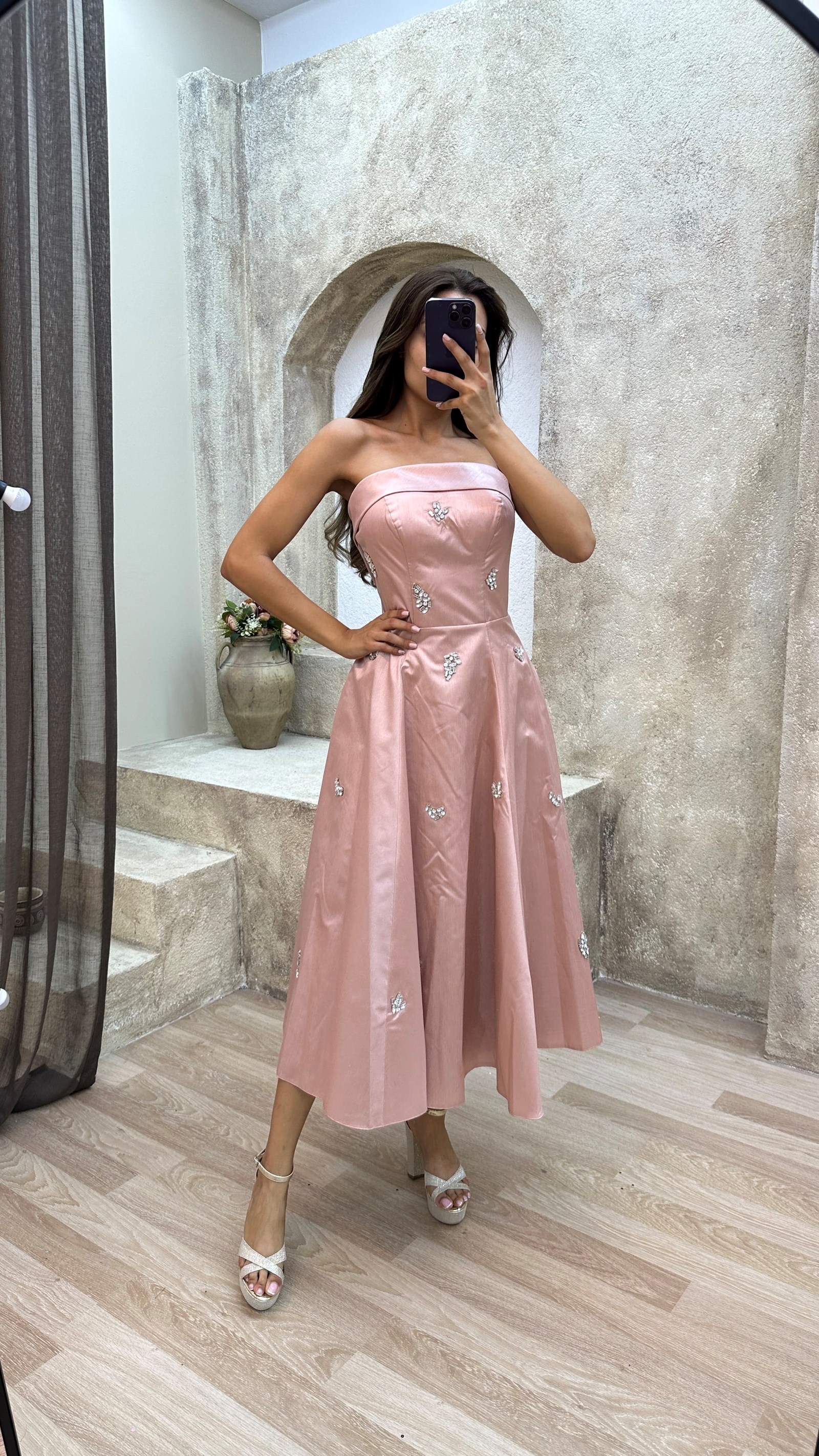 • Vizon Straplez Kayık Yaka Taş İşlemeli Elbise