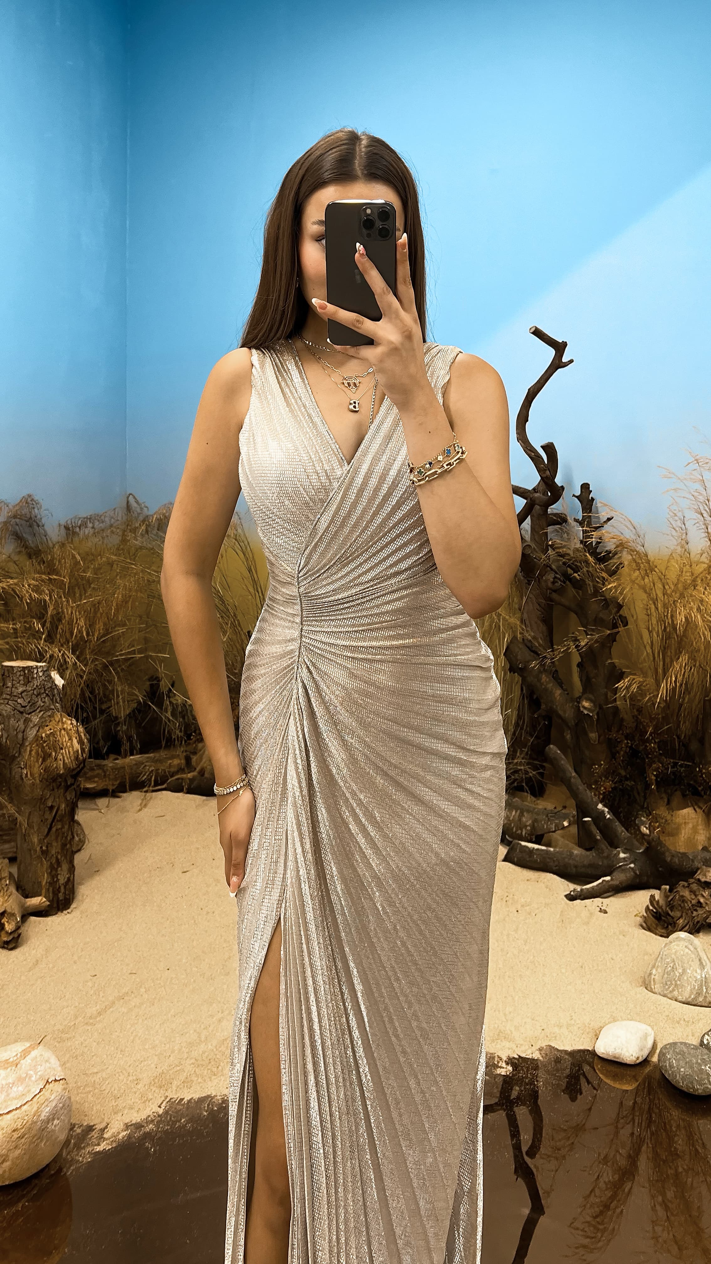 • Gümüş V Yaka Taş Detay Abiye Elbise