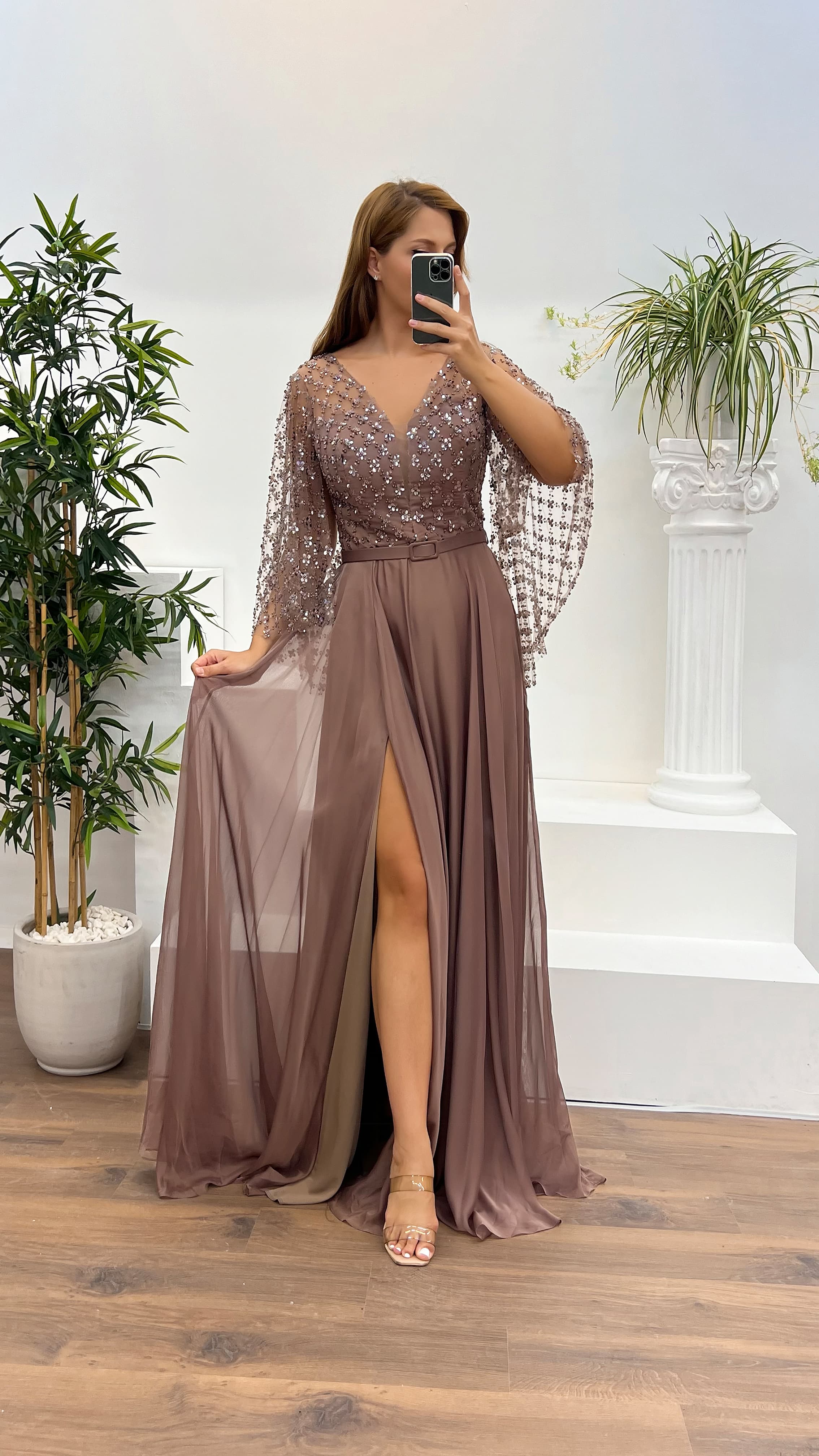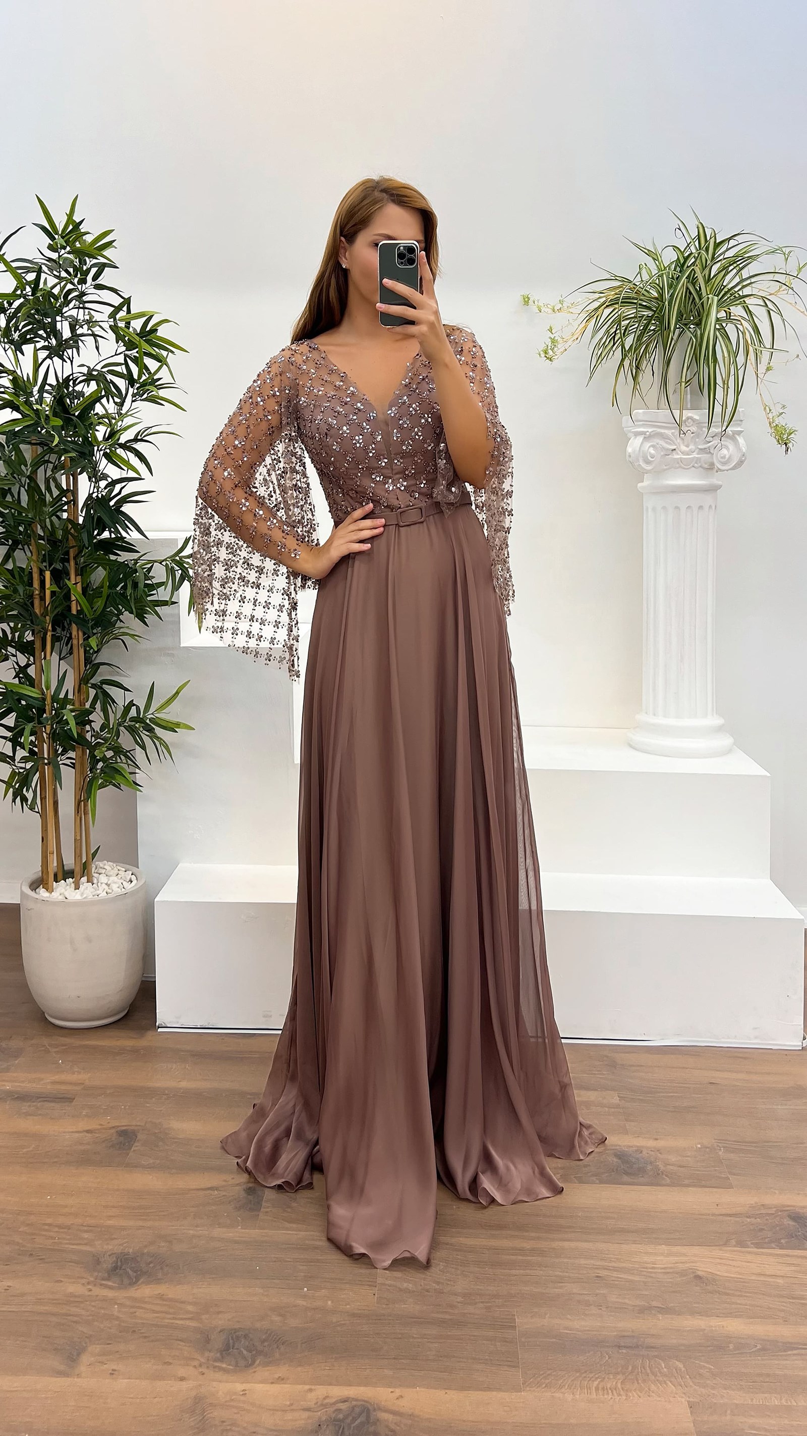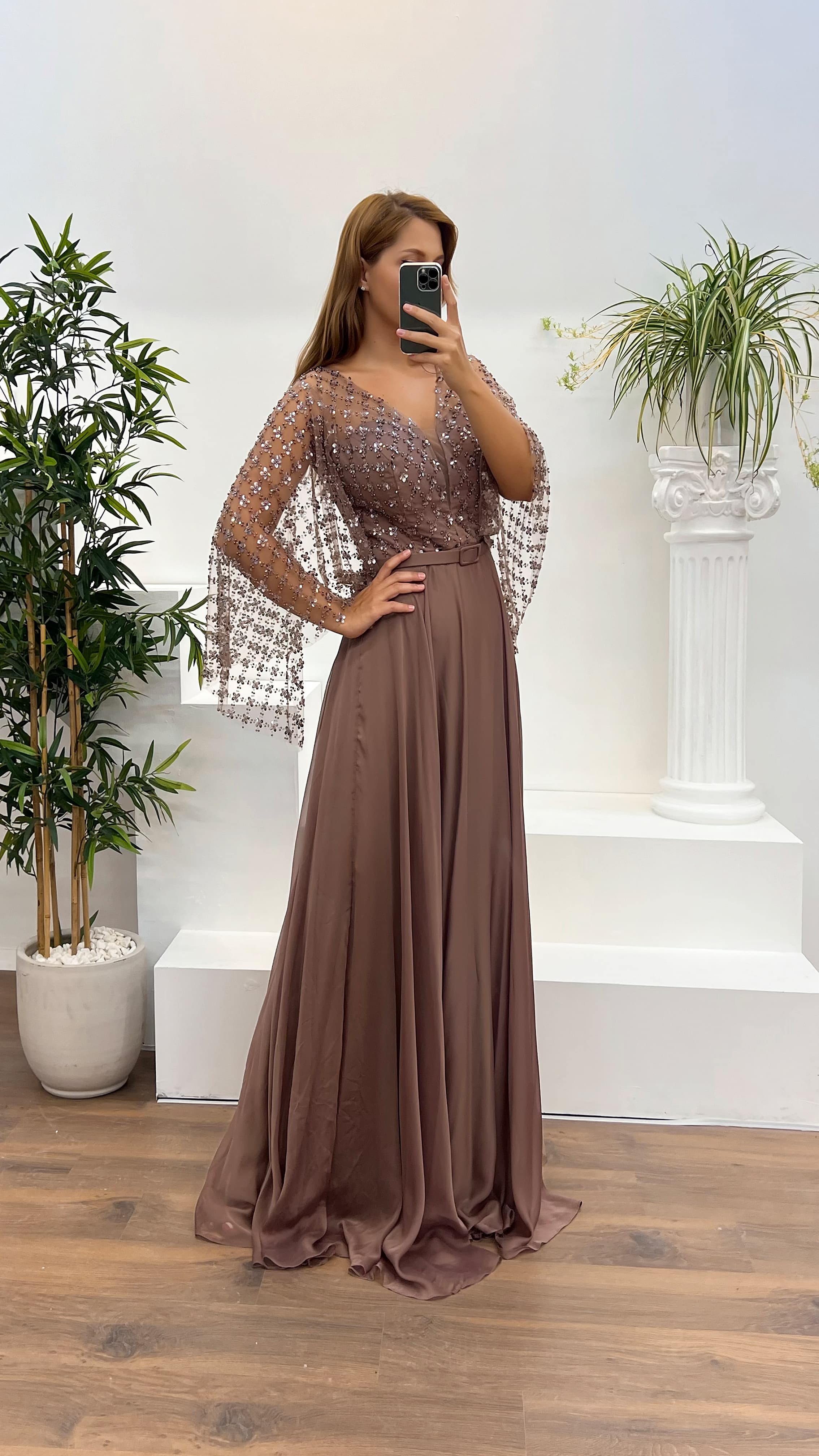Vizon Yarasa Kol İşlemeli Büyük Beden Abiye Elbise