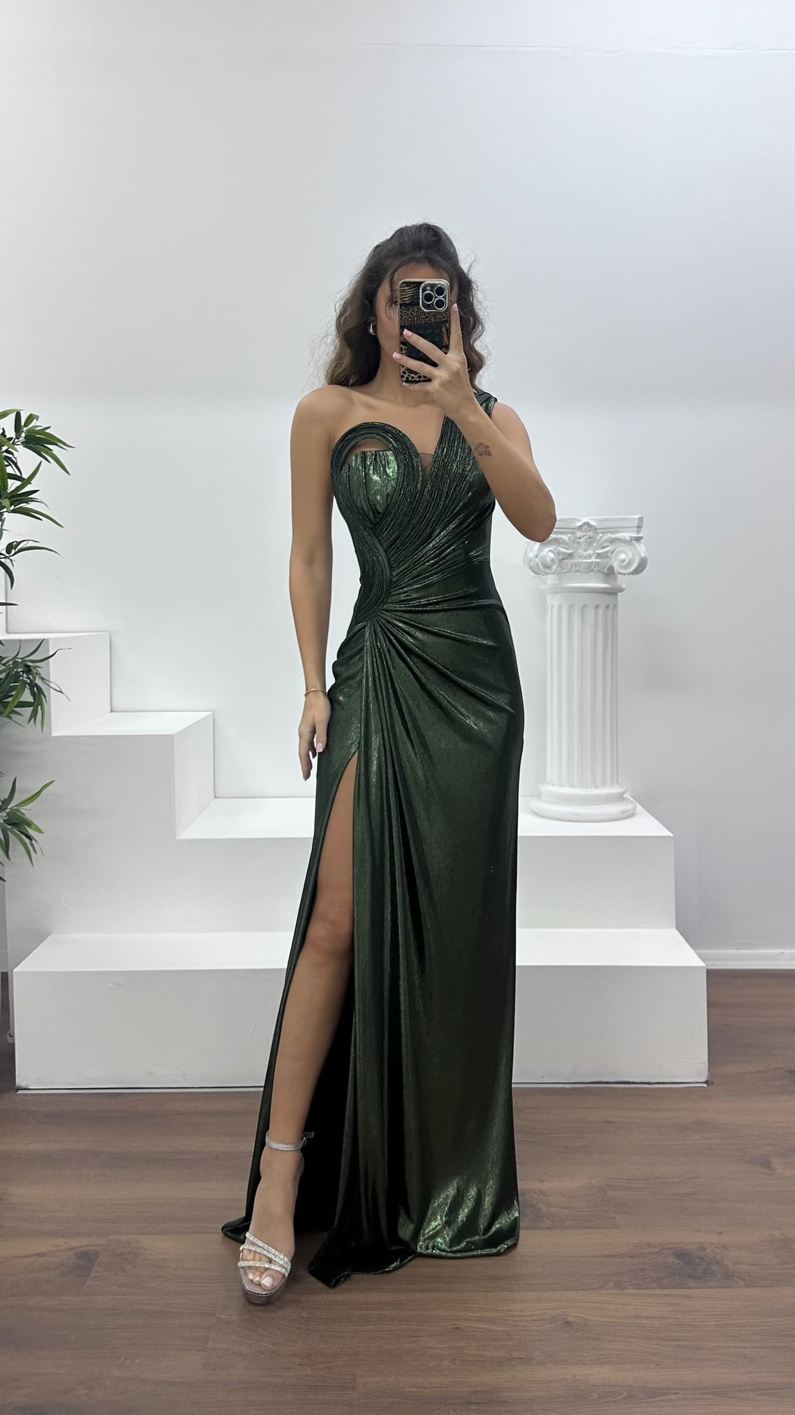 • Yağ Yeşili Straplez Metalik Abiye Elbise