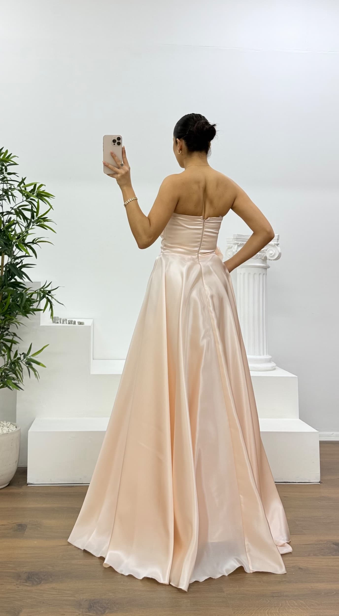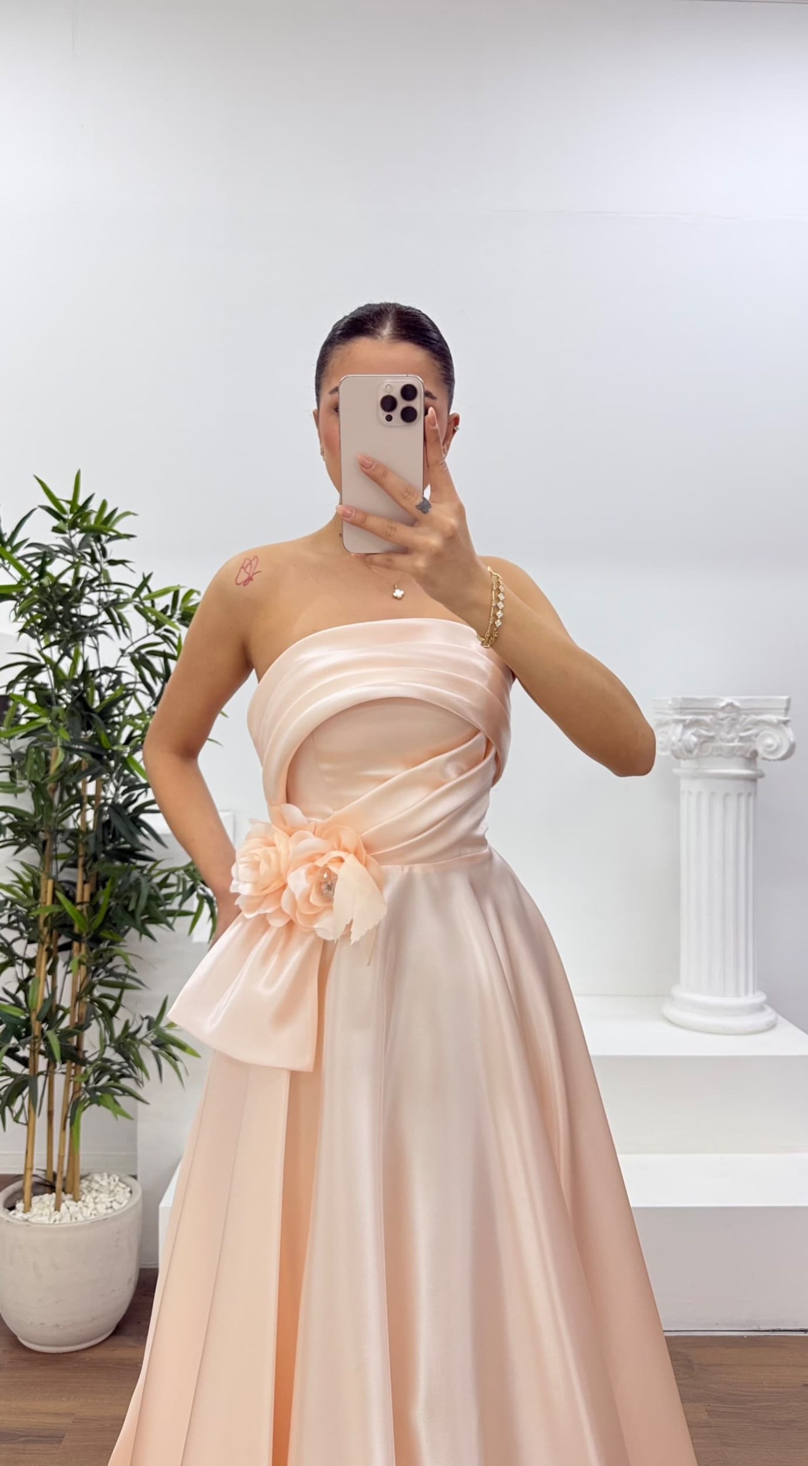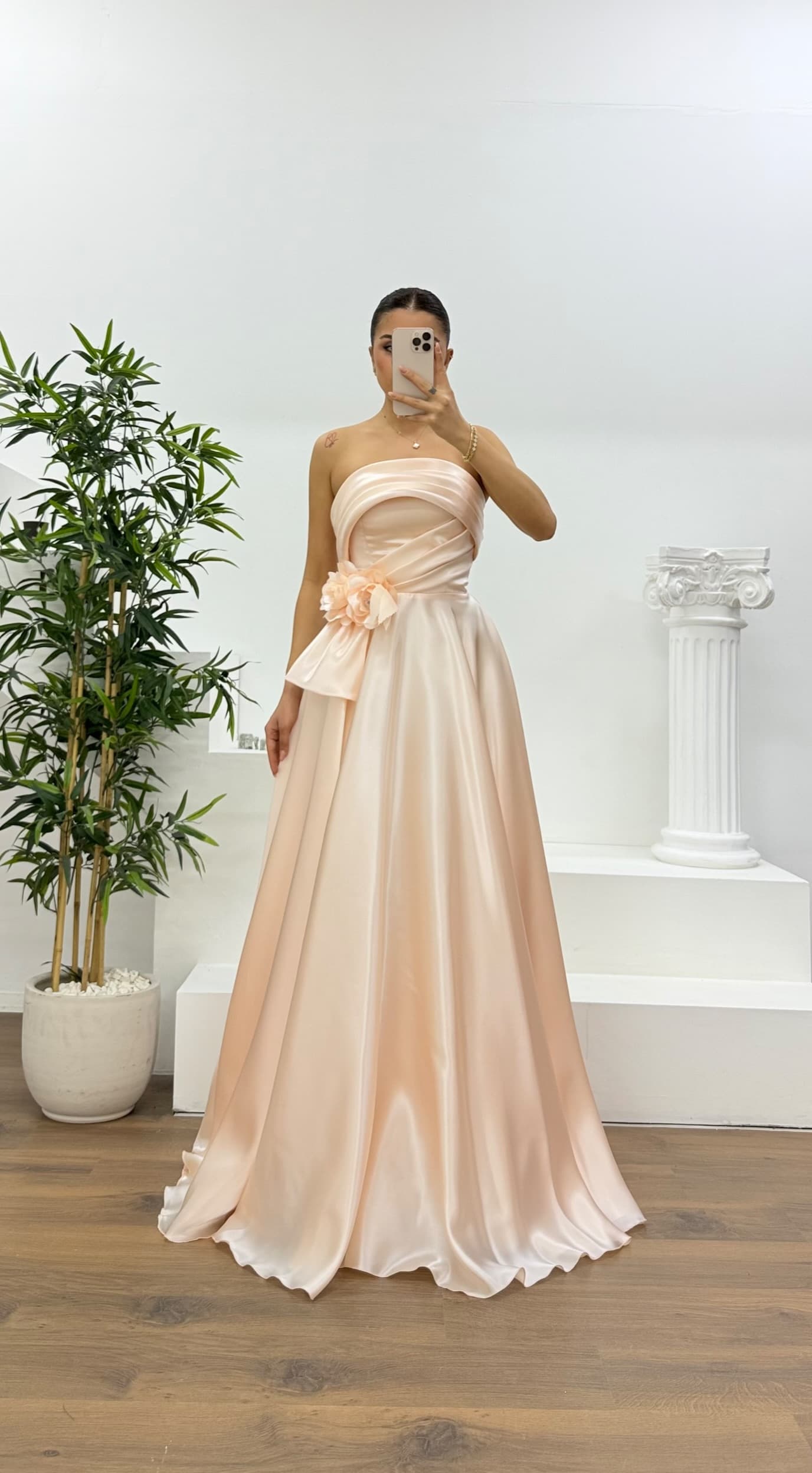 Ürün 36-42 bedene kadar uyumldur. göğüs pedli, astarlı, arka kapama fermuar, çiçek detay, drapeli, straplez abiye olarak tasarlanmıştır.