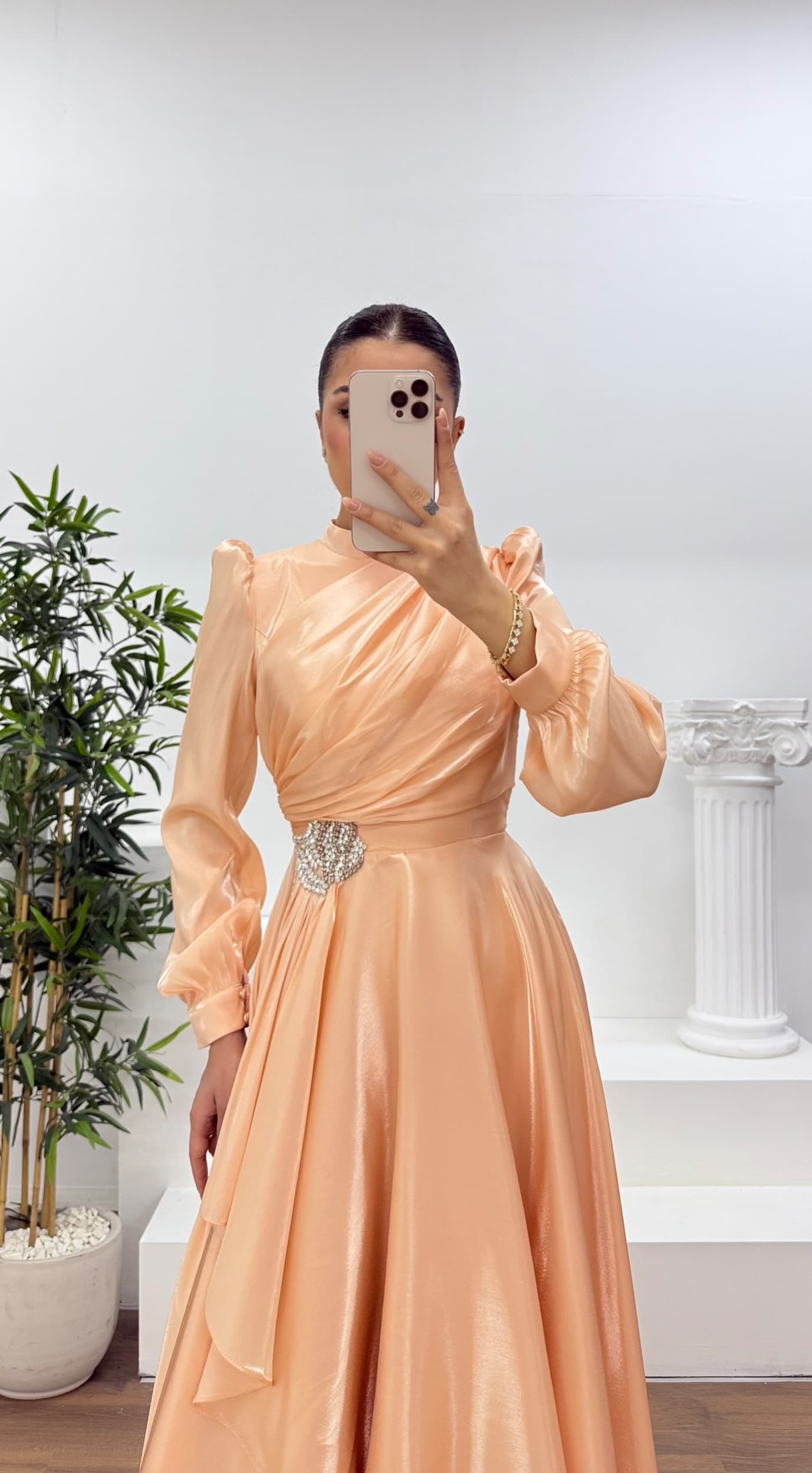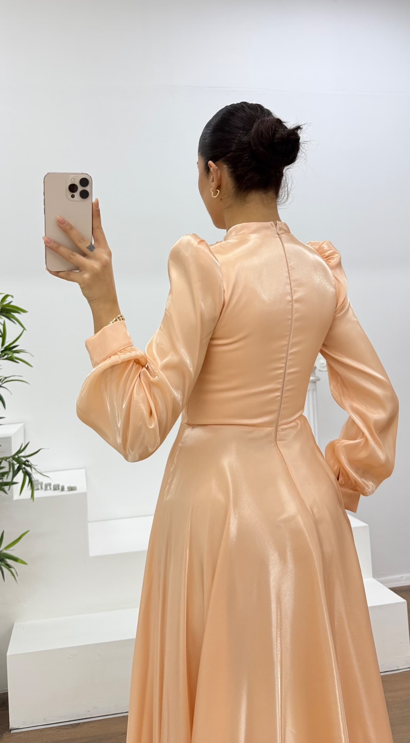 • Yavruağzı Janjan Gül Detaylı Tesettür Abiye Elbise