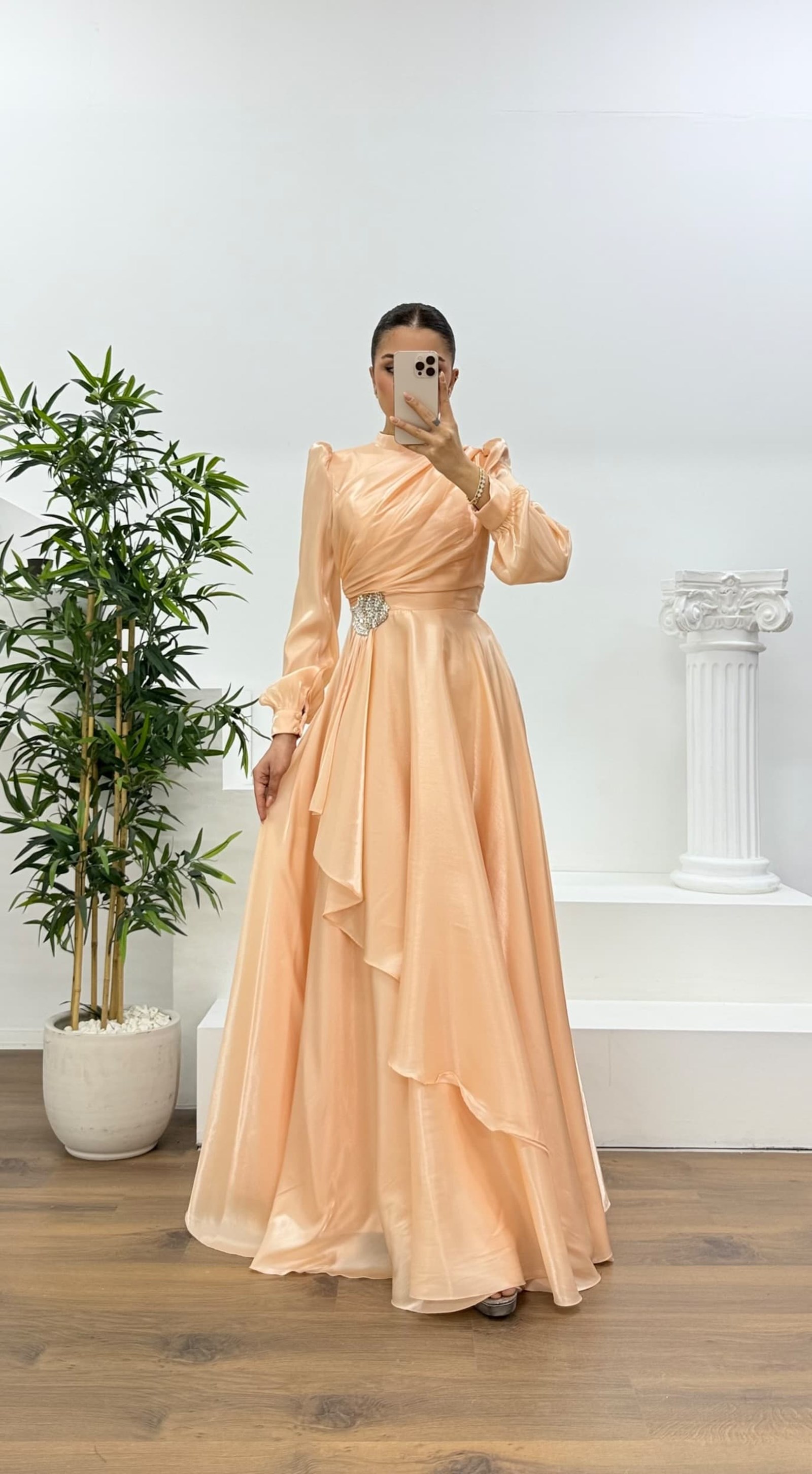 Yavruağzı Janjan Gül Detaylı Tesettür Abiye Elbise