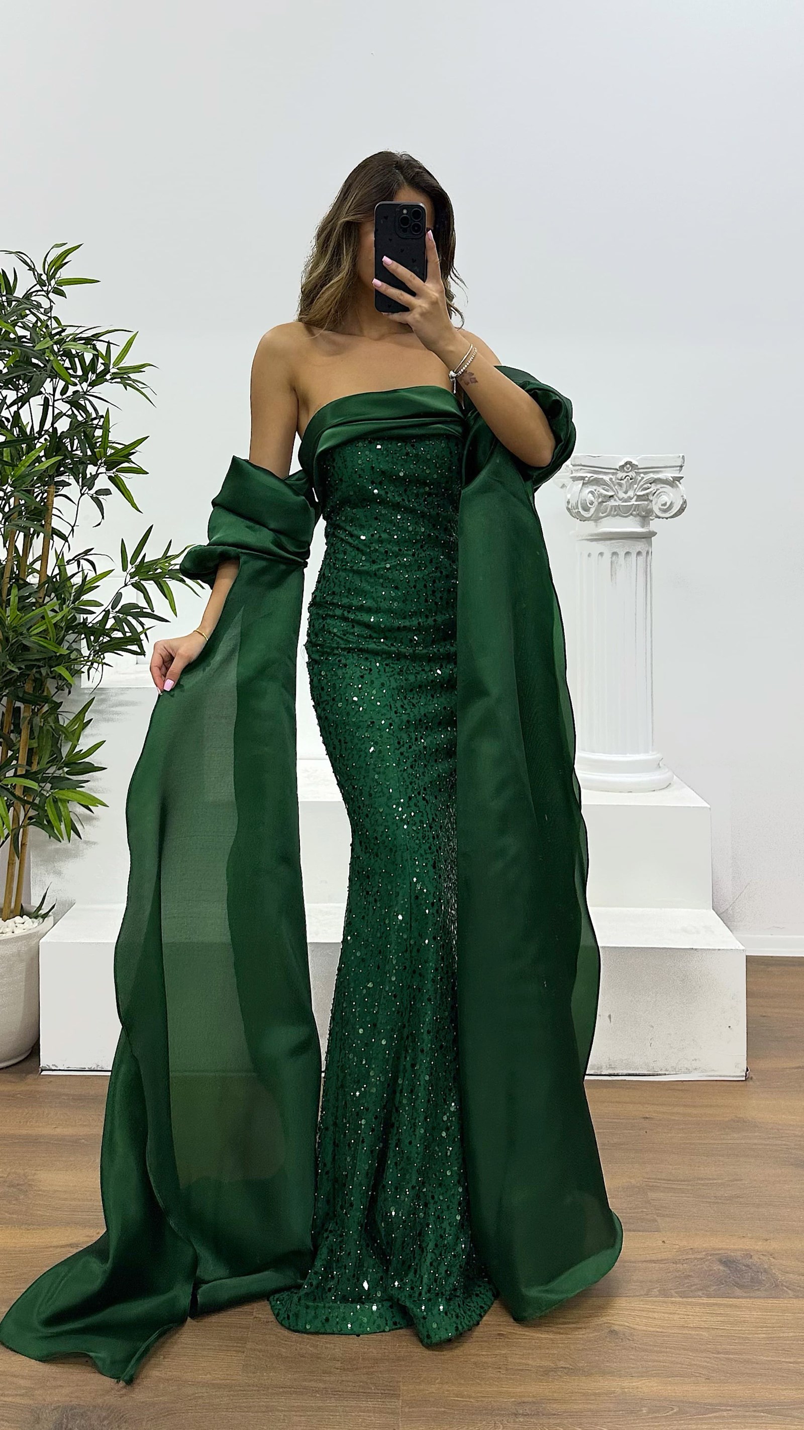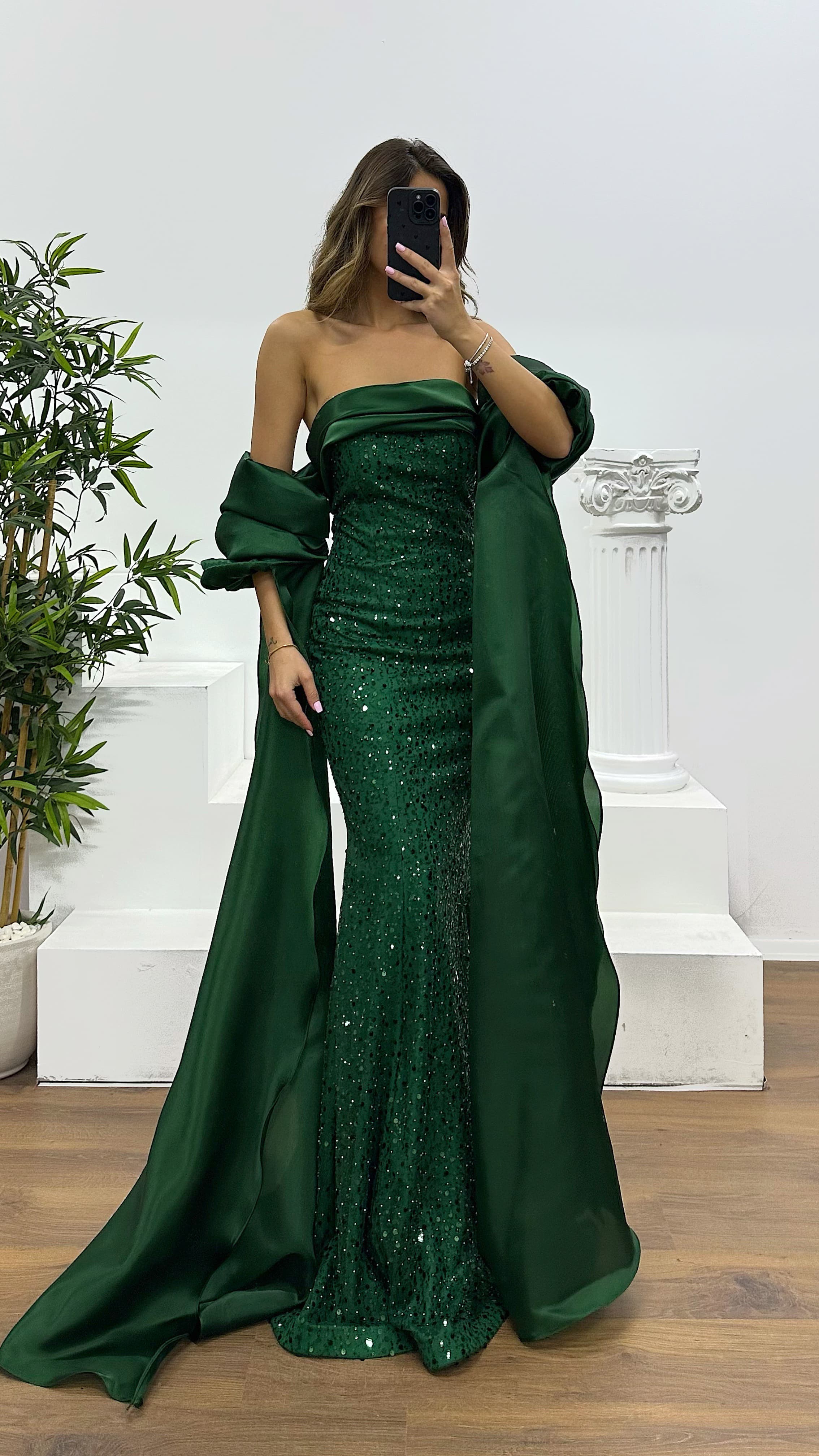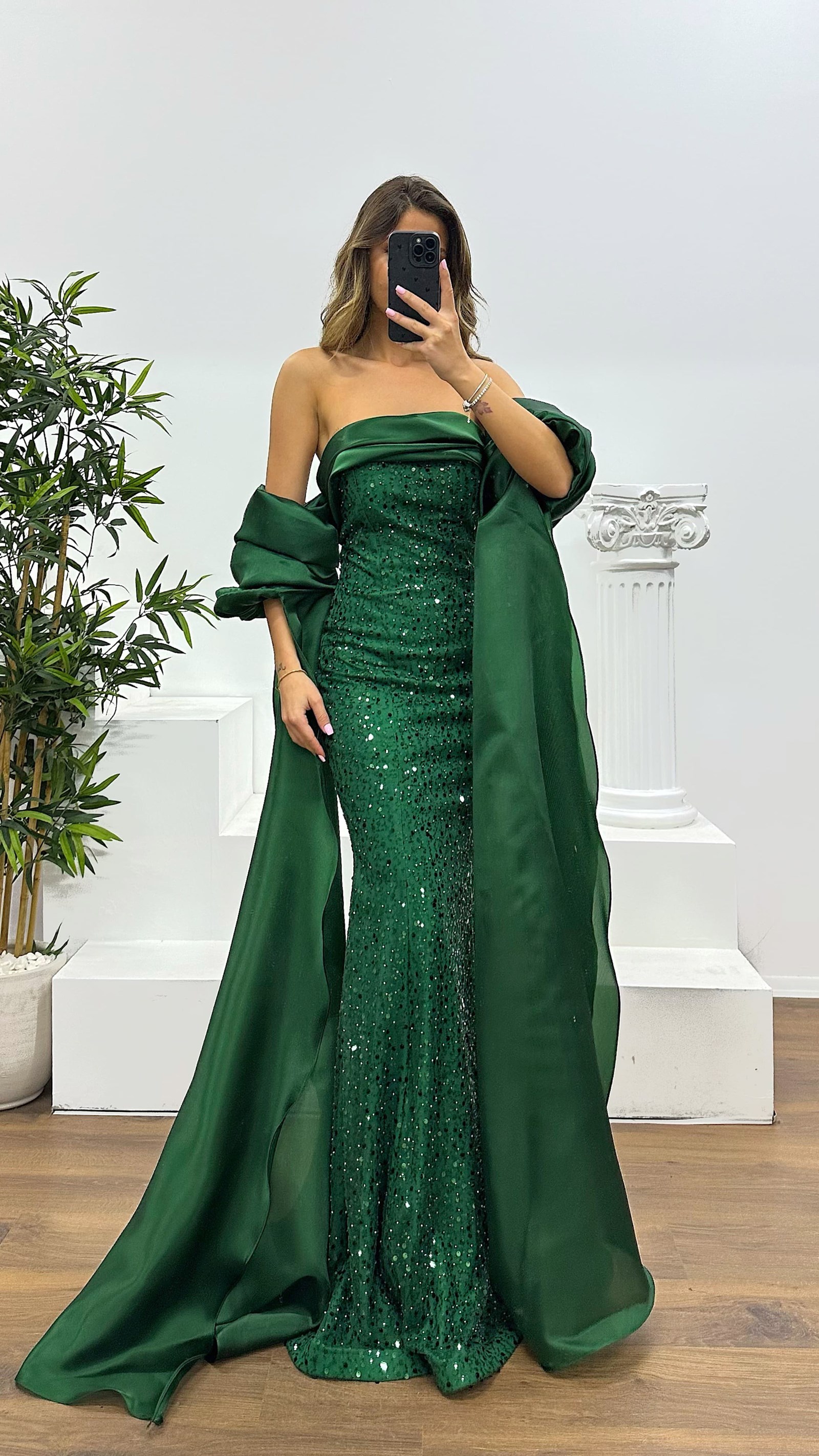 • Yeşil Balon Kol İşlemeli Abiye Elbise