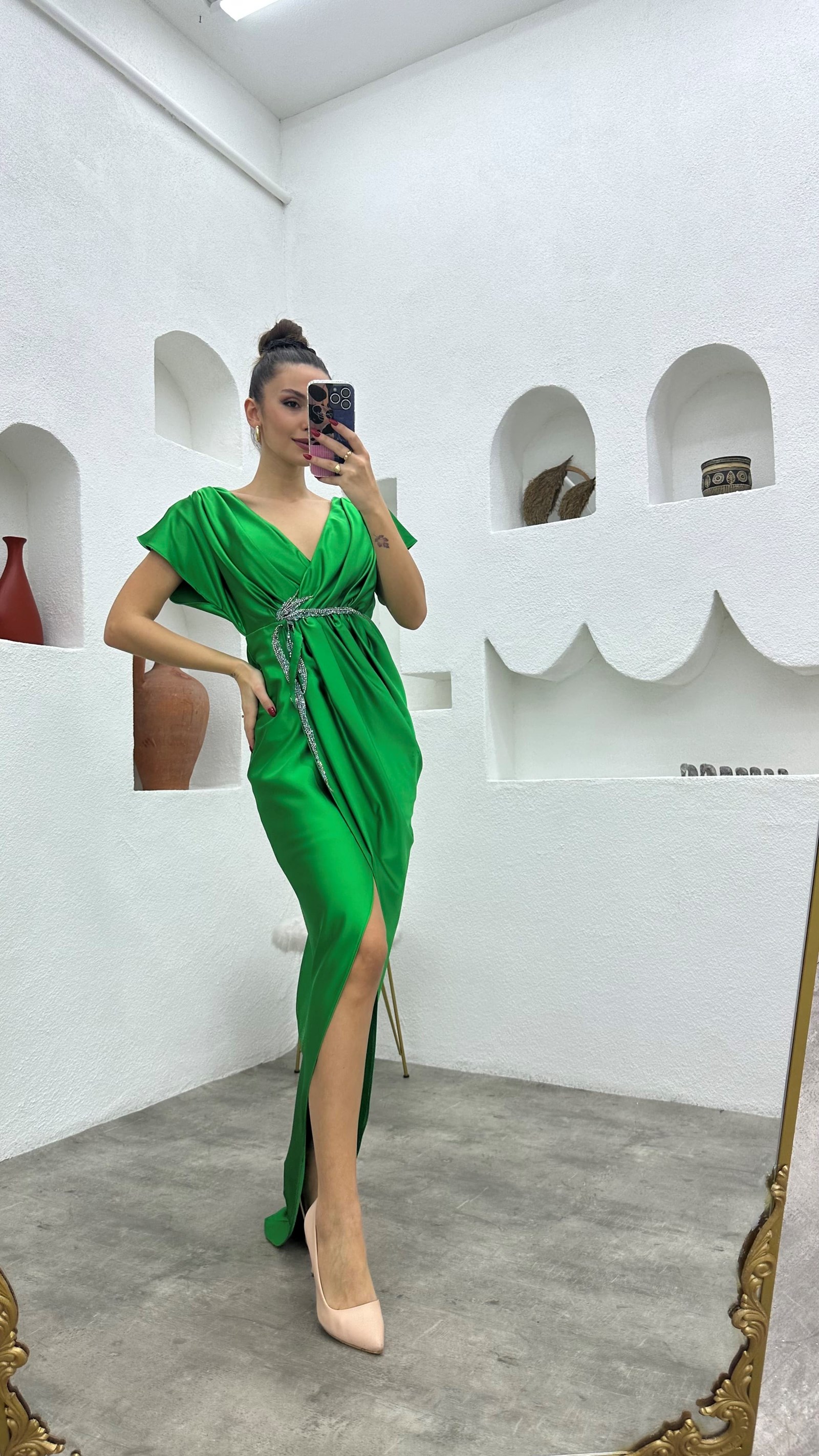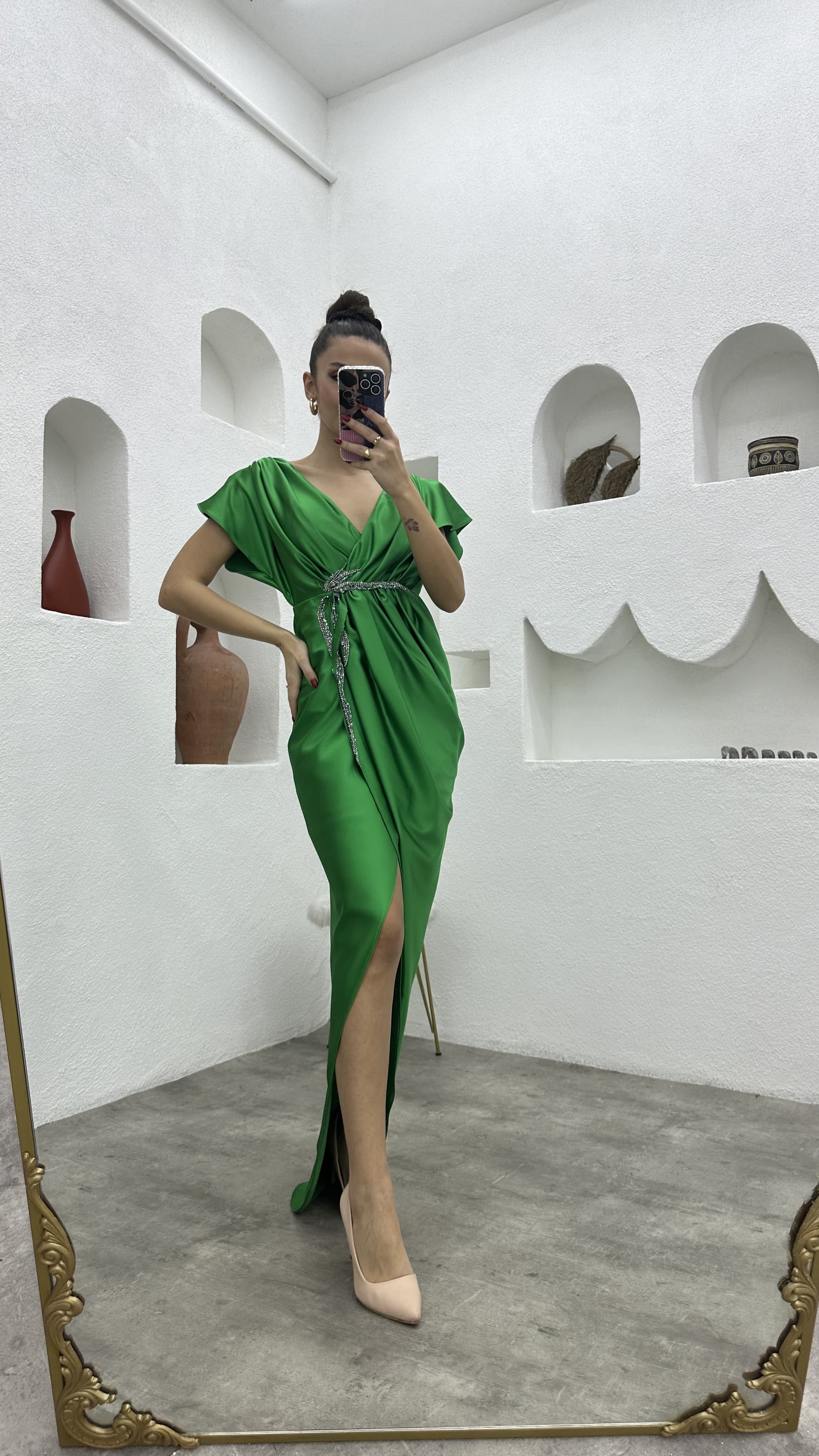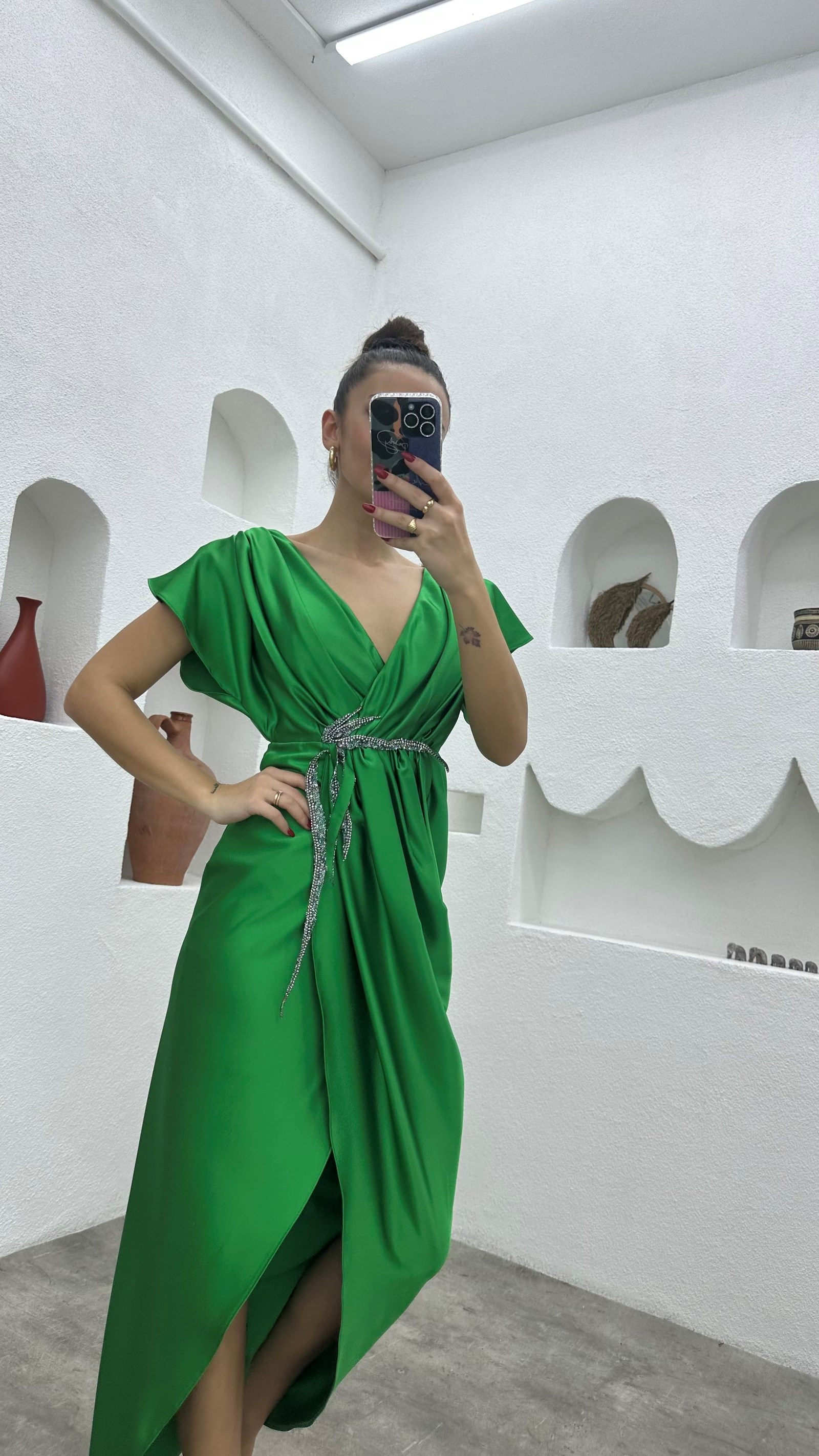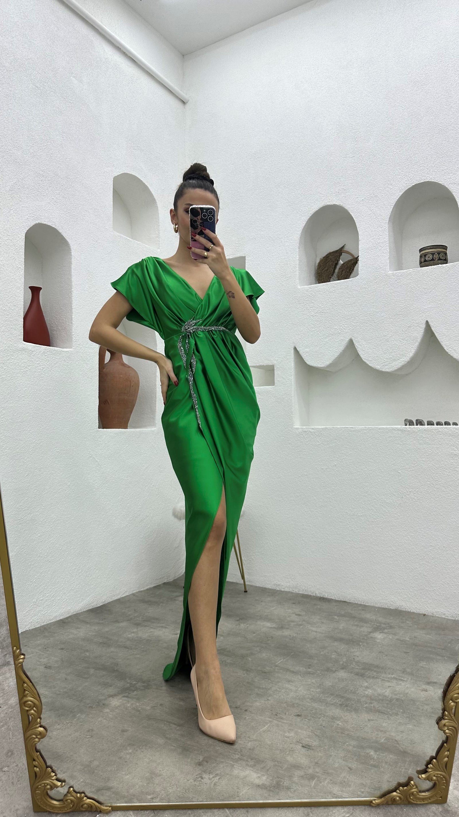 • Yeşil Broşlu Saten Abiye Elbise