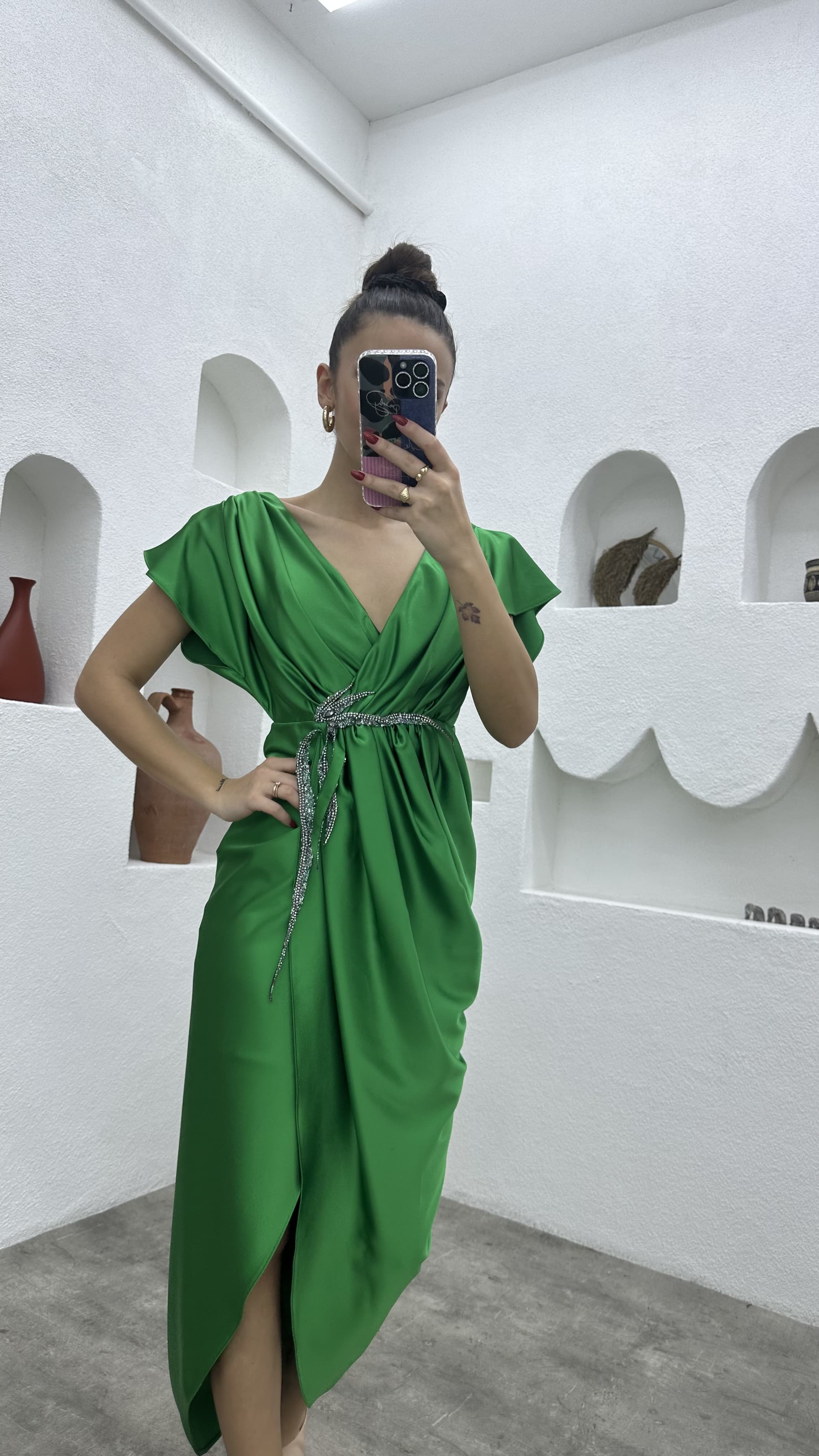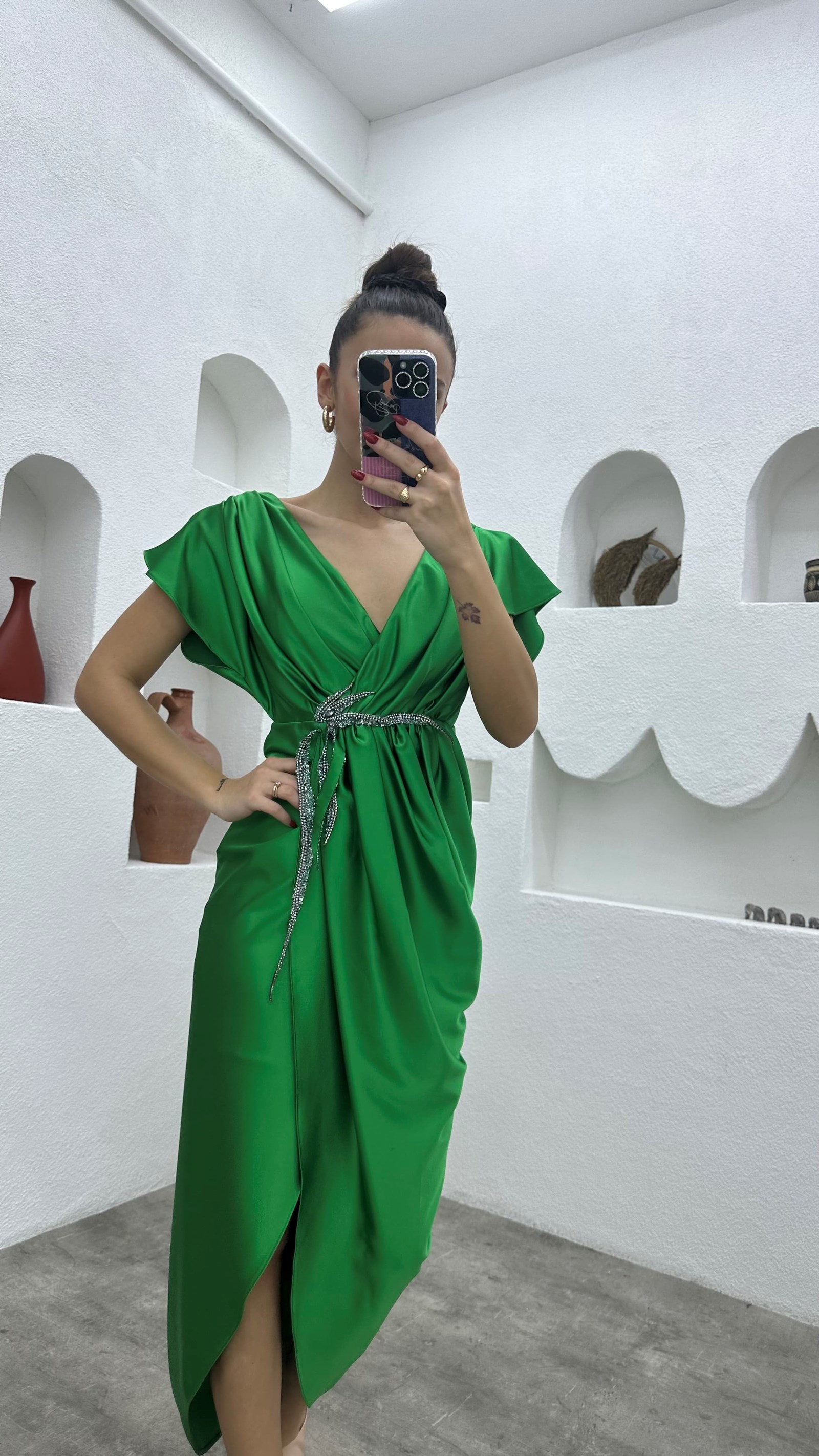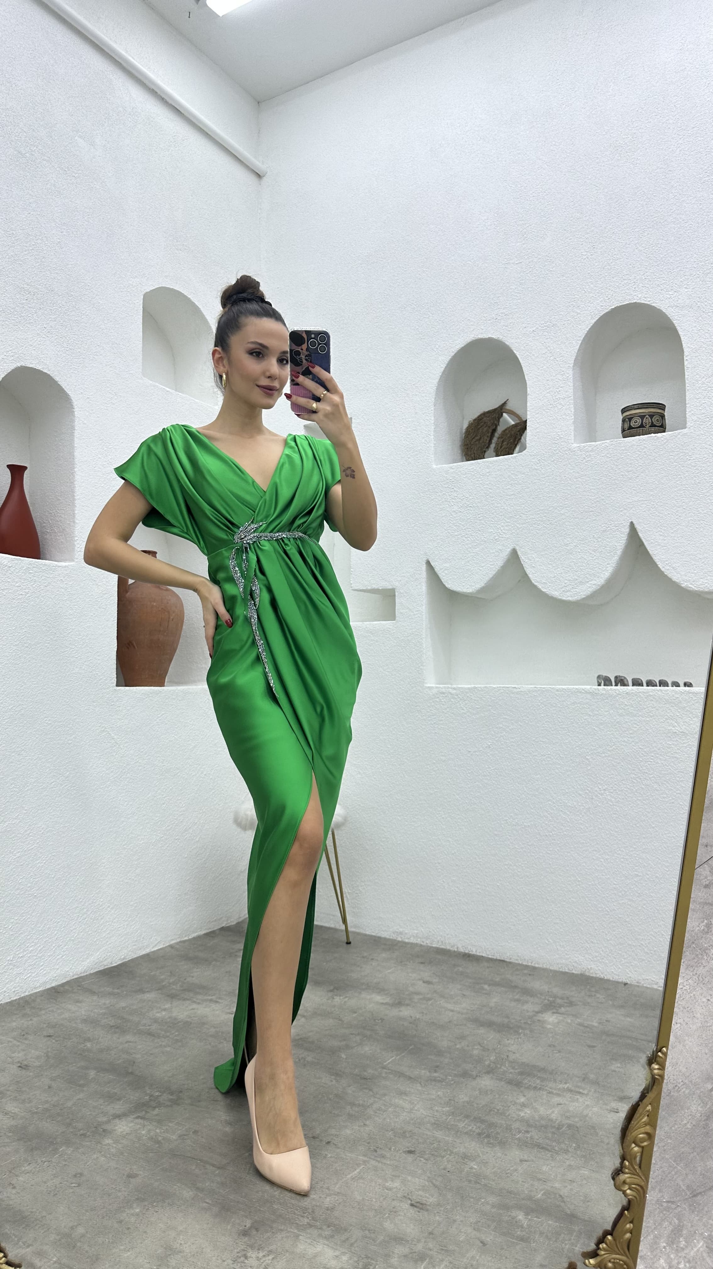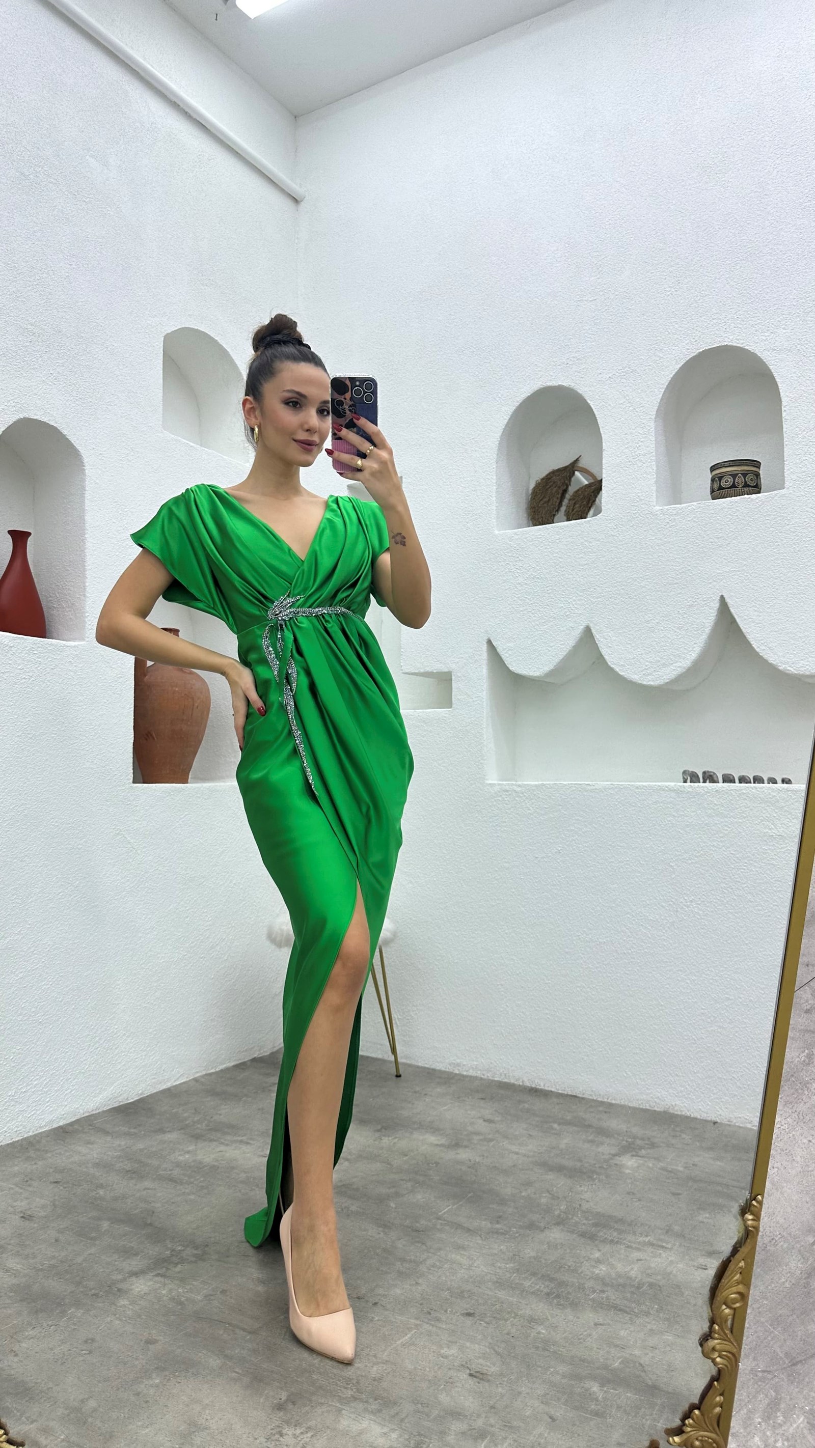 • Yeşil Broşlu Saten Abiye Elbise