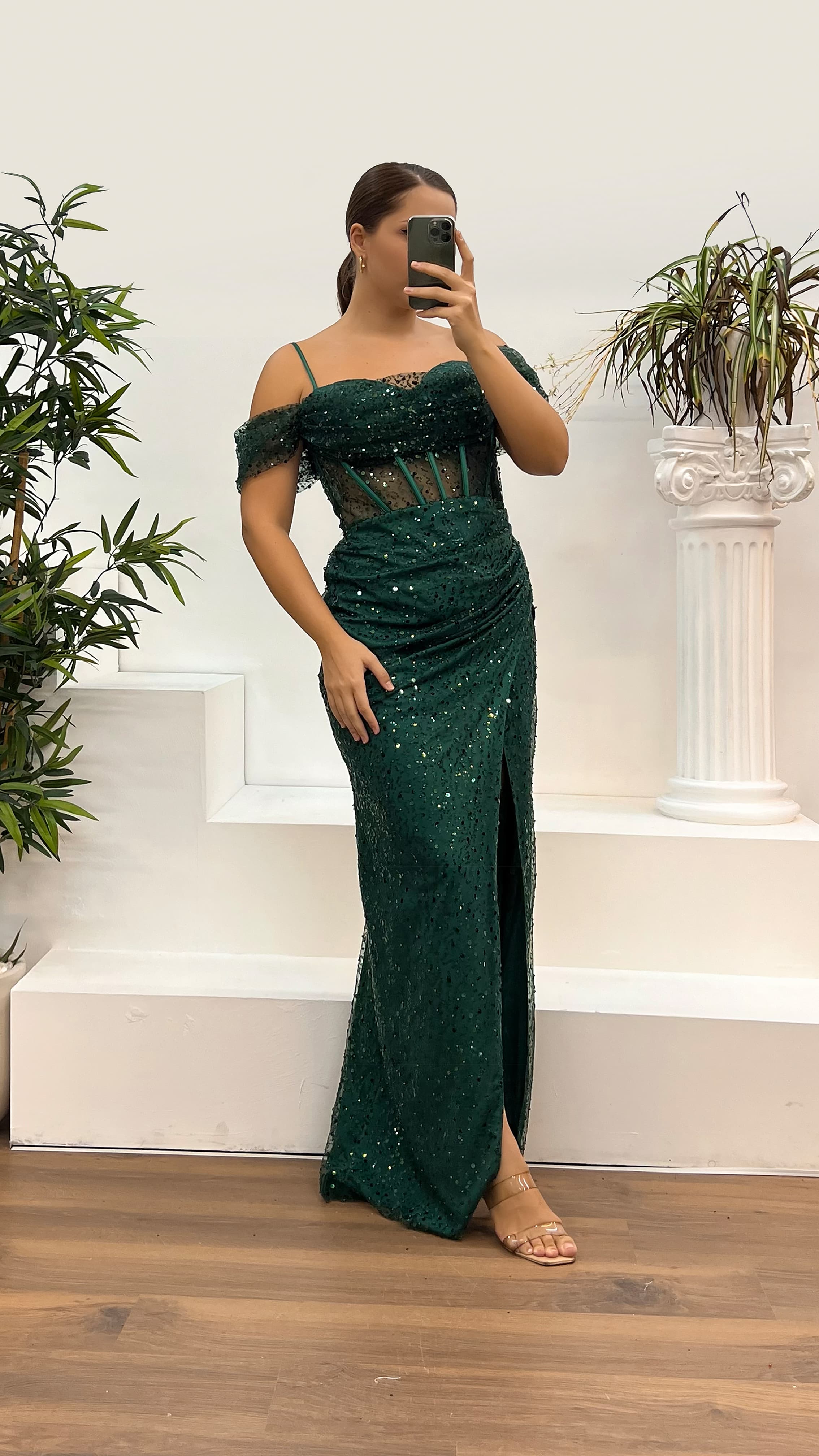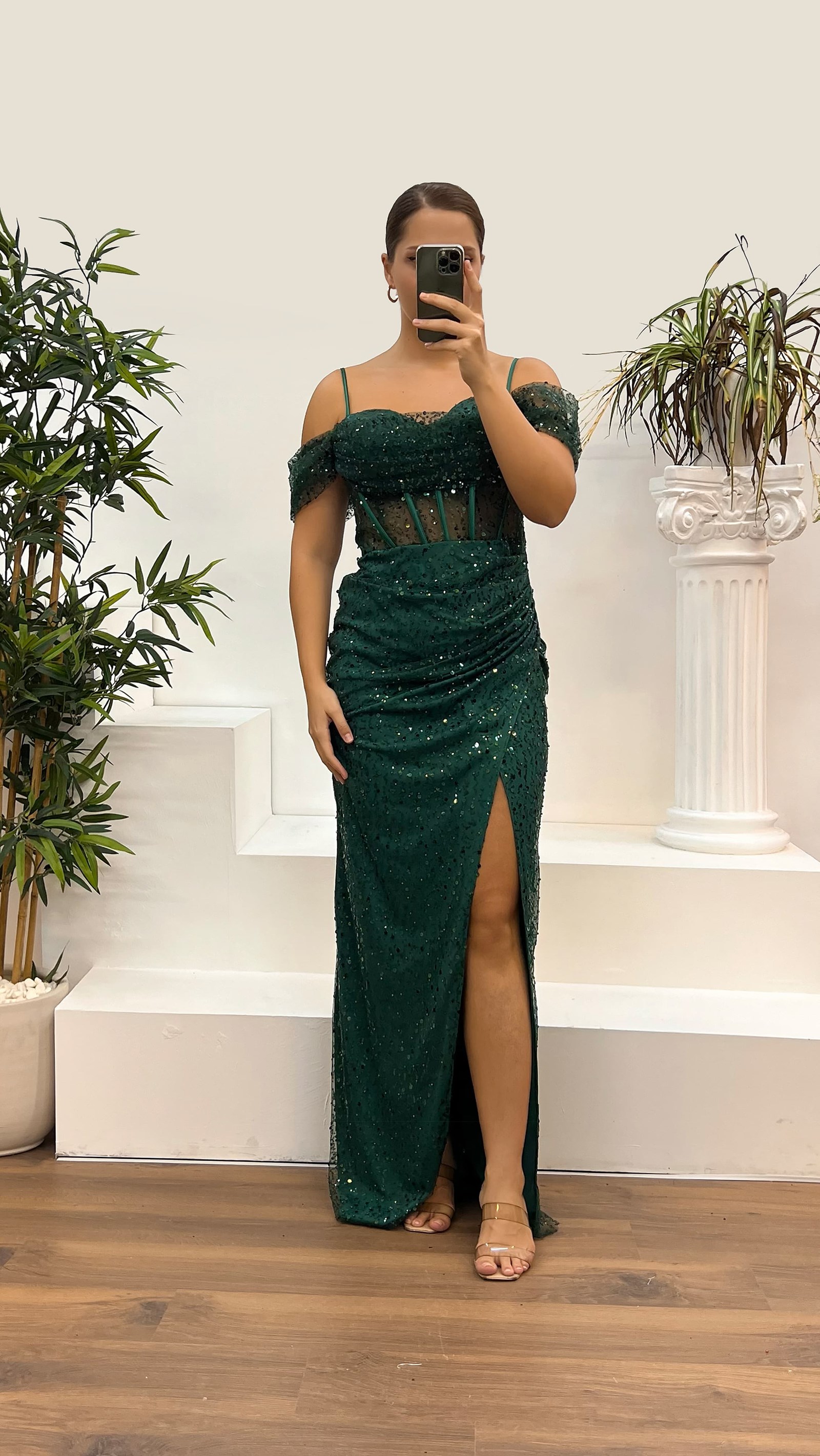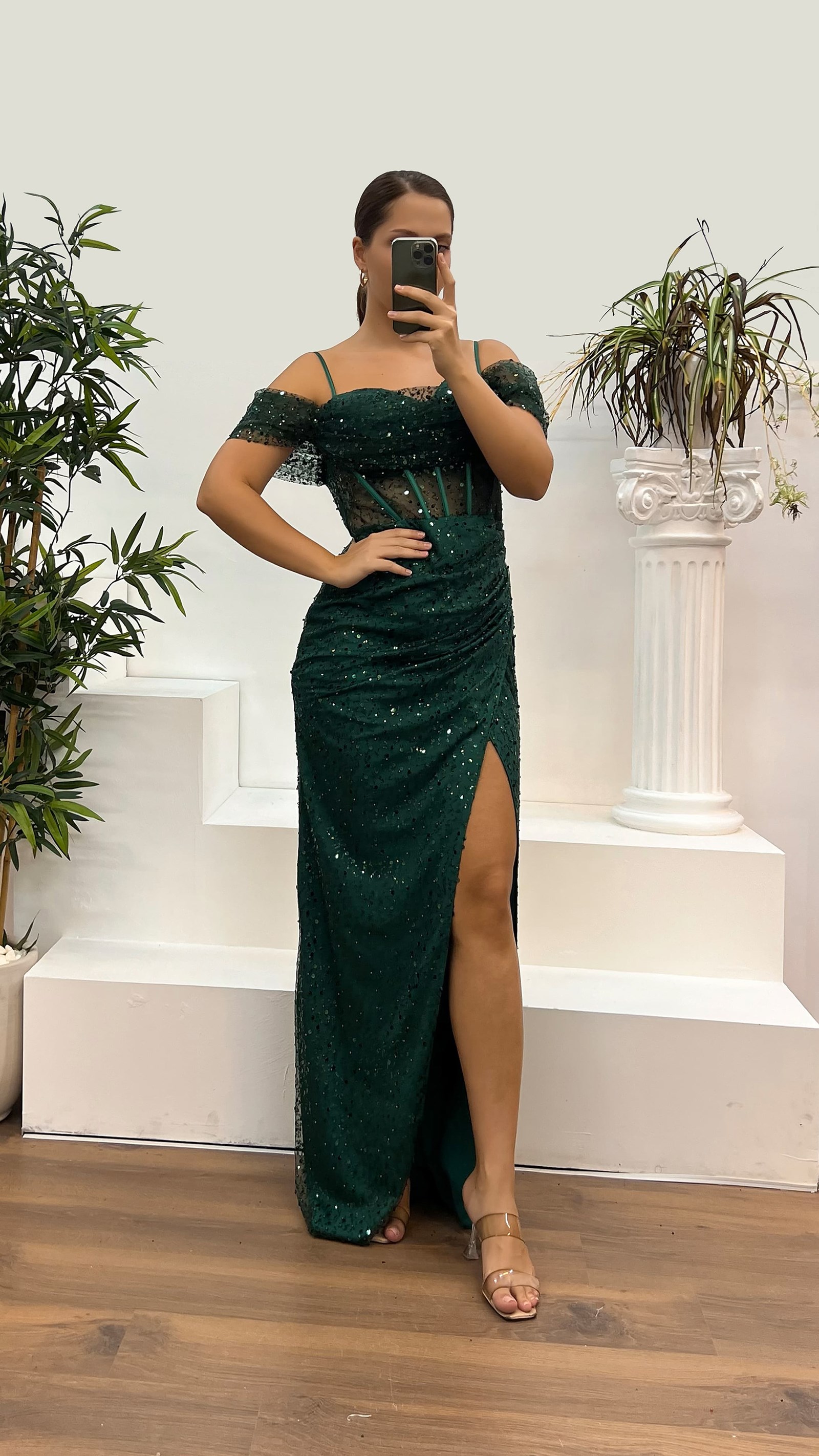 • Yeşil İp Askılı Büyük Beden Pul Payet Abiye Elbise