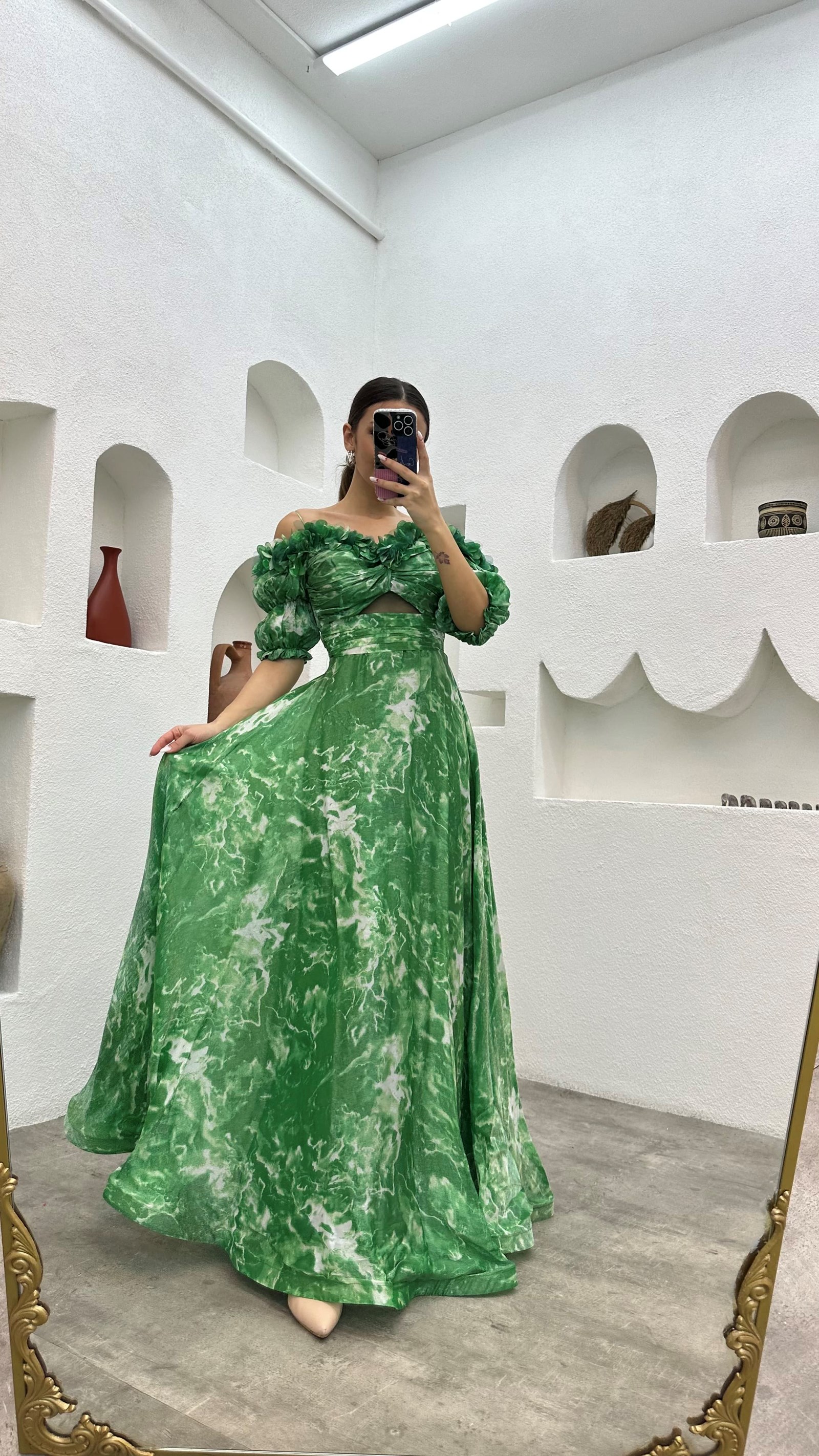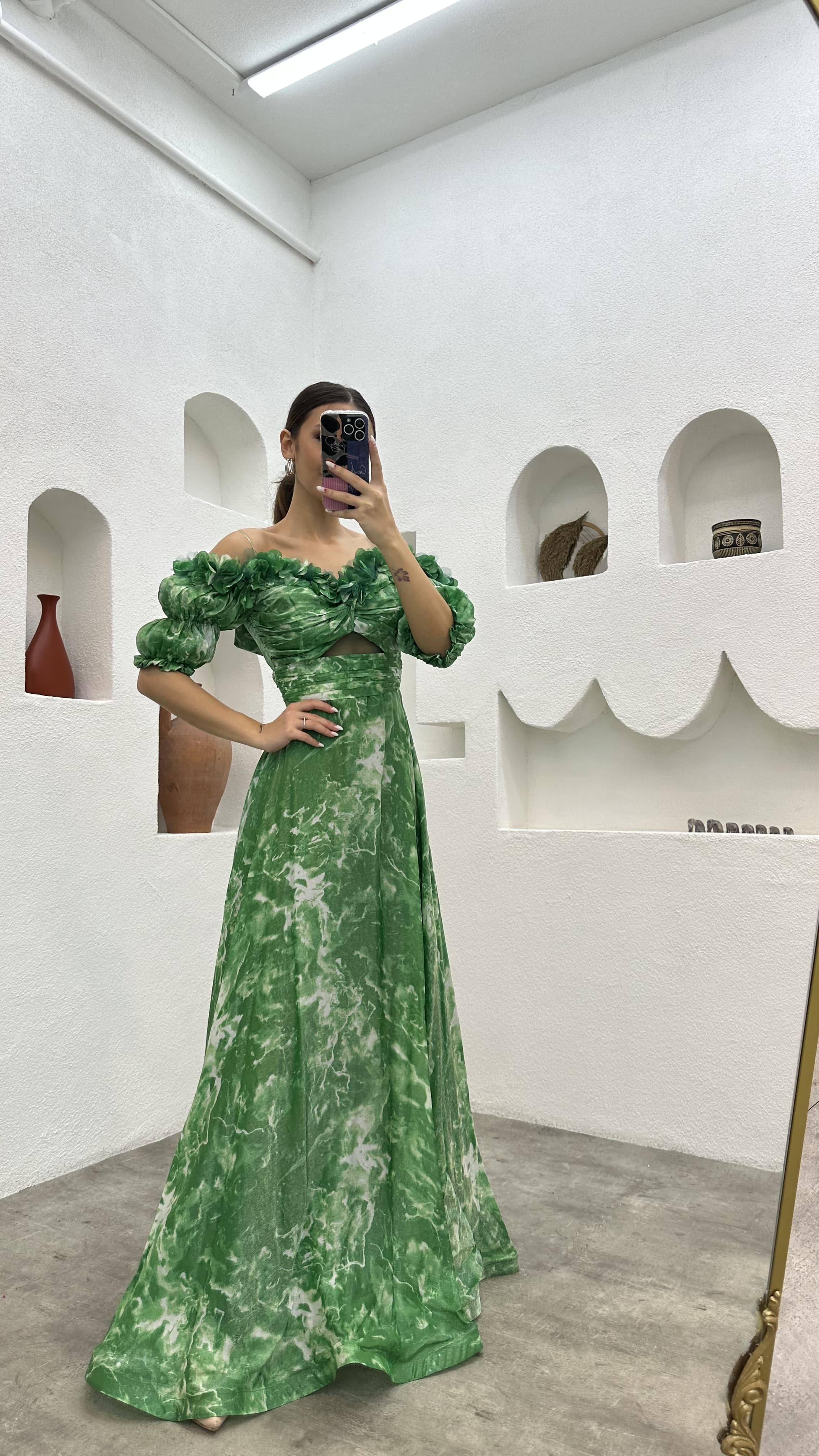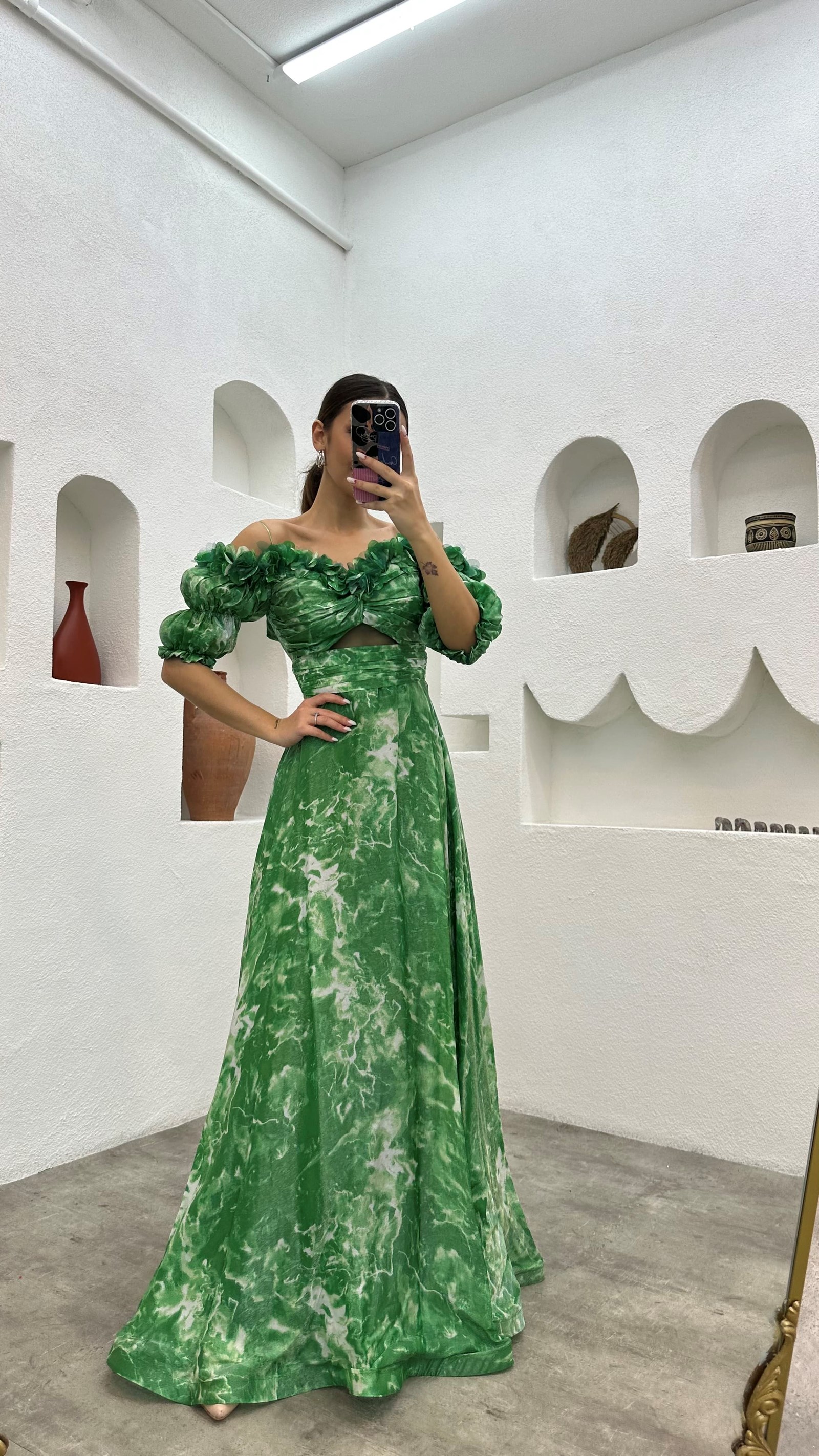 Yeşil İp Askılı Volanlı Desenli Abiye Elbise