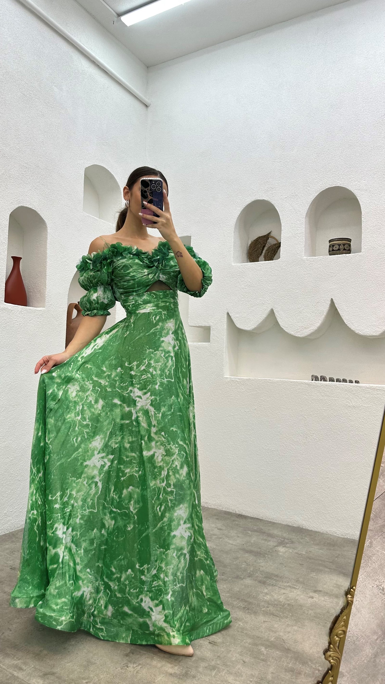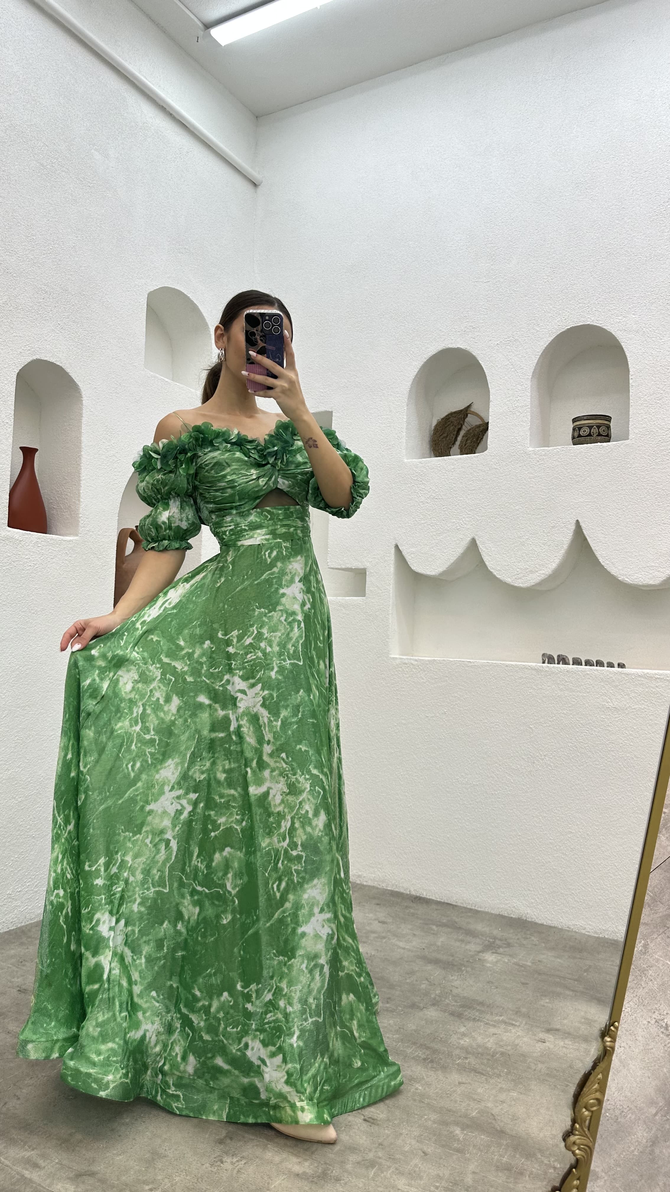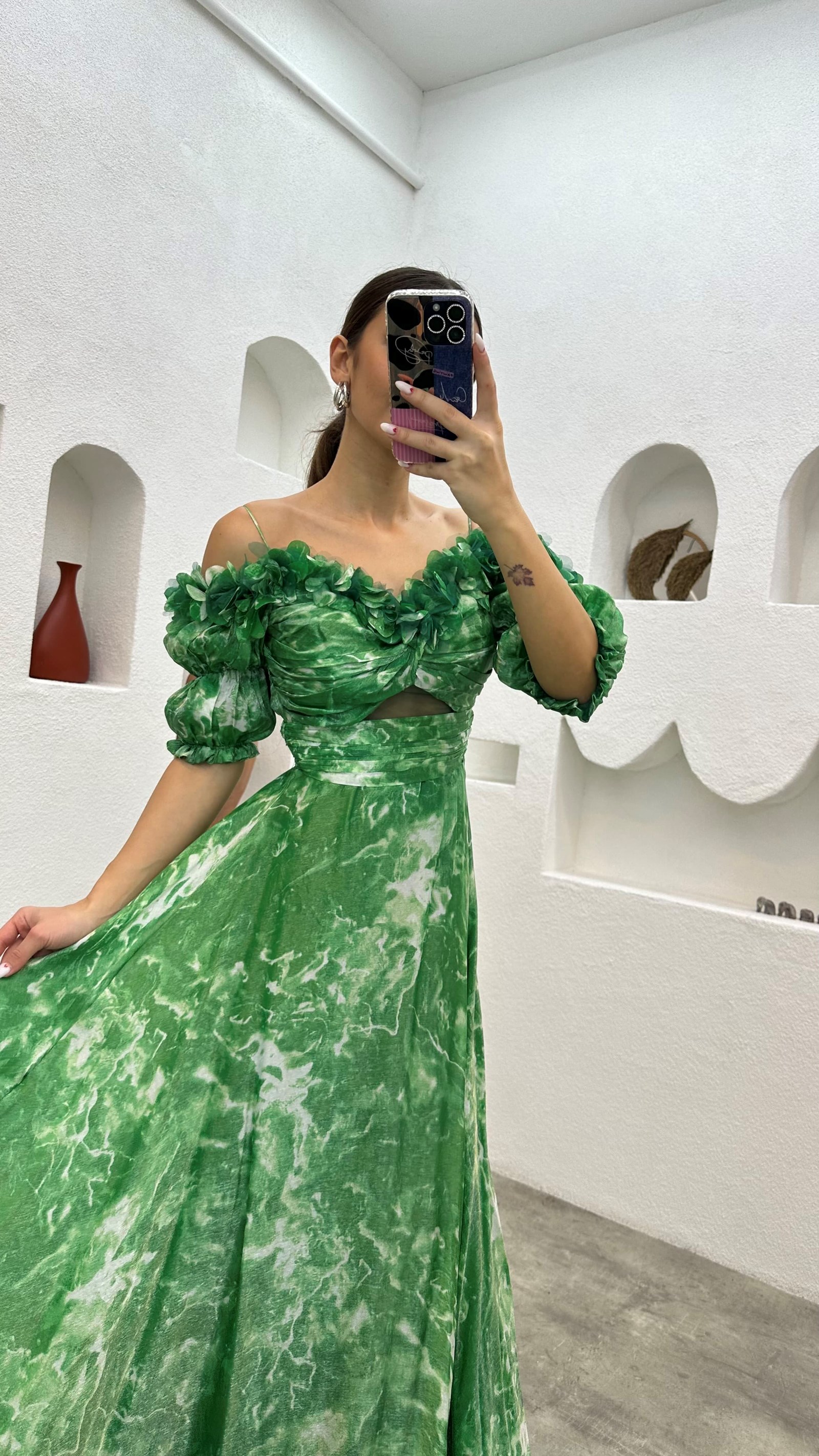 Yeşil İp Askılı Volanlı Desenli Abiye Elbise