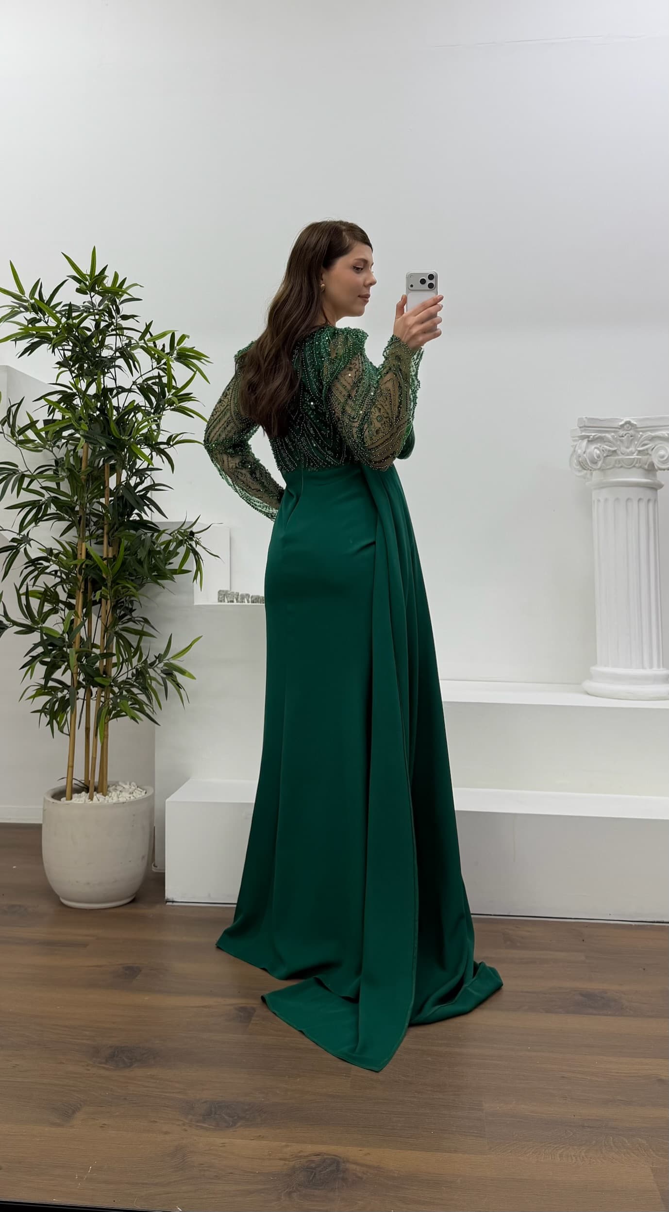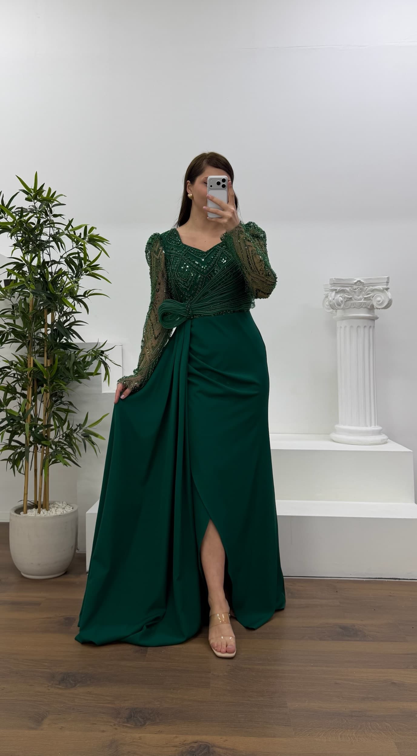 Yeşil İşlemeli  Bel Detaylı Şifon Büyük Beden  Abiye Elbise