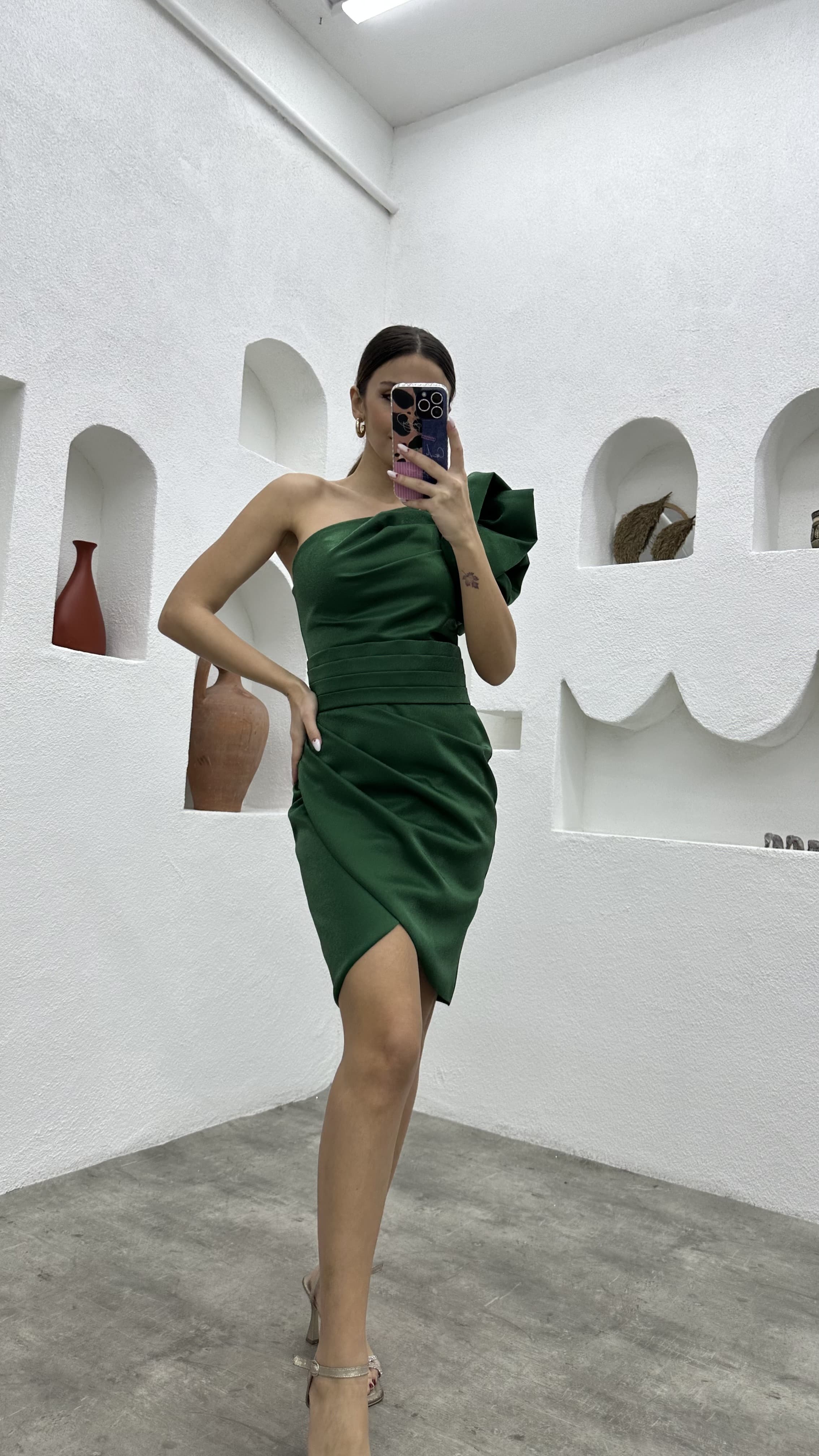 • Yeşil Kolu Volanlı Tek Omuz Abiye Elbise