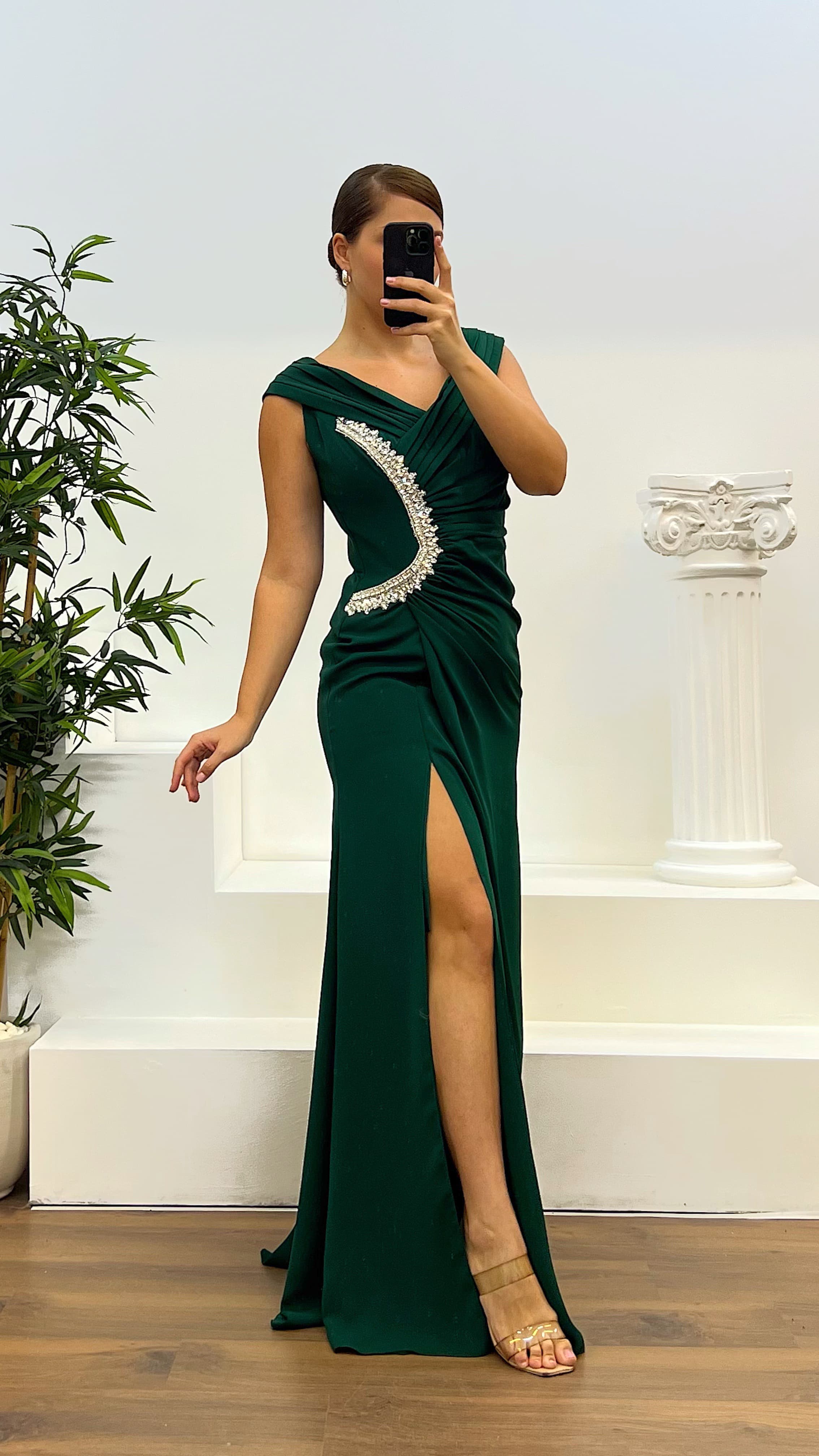 Ürün 44-48 bedene kadar uyumlu, göğüs pedli, astarlı, arka kapama fermuar, yırtmaçlı, işlemeli abiye olarak tasarlanmıştır.