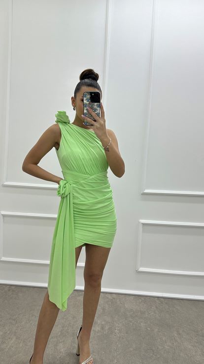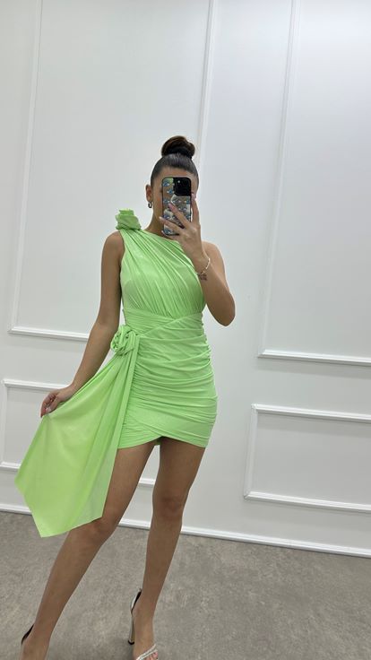Yeşil Tek Omuz Büzgü Detay Tasarım Elbise