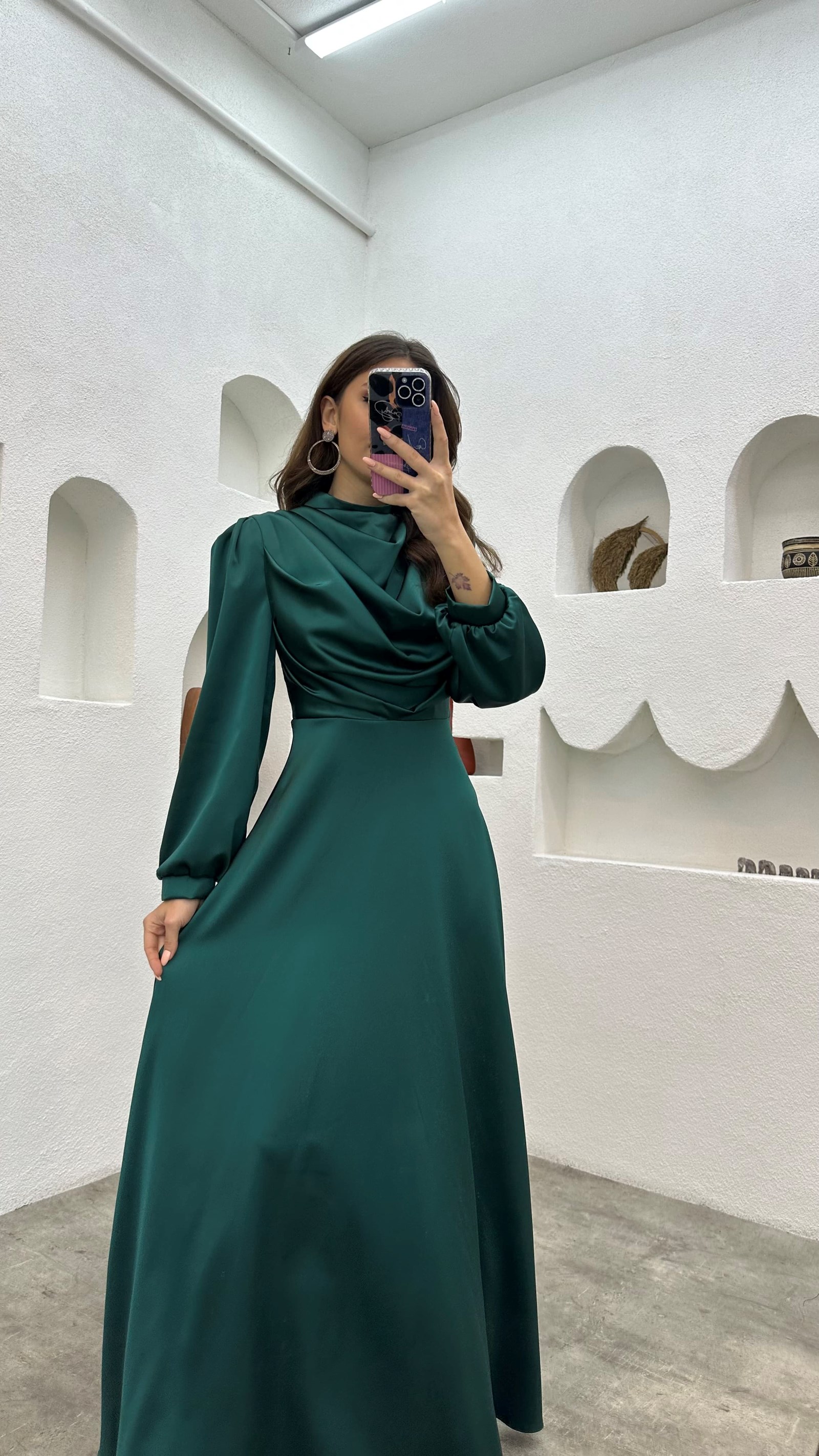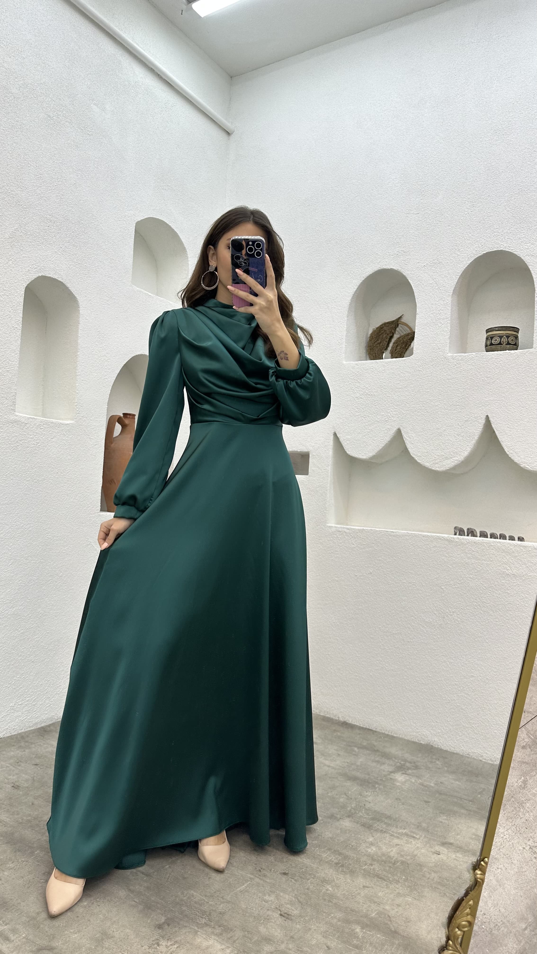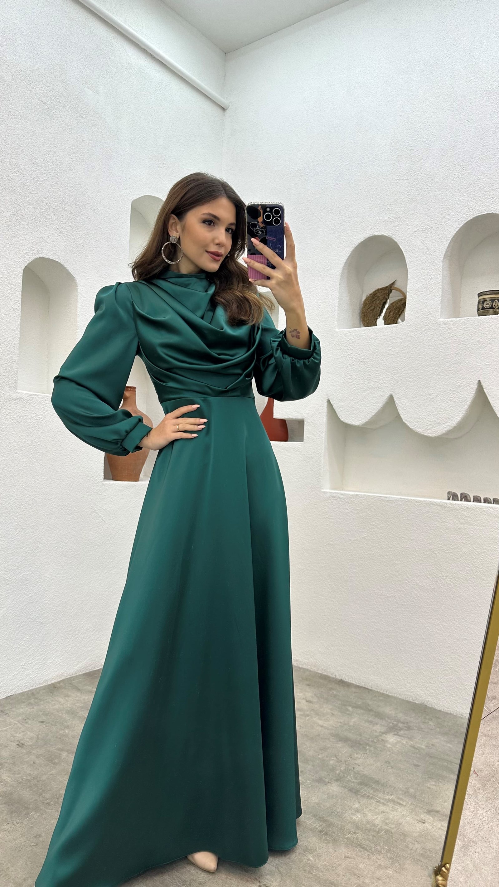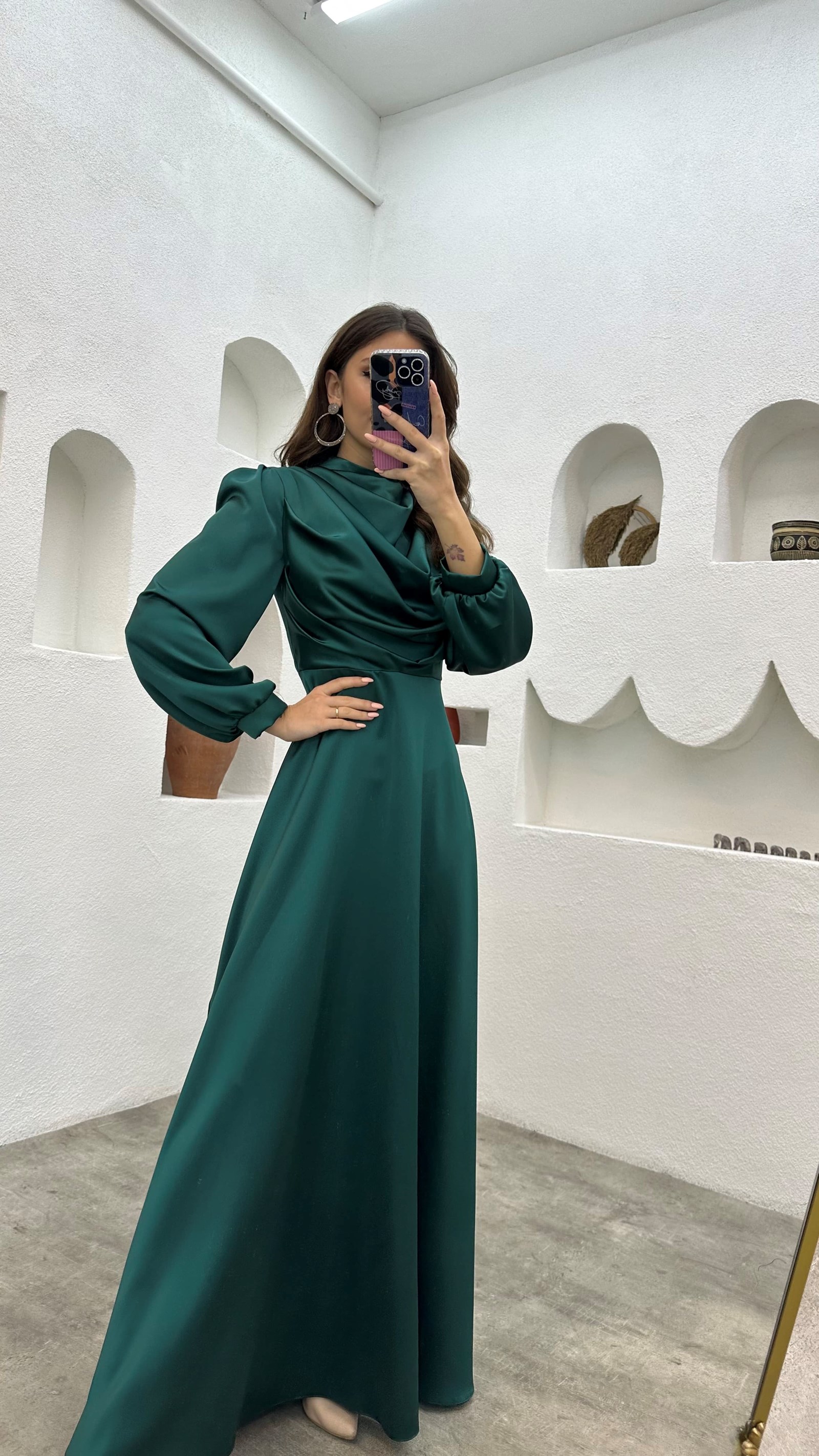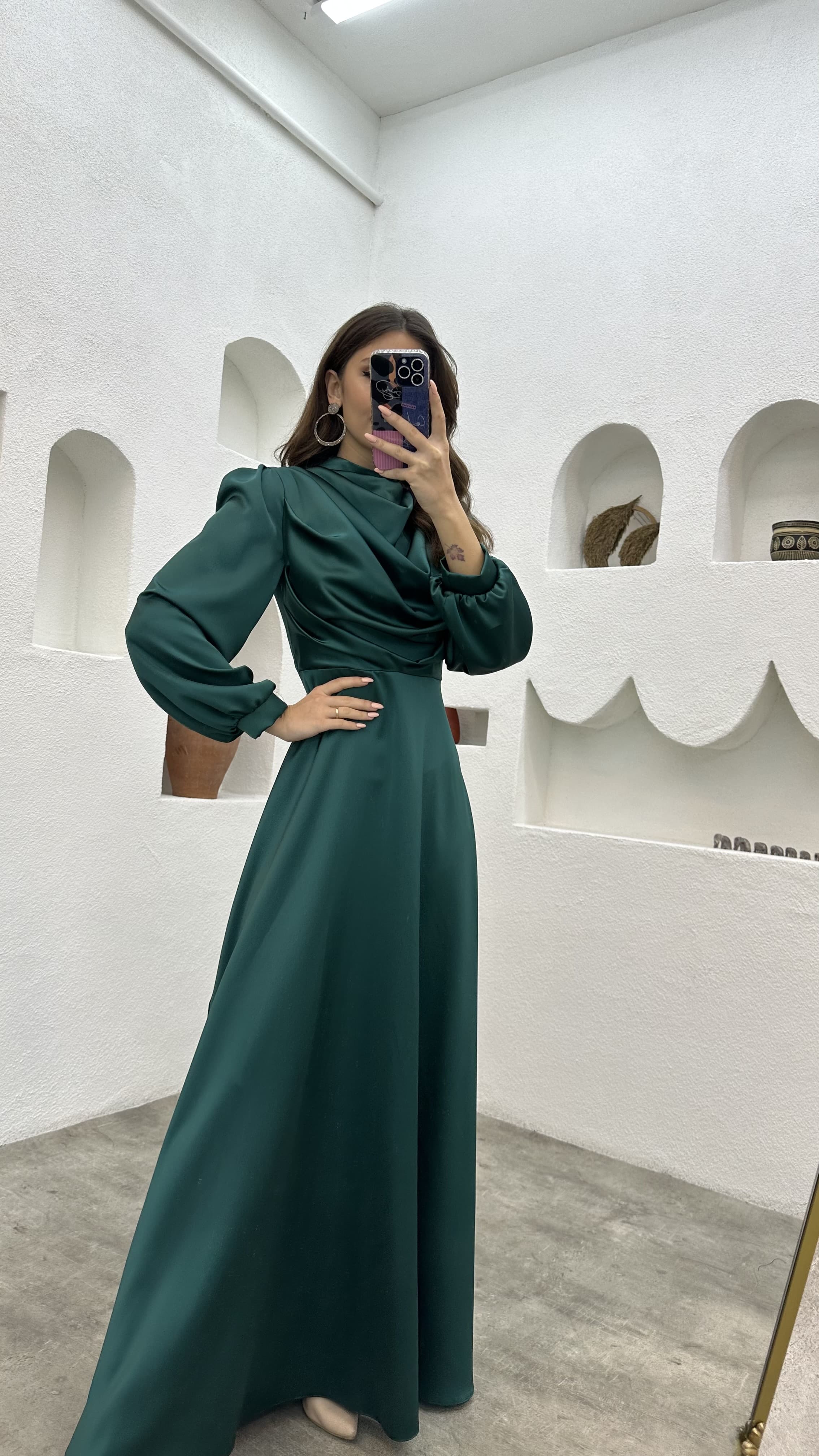 Zümrüt Drapeli Balon Kol Saten Tesettür Abiye
