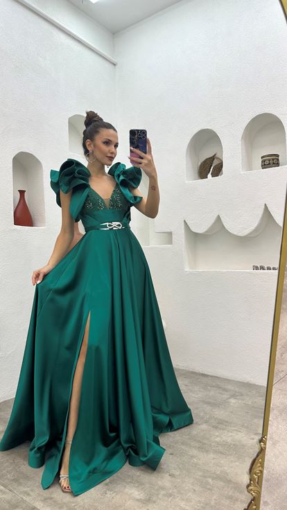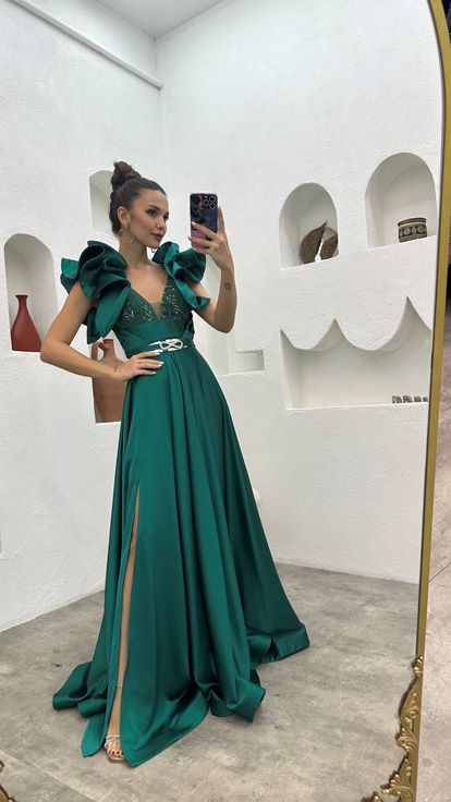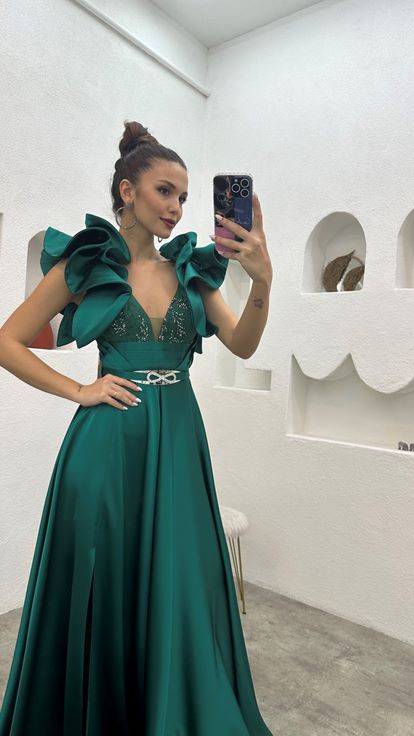 Zümrüt Kolları Volanlı Saten Abiye Elbise