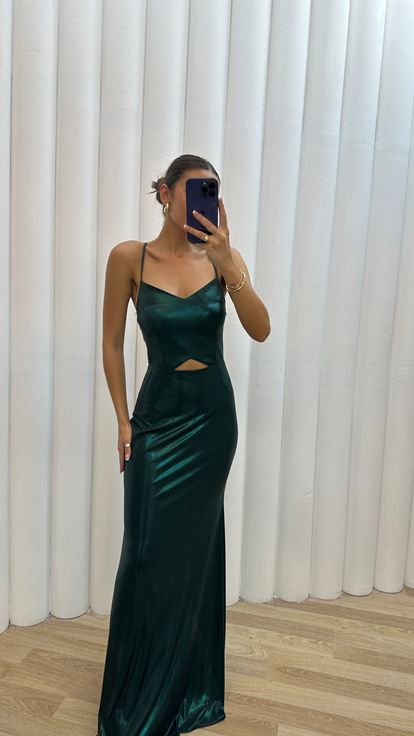 Zümrüt Sırtı Çapraz Detay İp Askılı Abiye Elbise