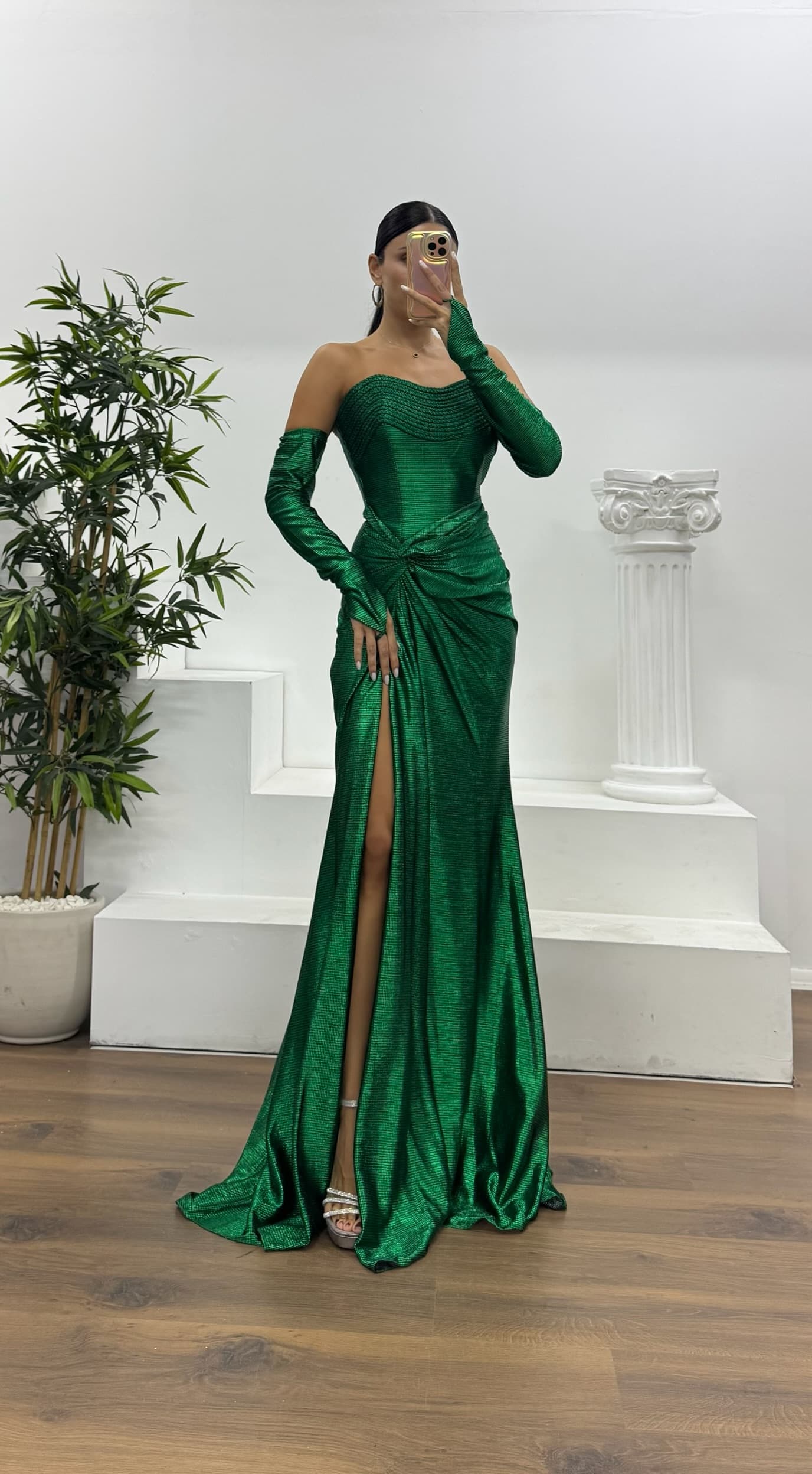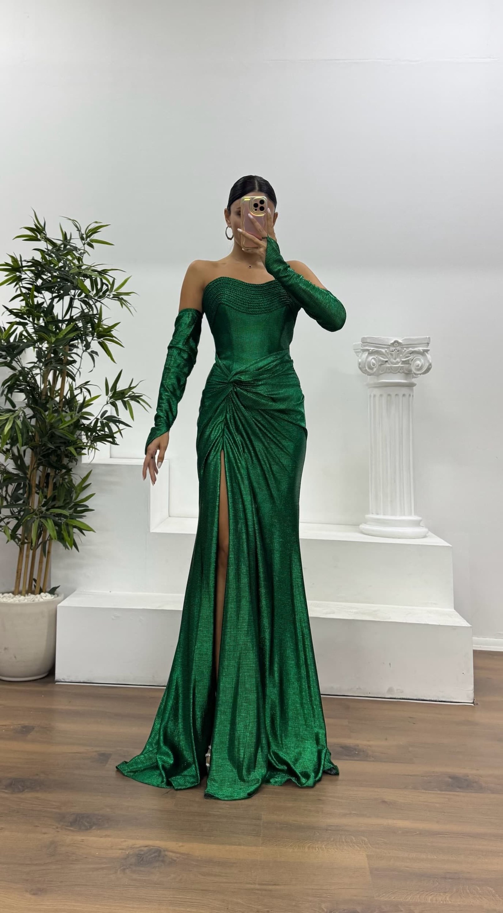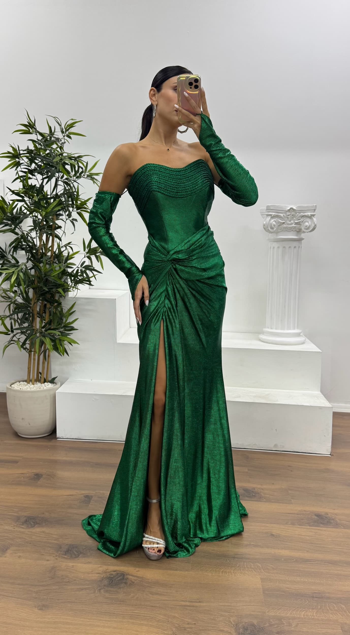 • Zümrüt Straplez Eldivenli Abiye Elbise