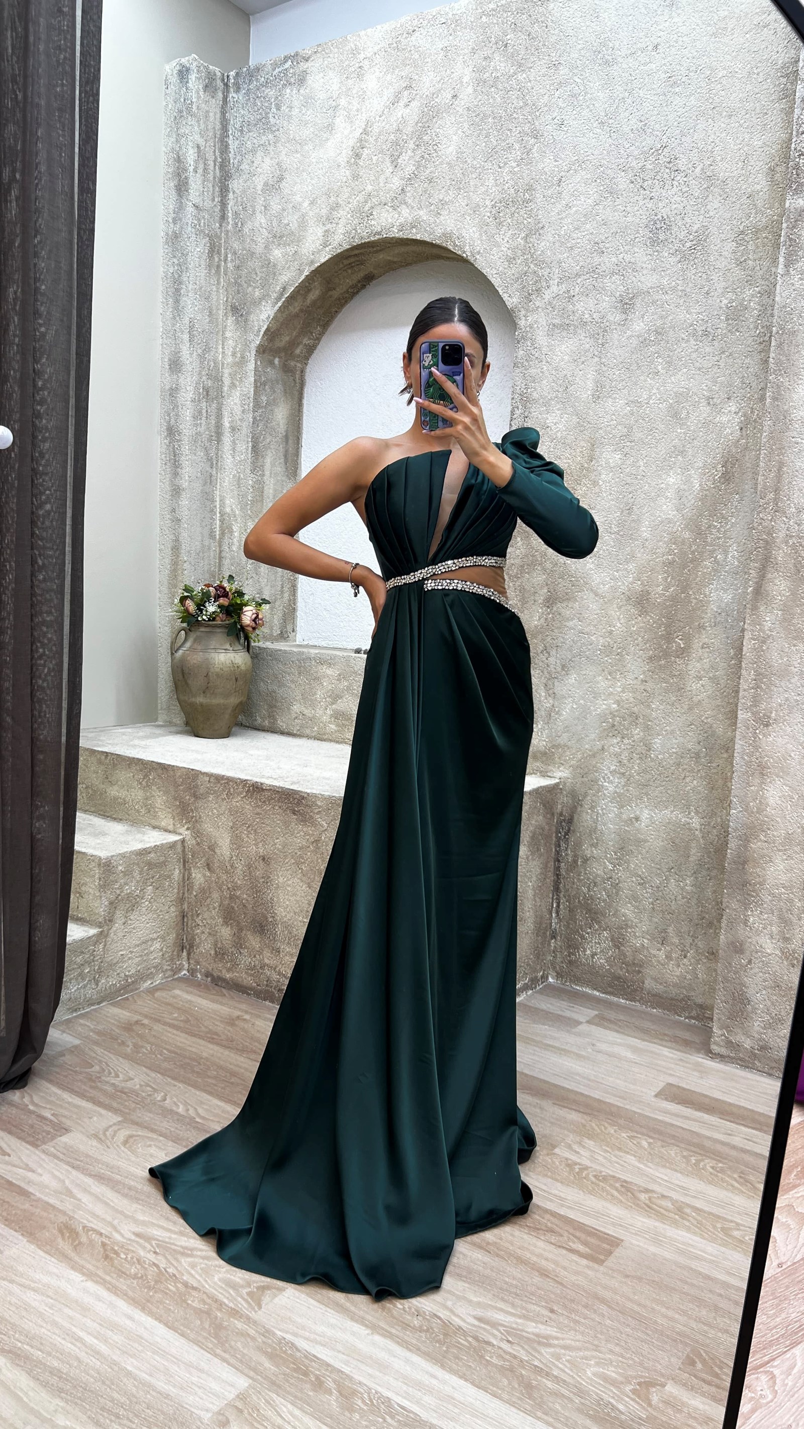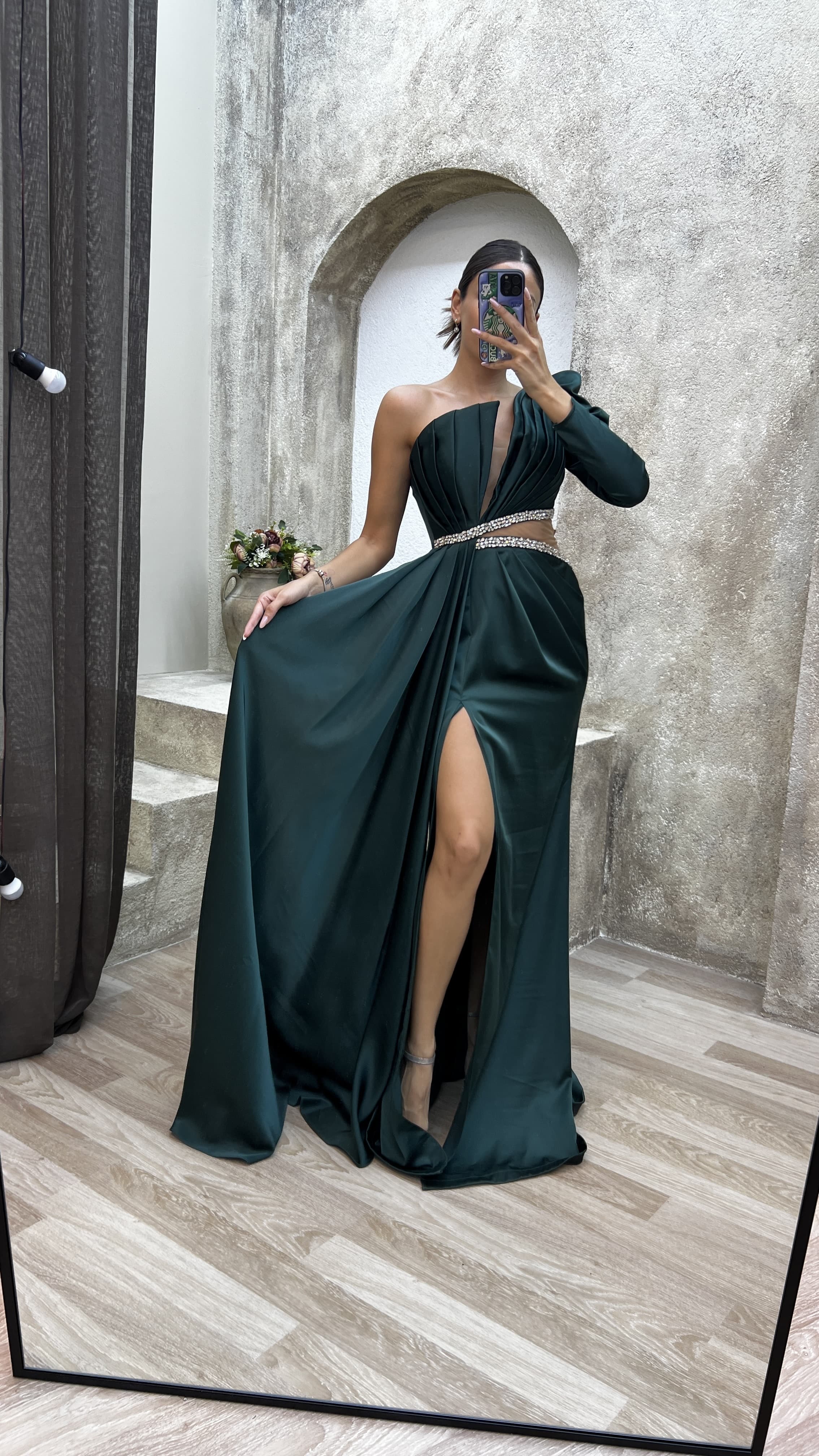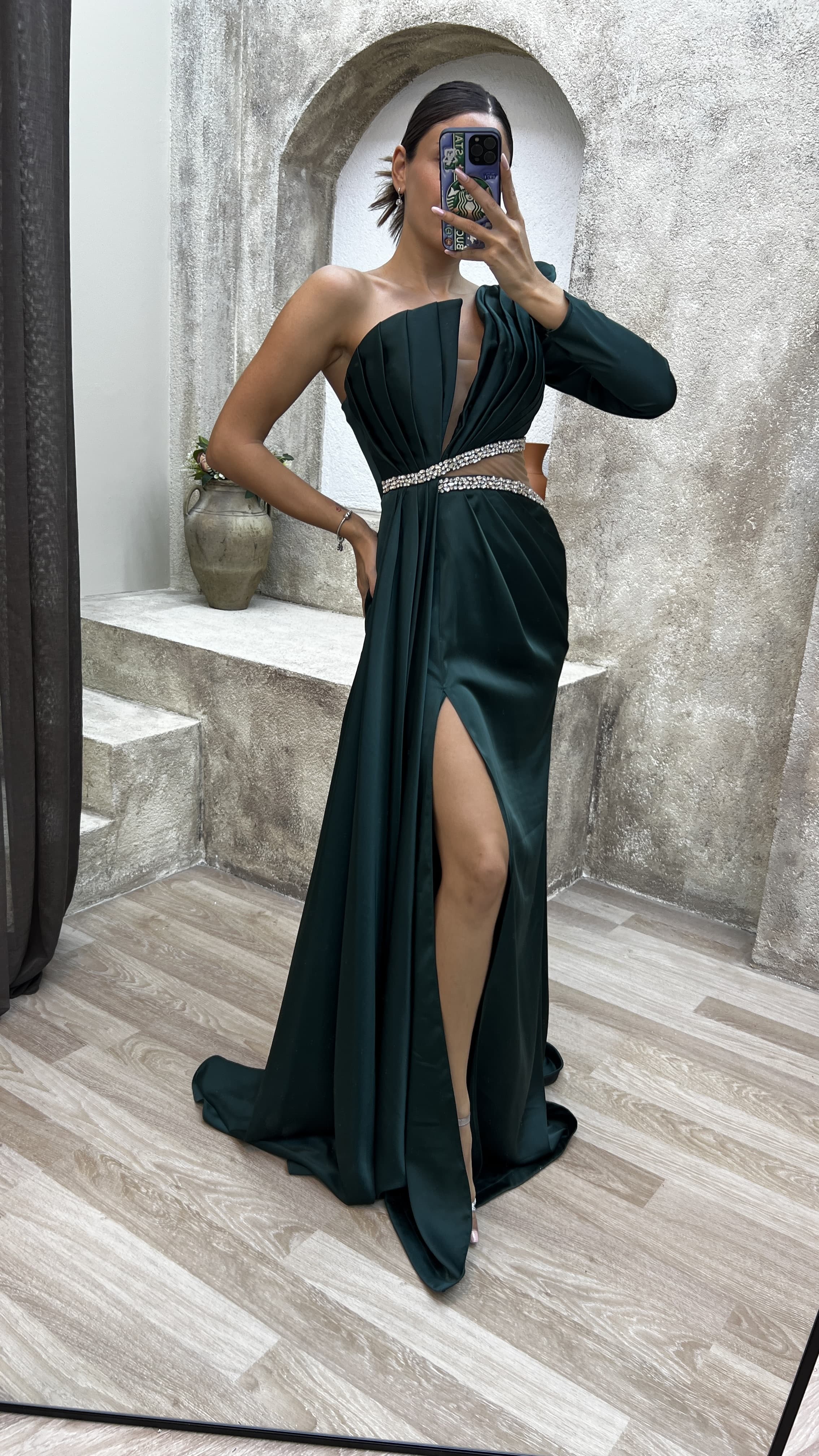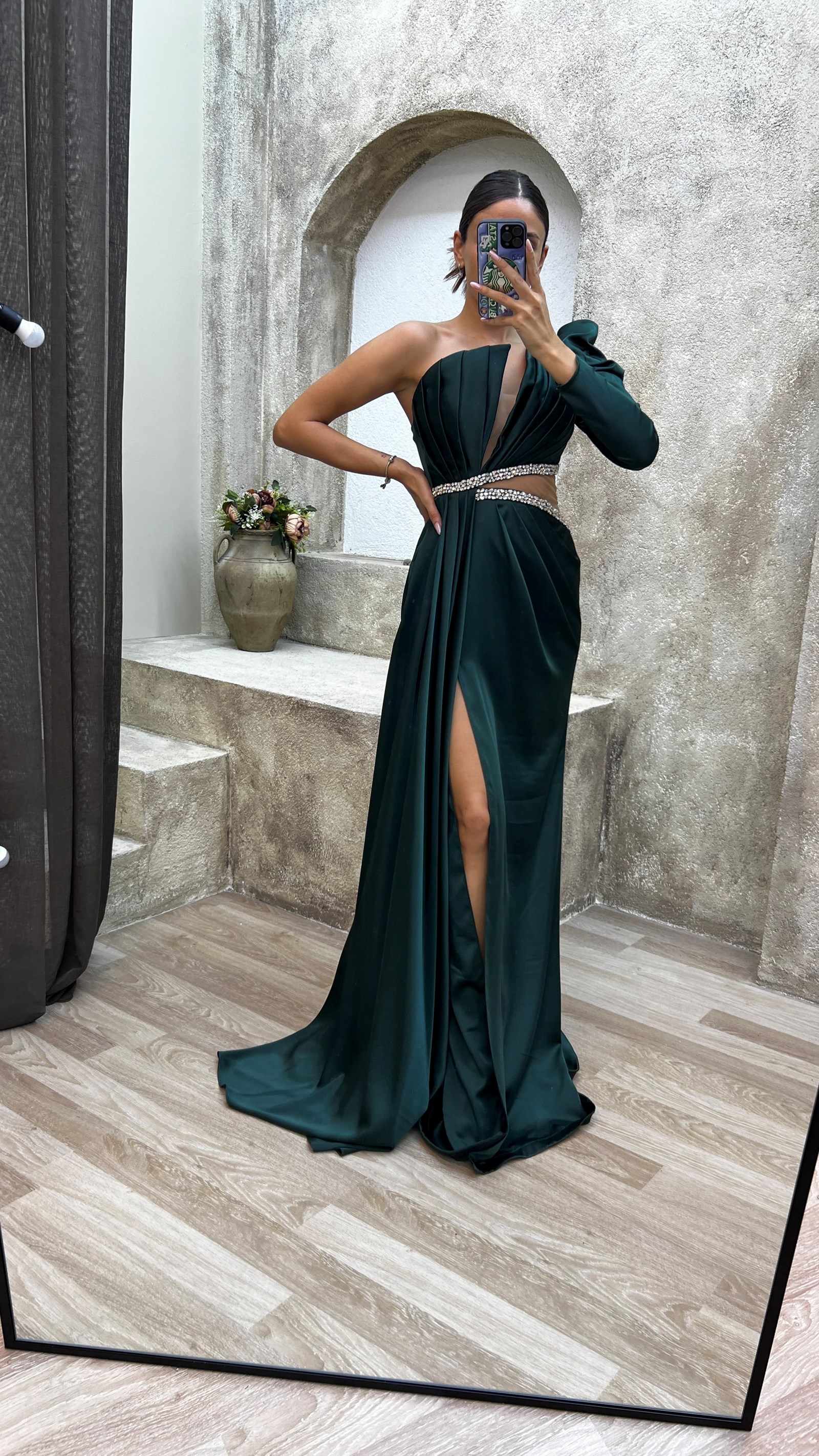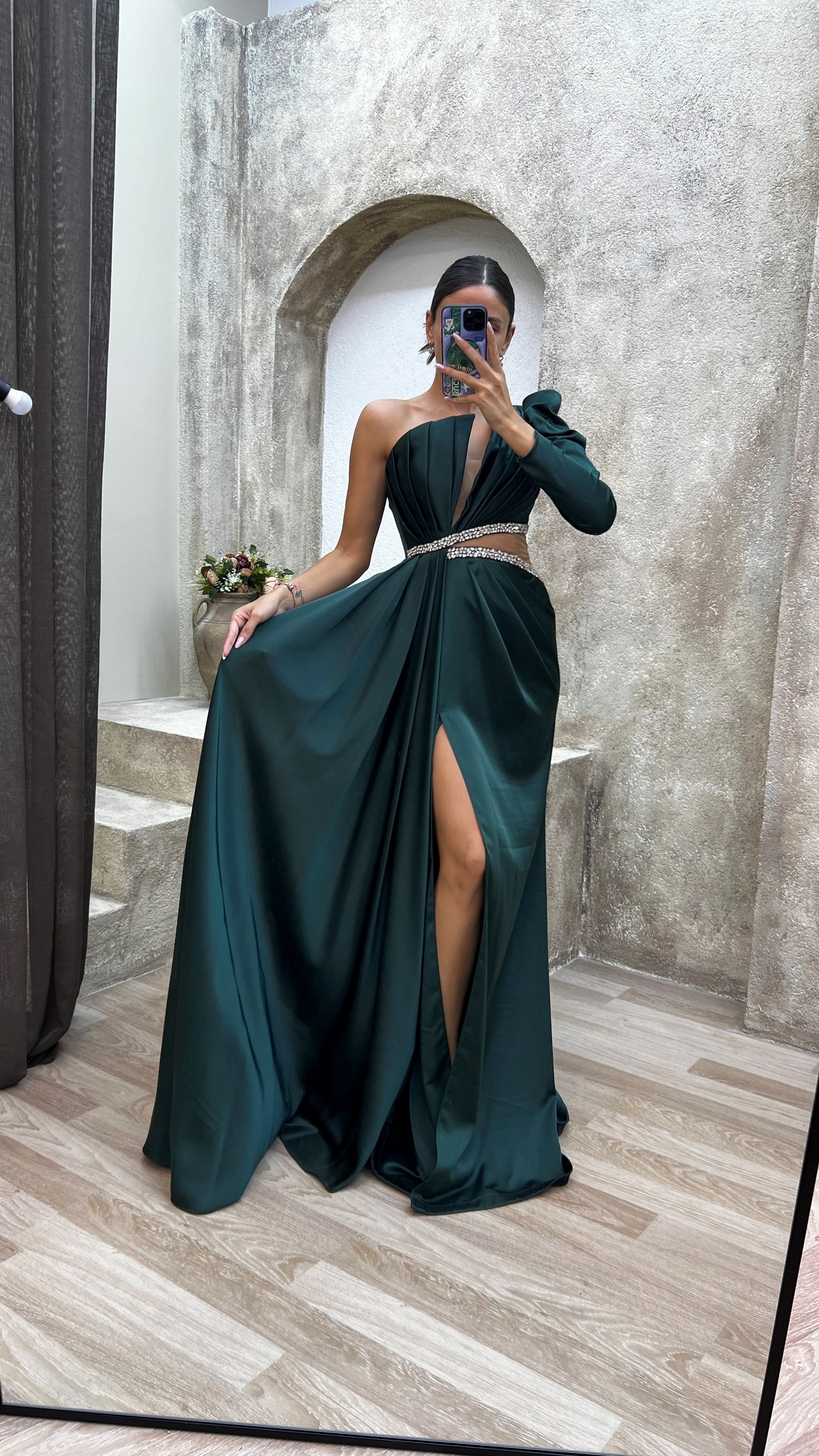 Zümrüt Tek Kol Bel Detay Yırtmaçlı Abiye Elbise