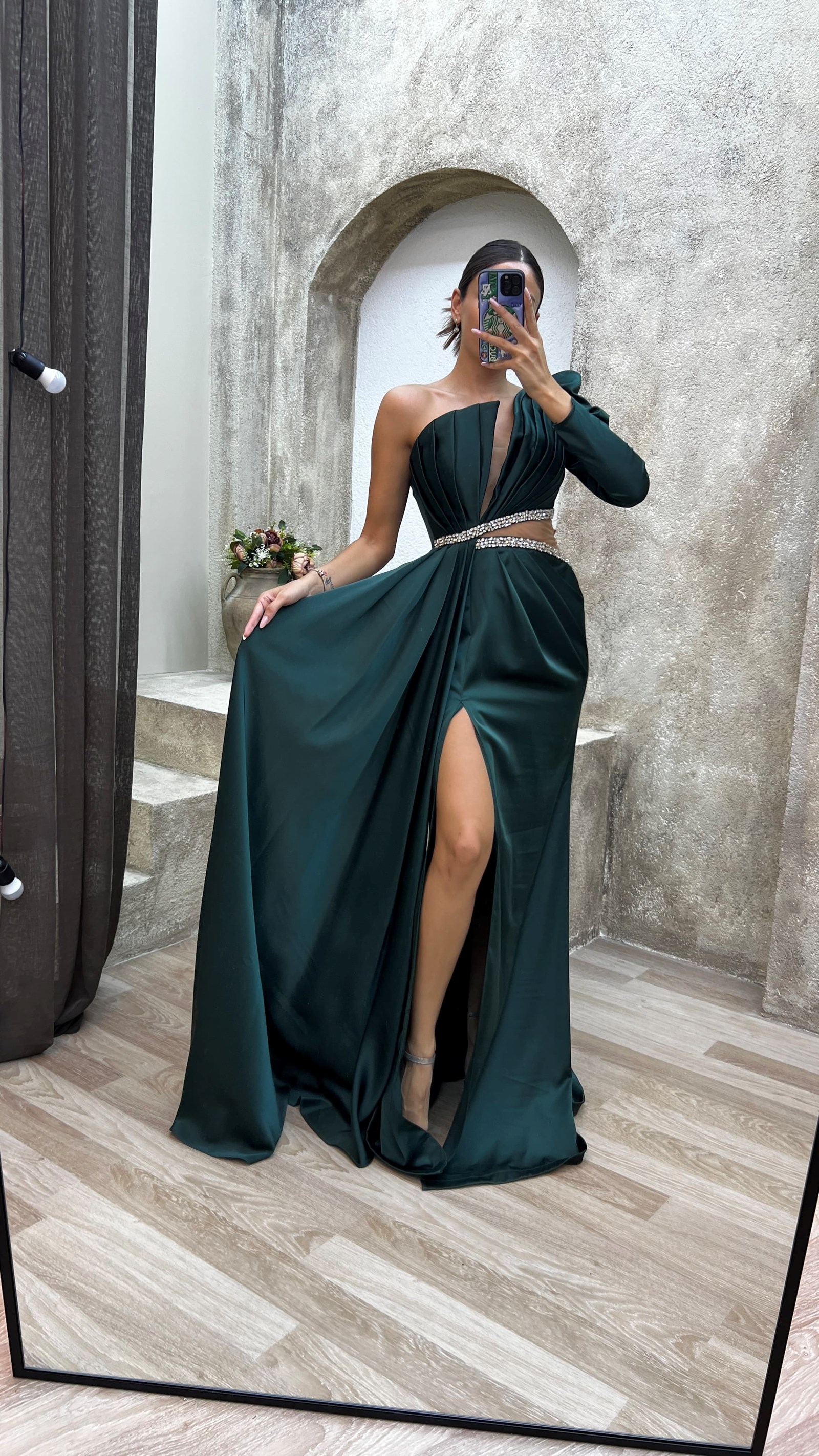 • Zümrüt Tek Kol Bel Detay Yırtmaçlı Abiye Elbise