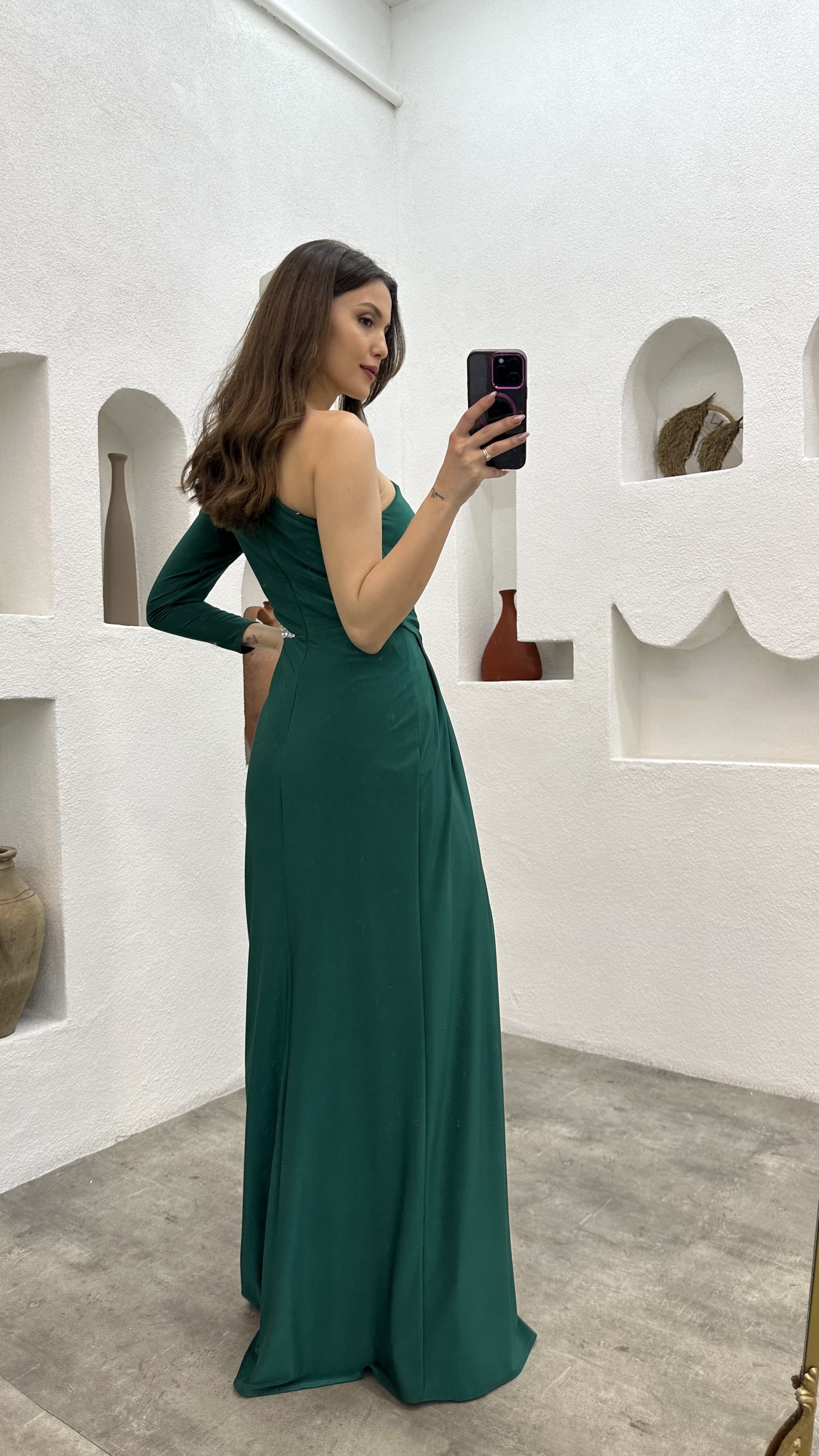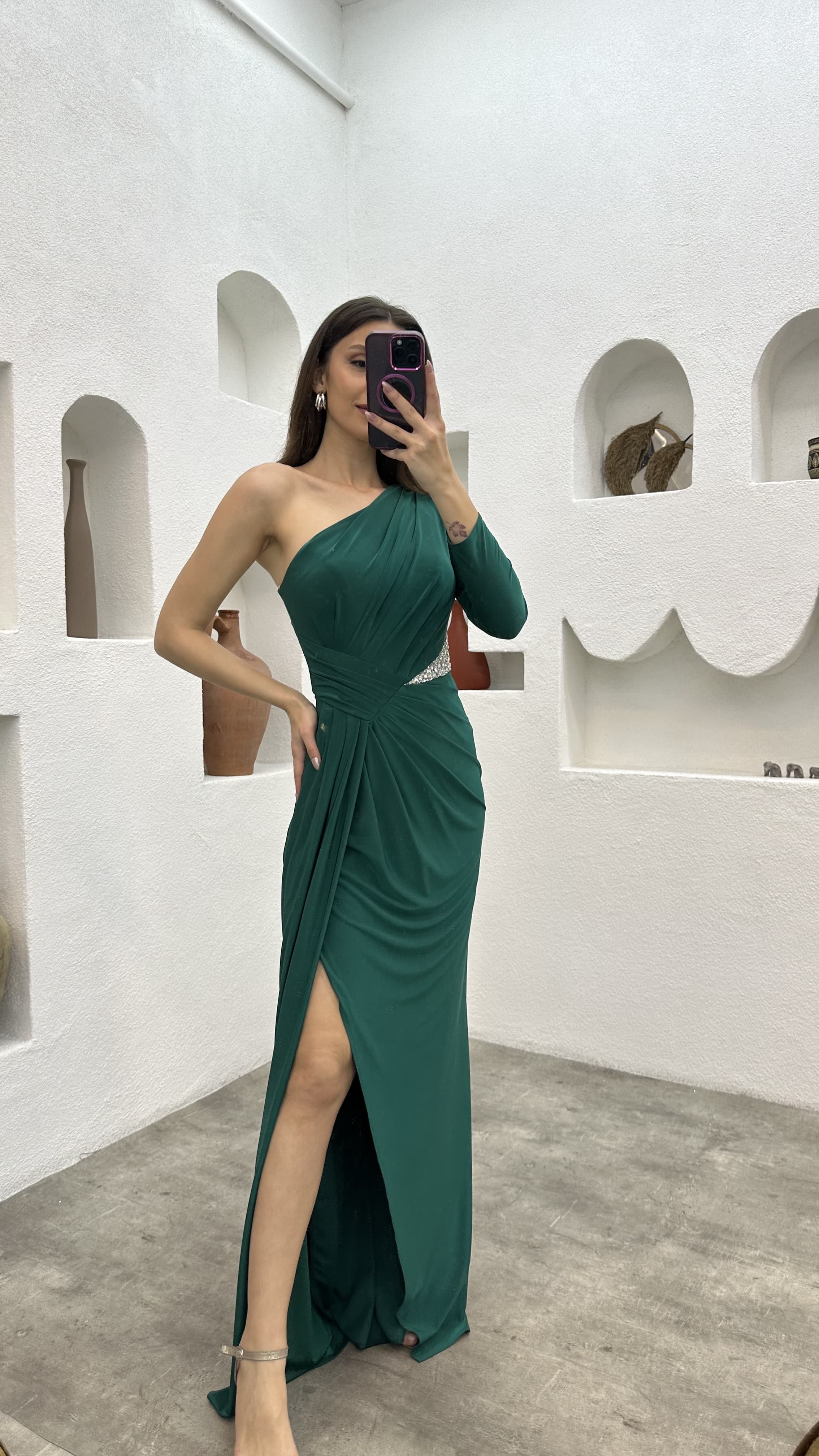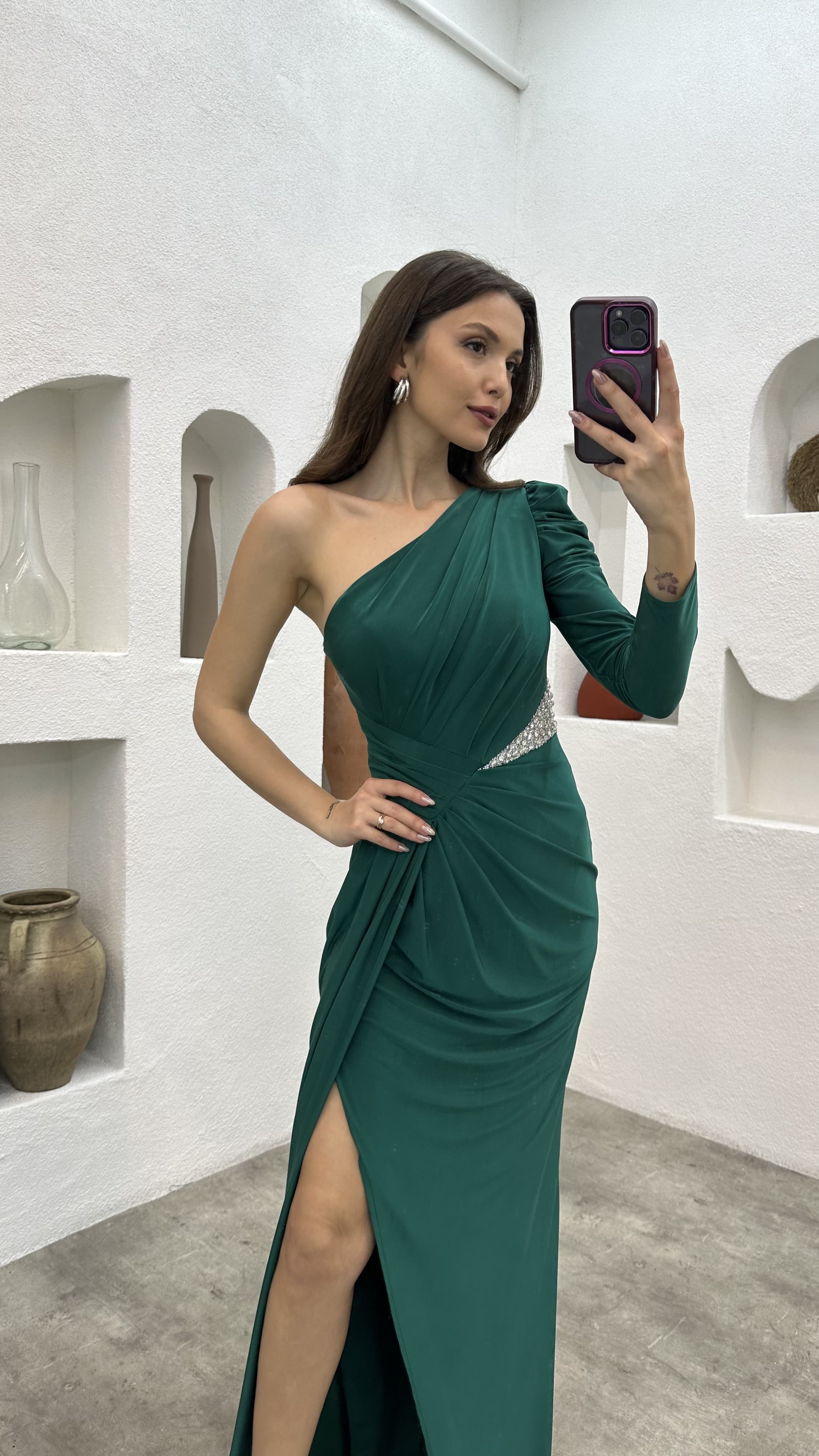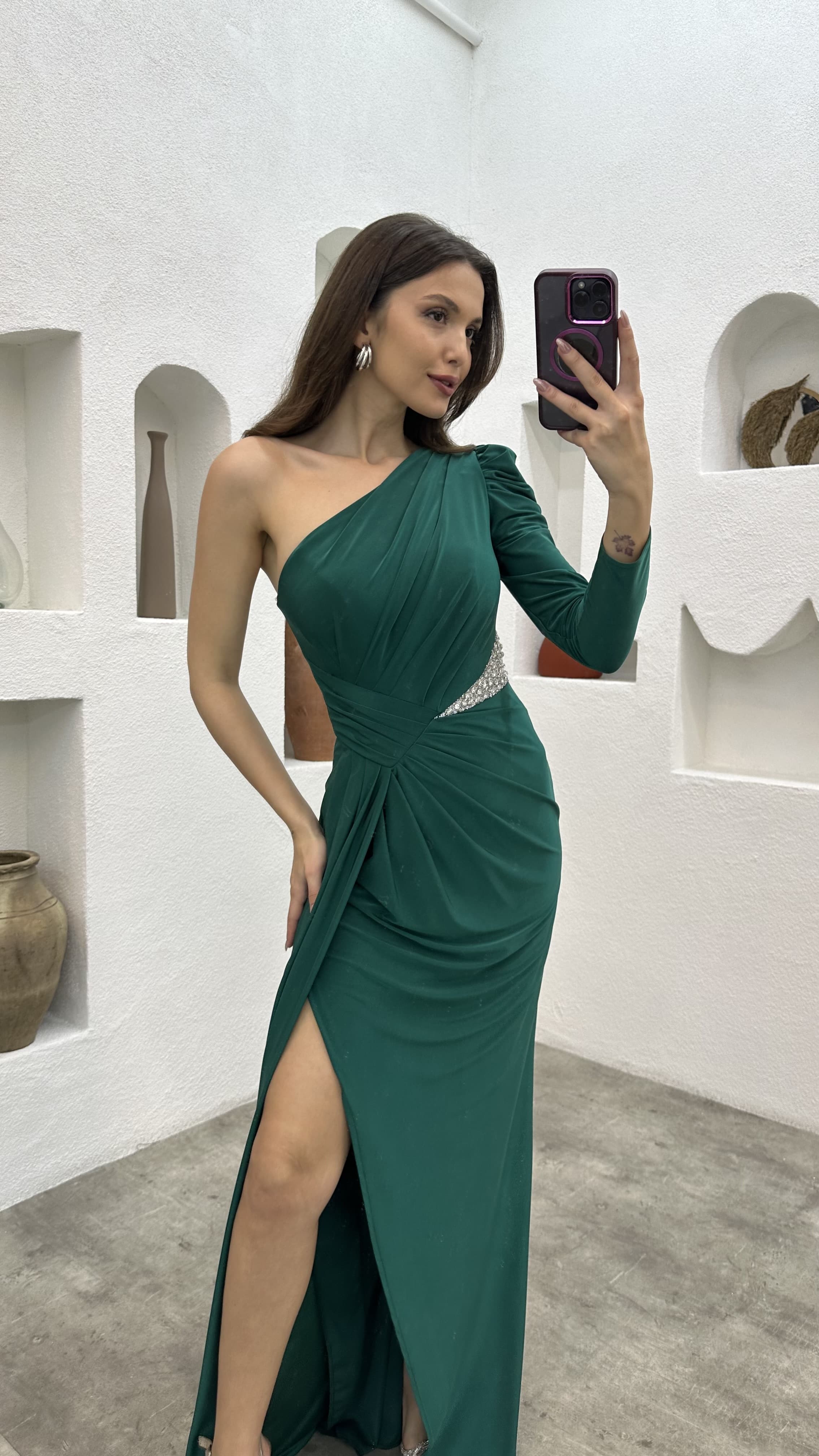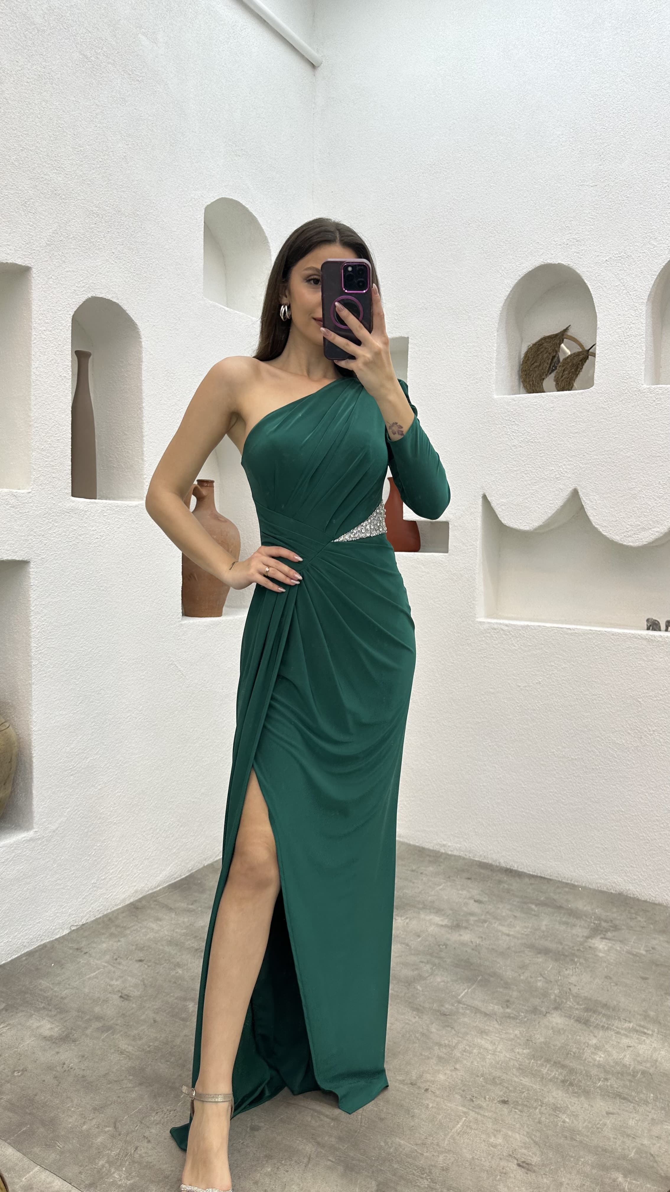 • Zümrüt Tek Kol Beli İşlemeli Drapeli Abiye Elbise