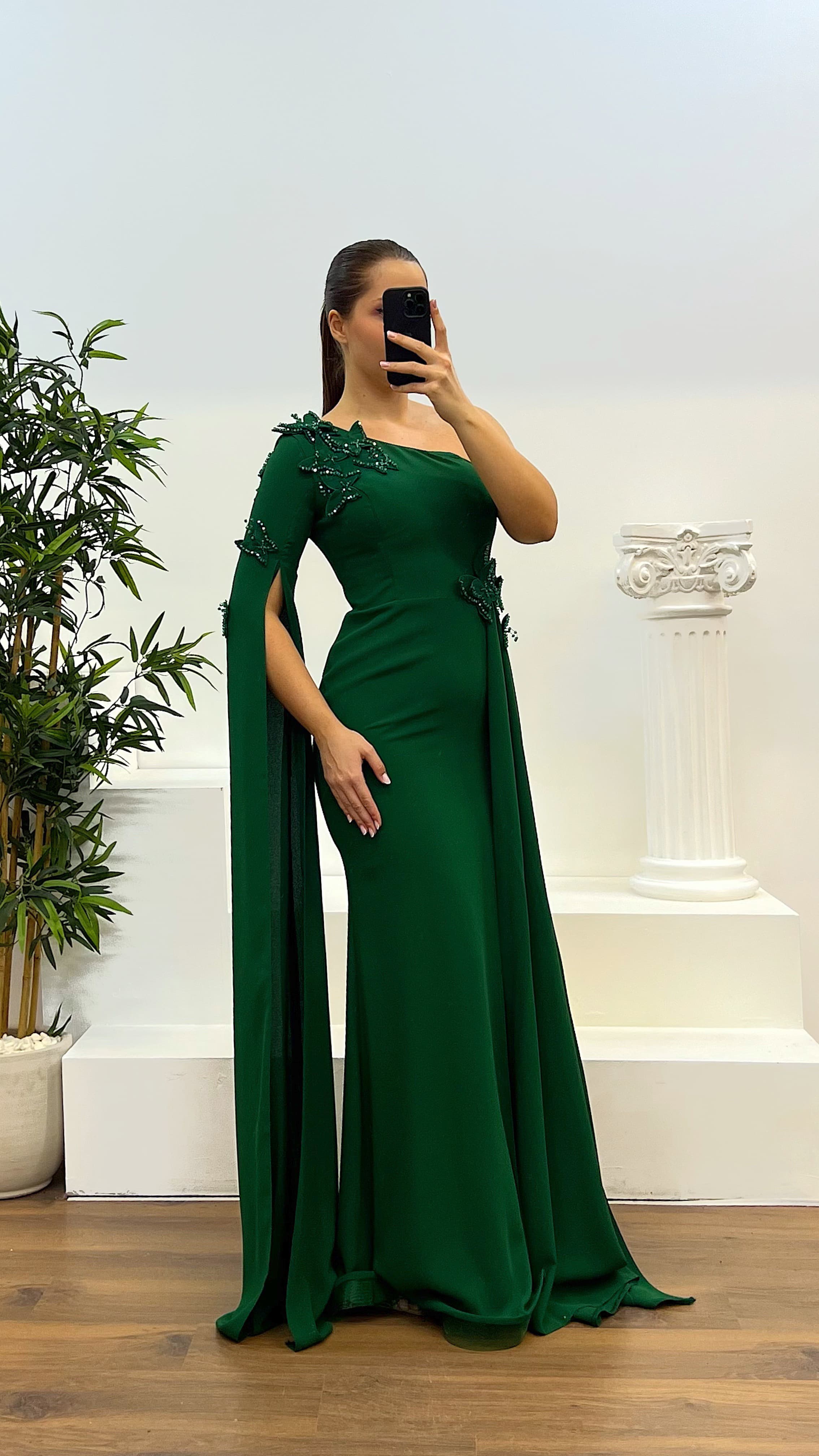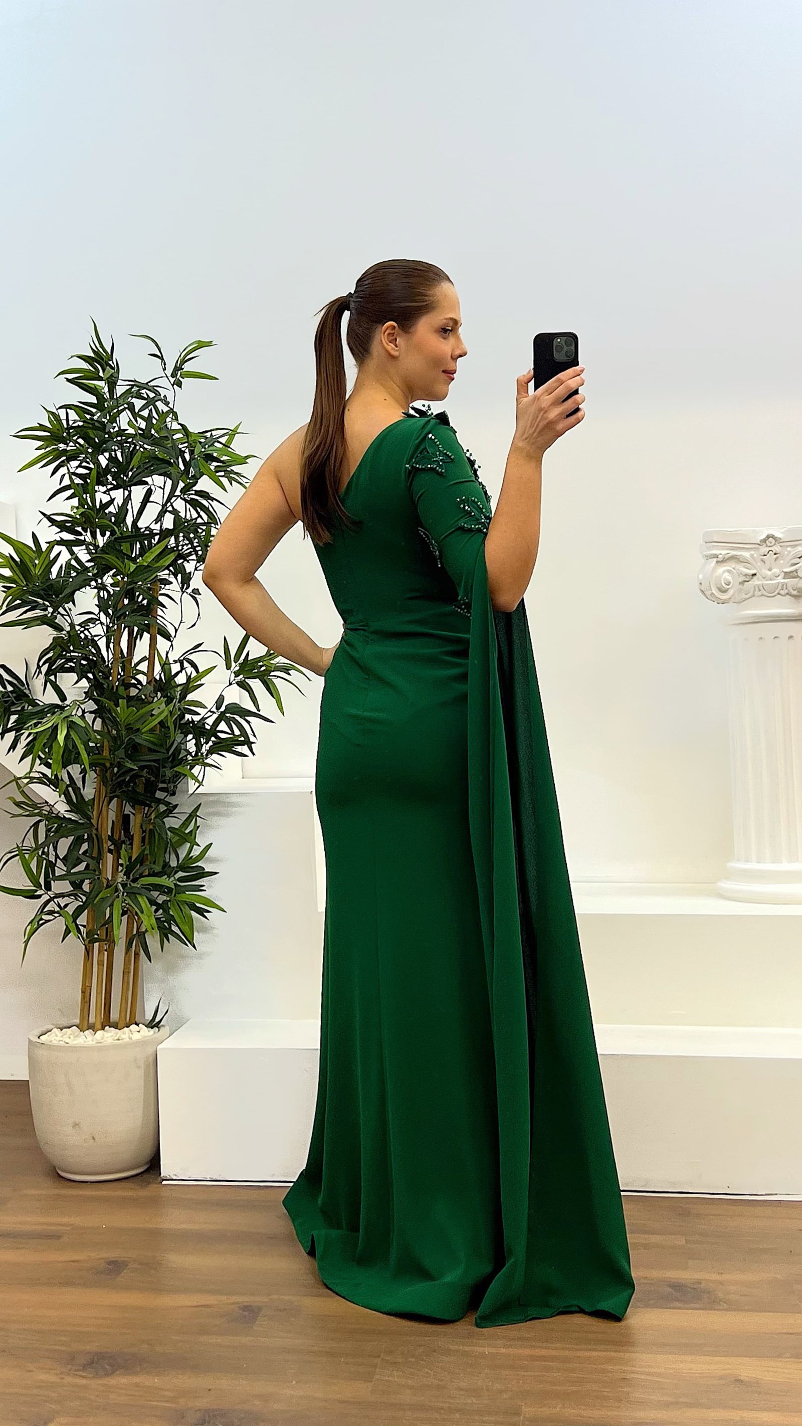 • Zümrüt Tek Kol Büyük Beden Abiye Elbise