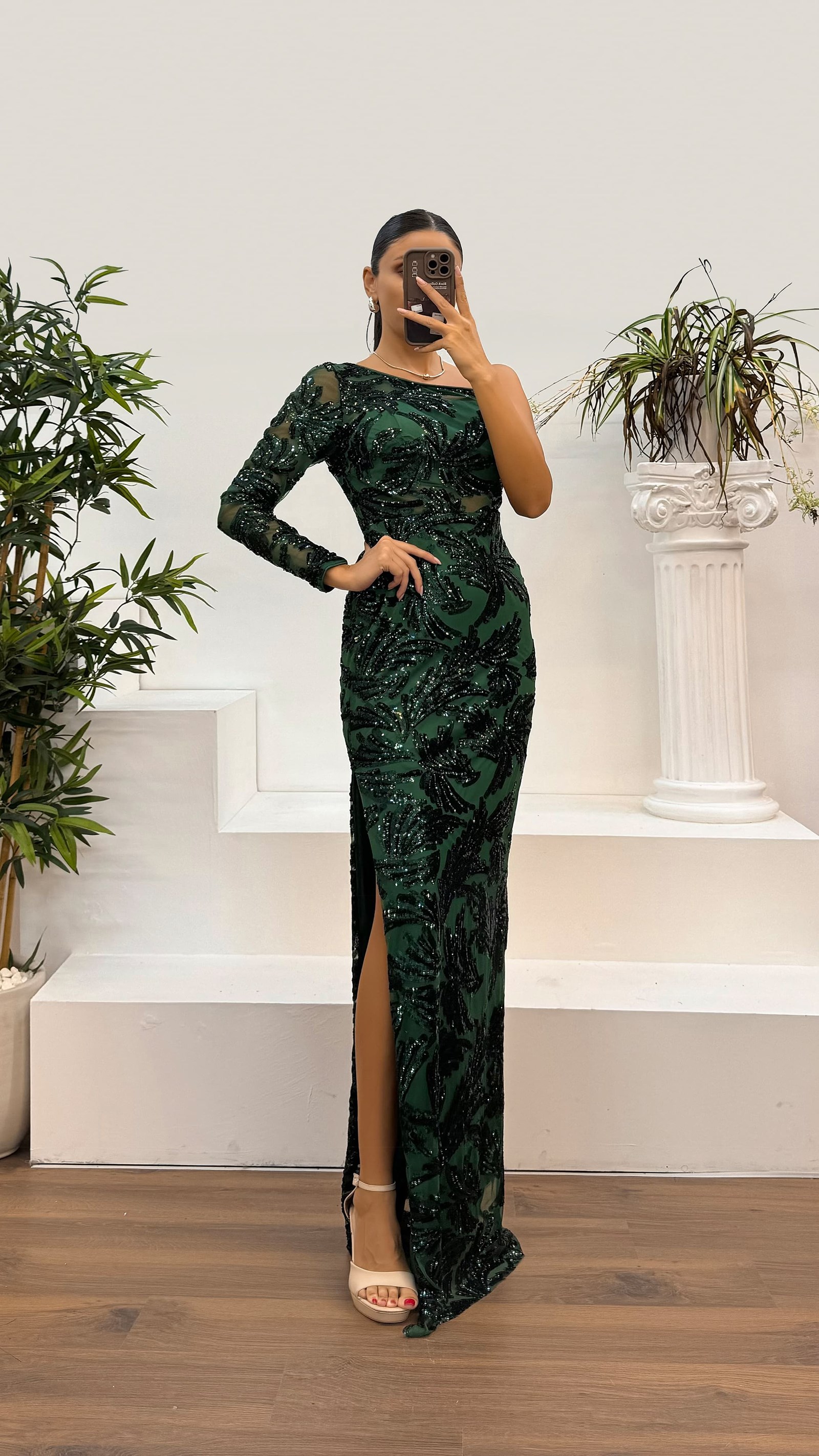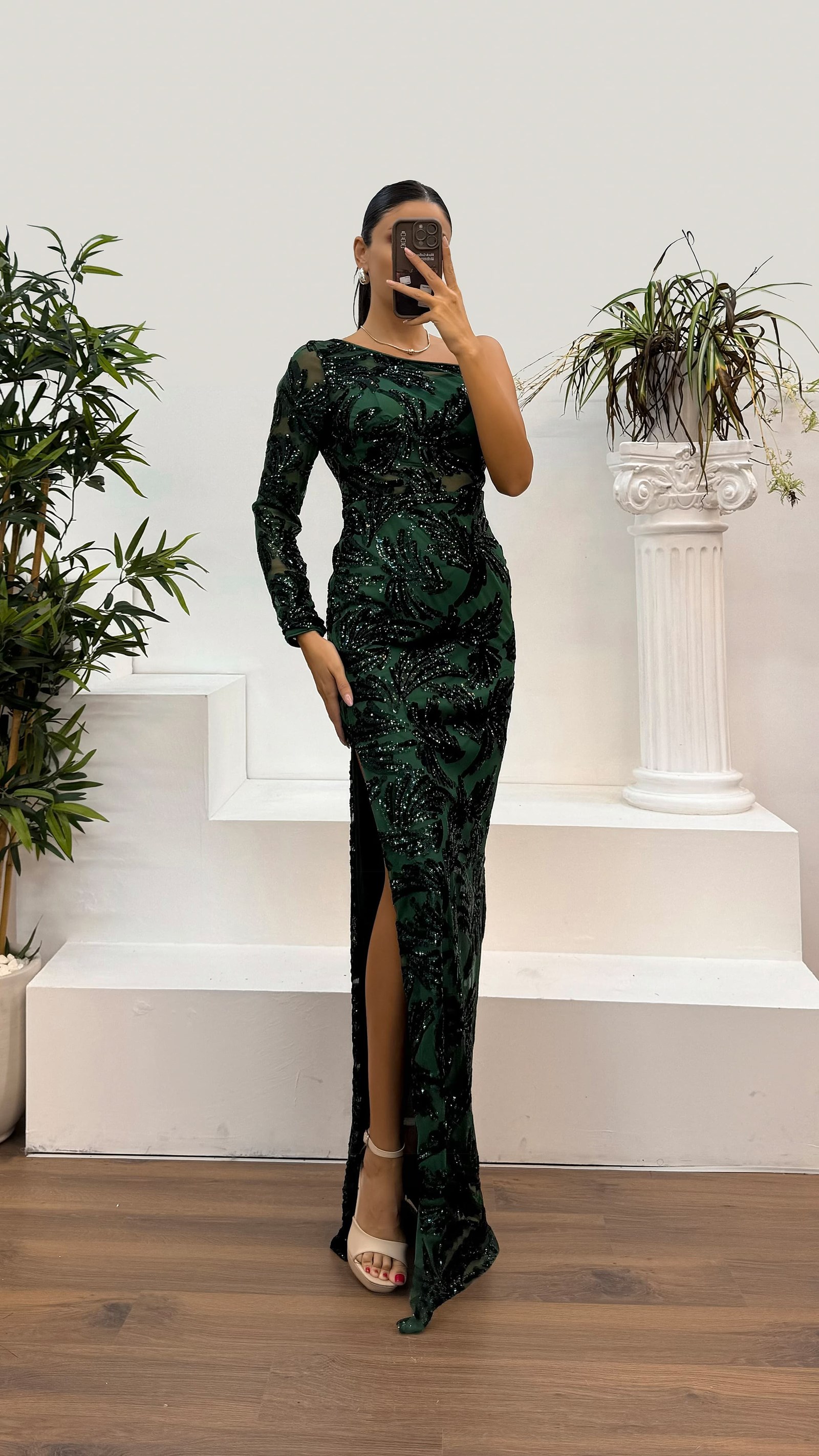 • Zümrüt Tek Kol İşlemeli Abiye Elbise