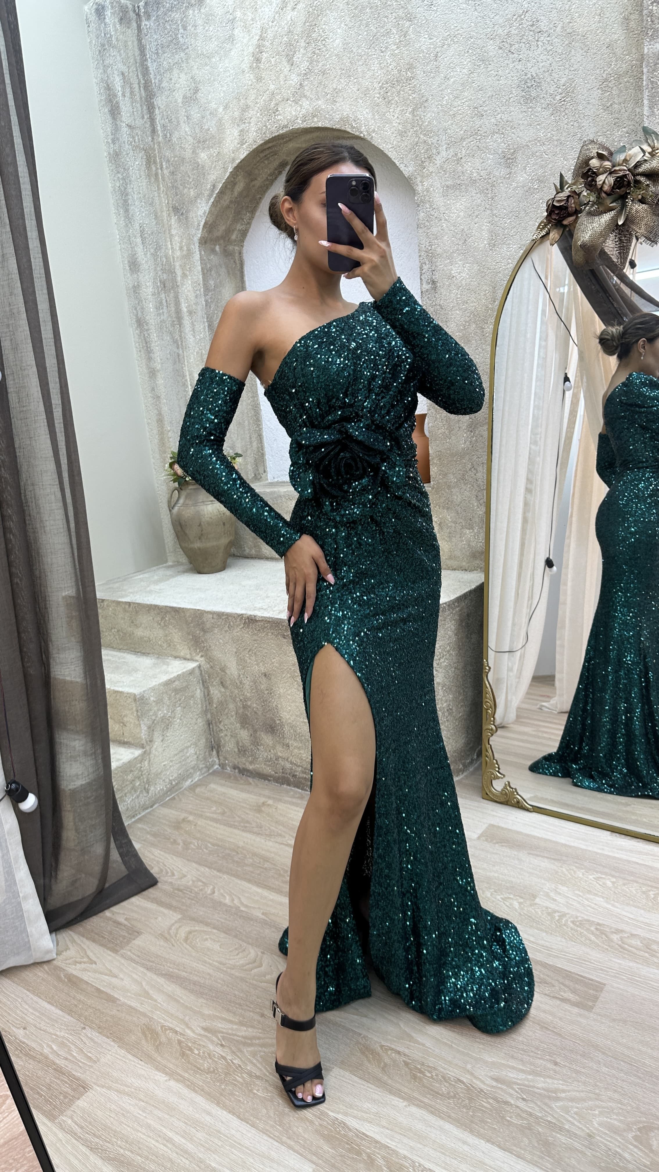 • Zümrüt Tek Omuz Gül Detay Payet Abiye Elbise