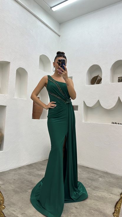 • Zümrüt Tek Omuz İşlemeli Beli Motifli Abiye Elbise