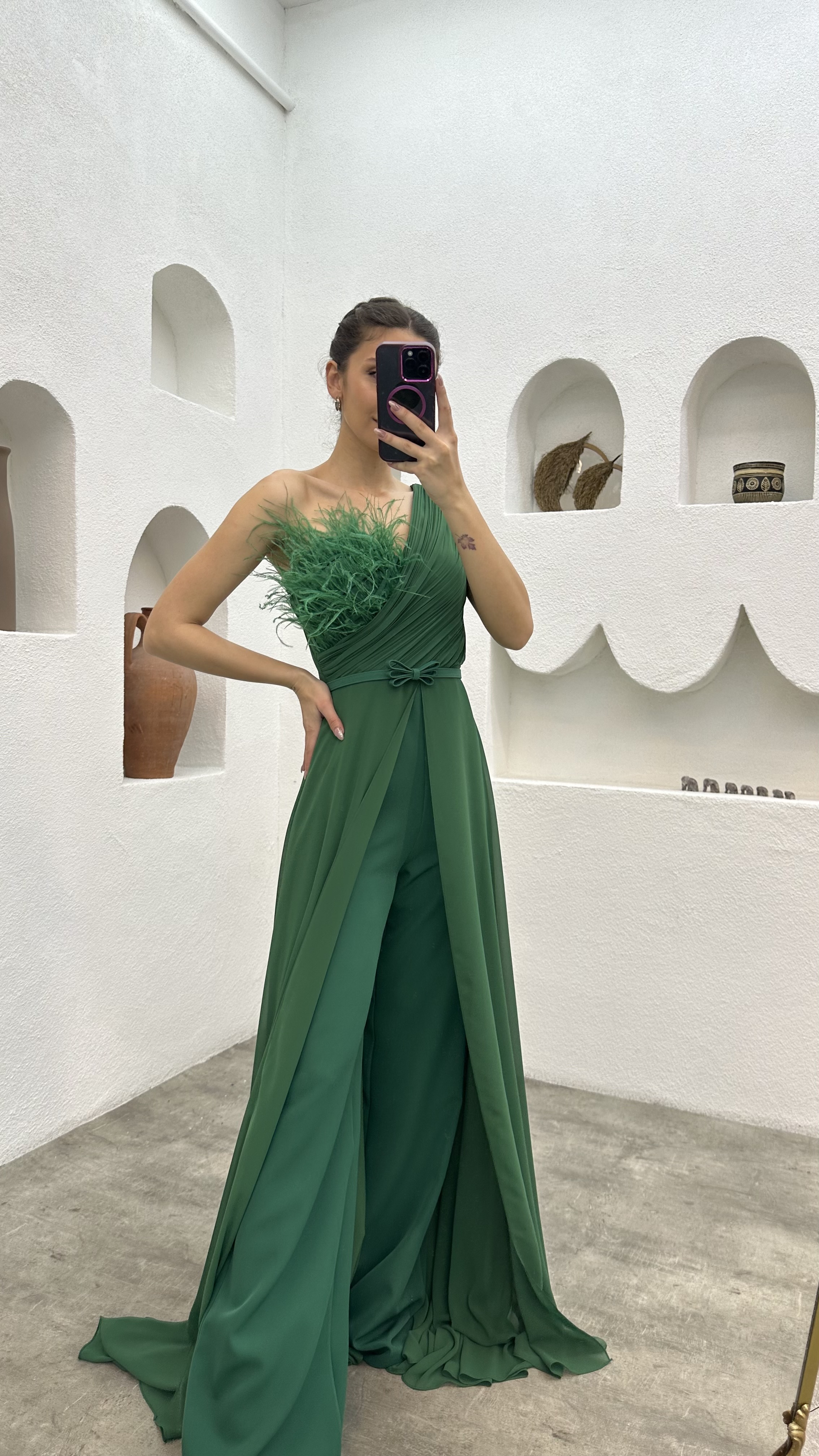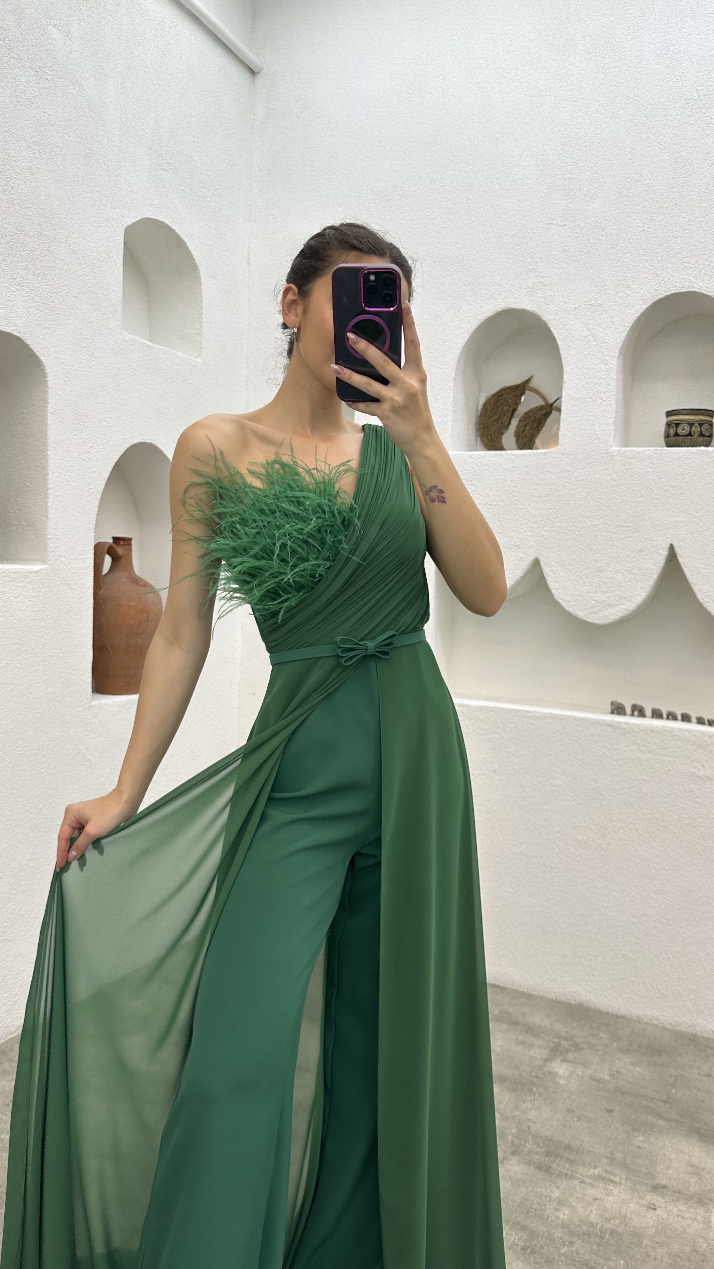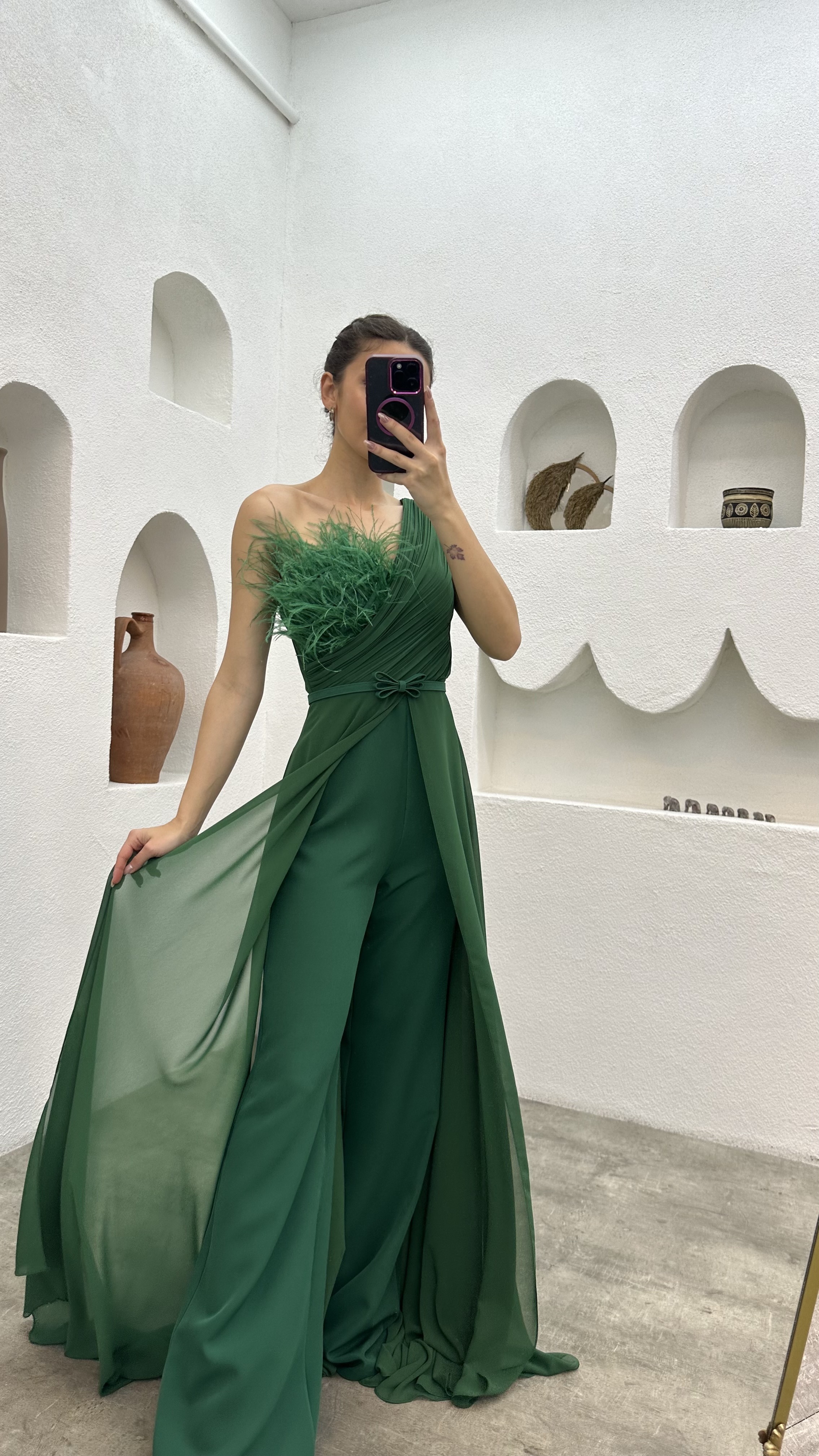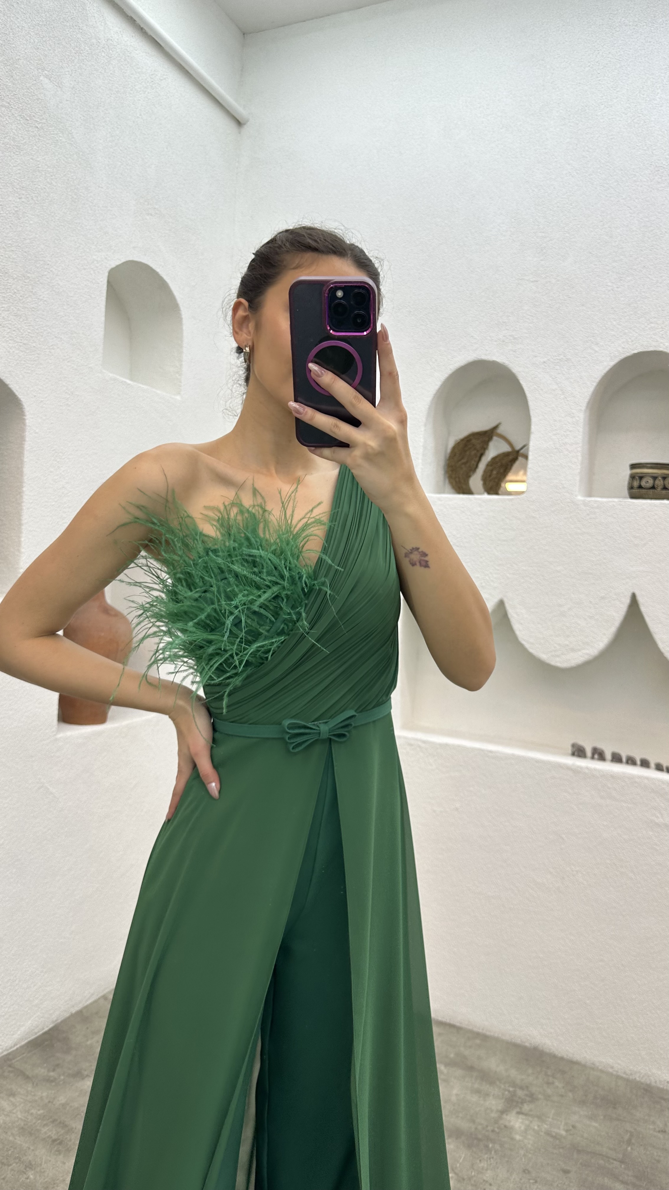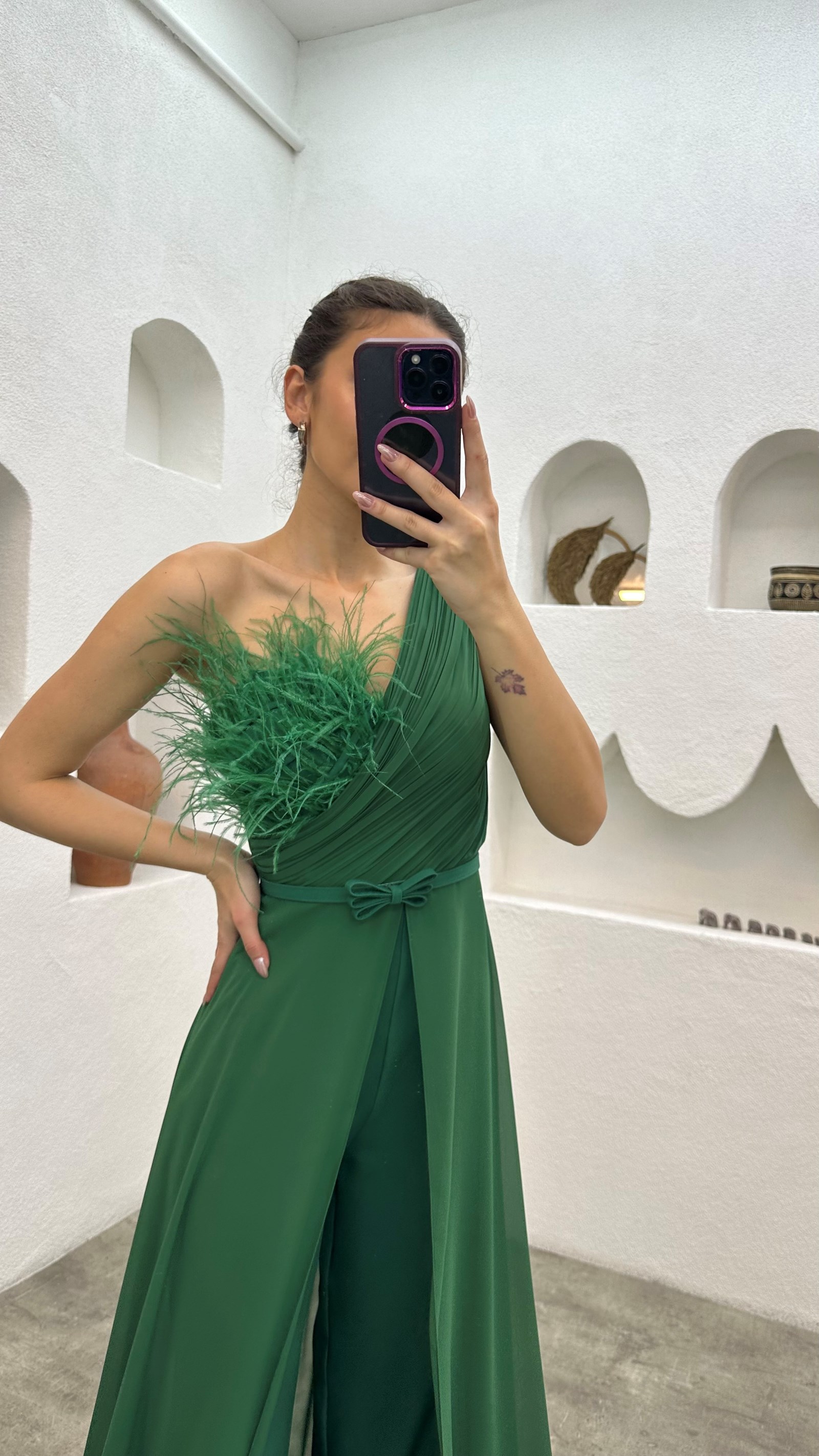 Zümrüt Tek Omuz Tüy Detaylı Tulum