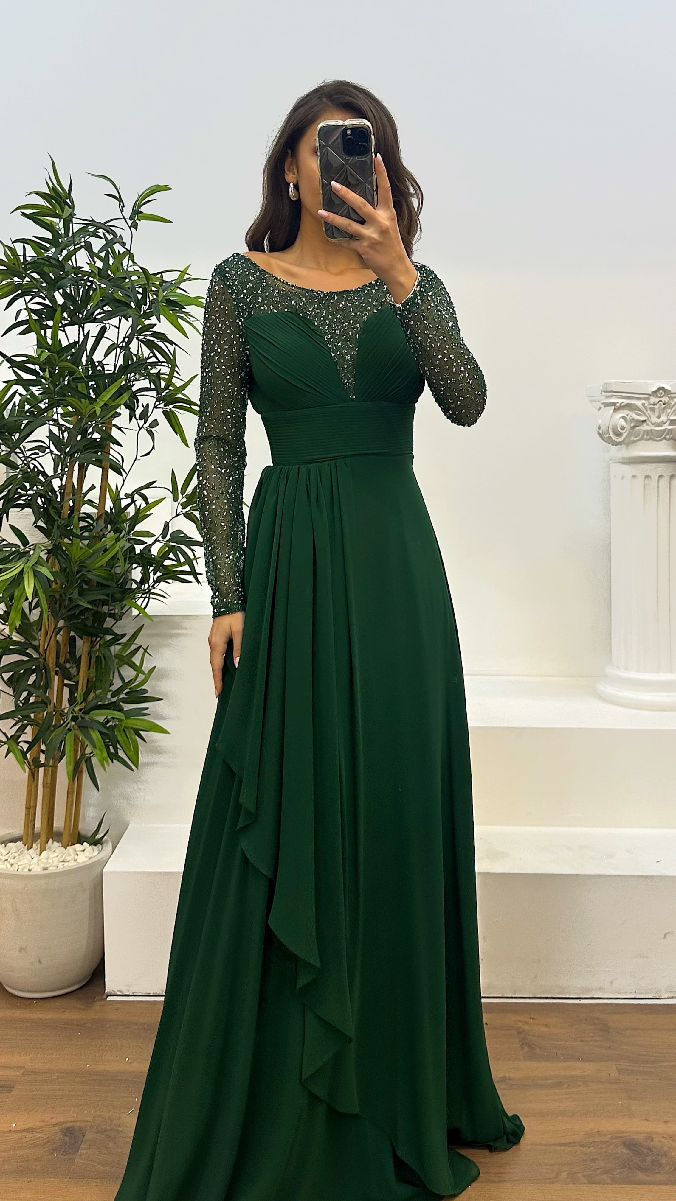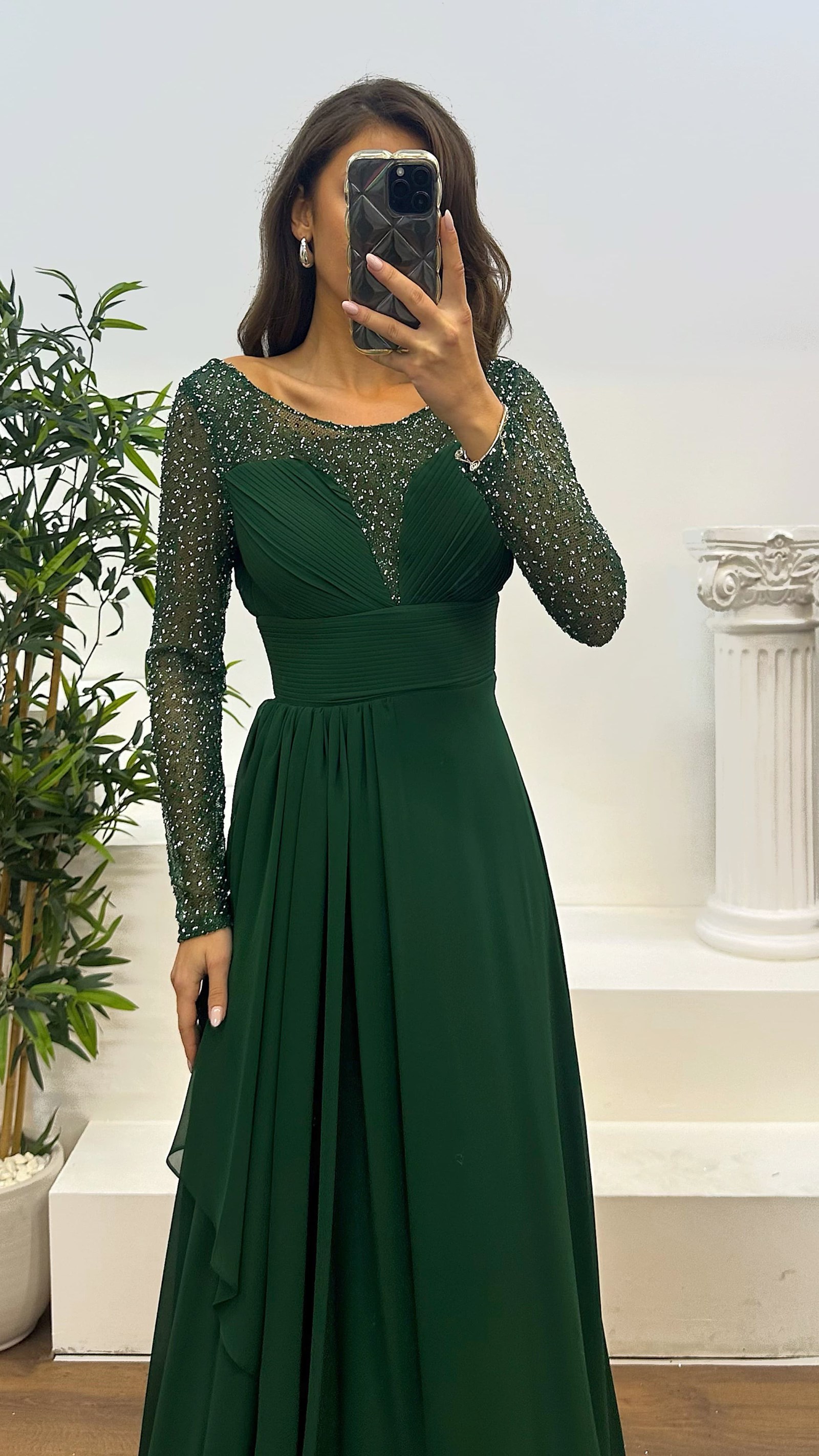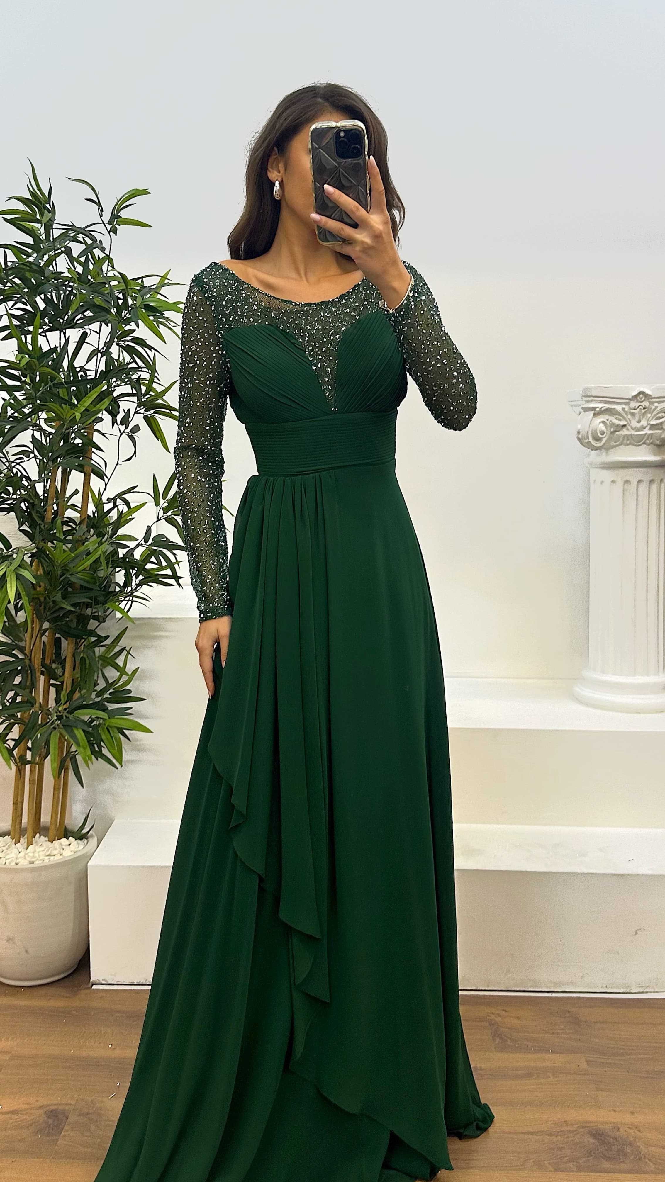 Zümrüt Transparan Detay Şifon Abiye Elbise