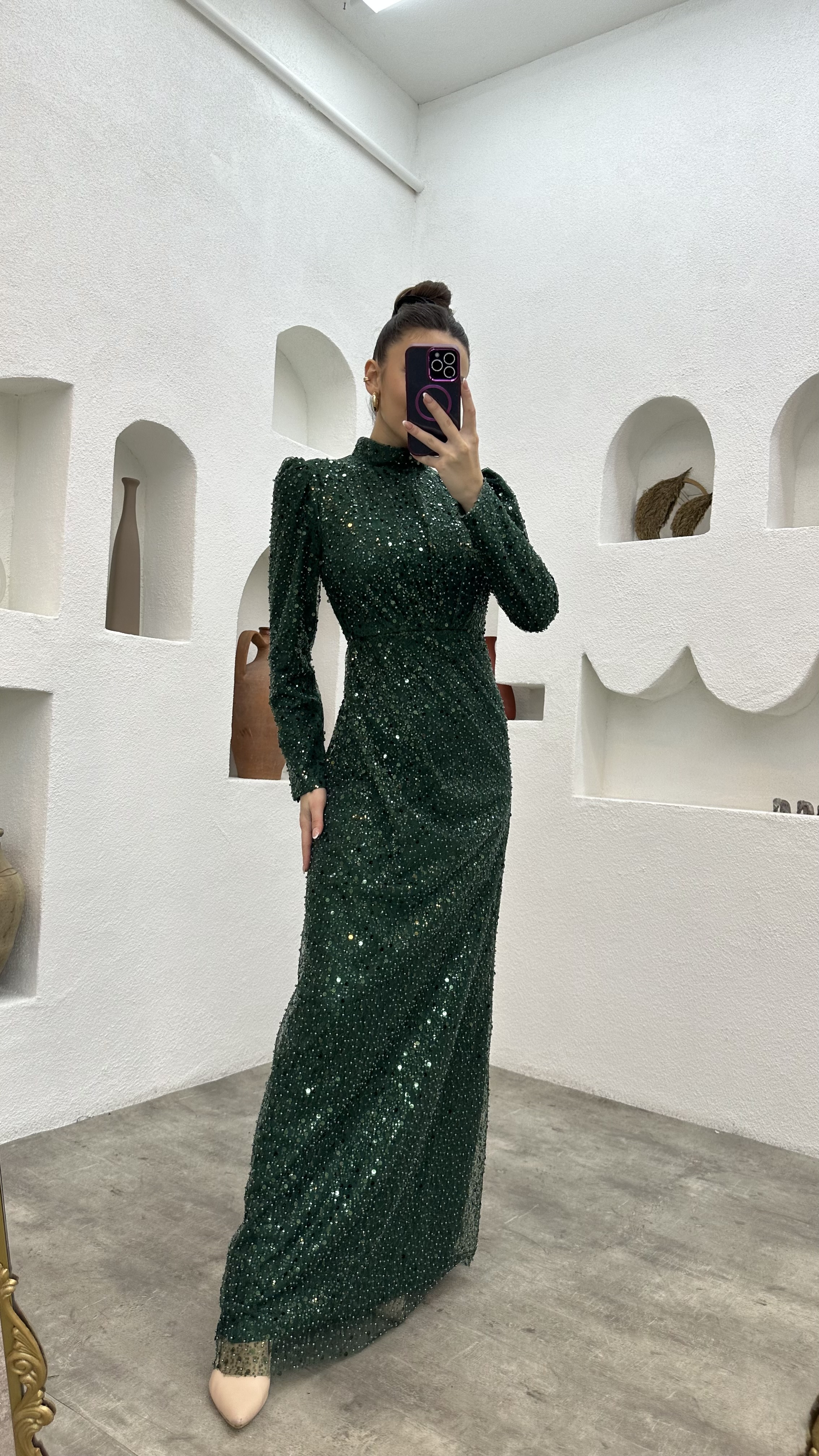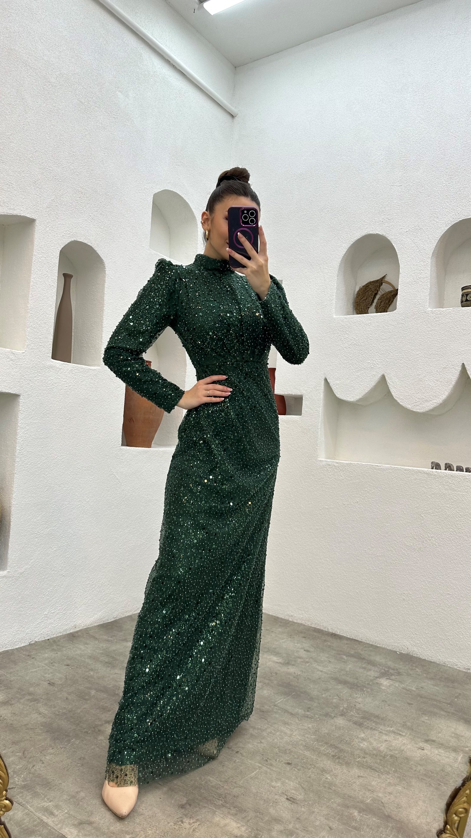 • Zümrüt Uzun Kol Pul Payet Tesettür Abiye Elbise