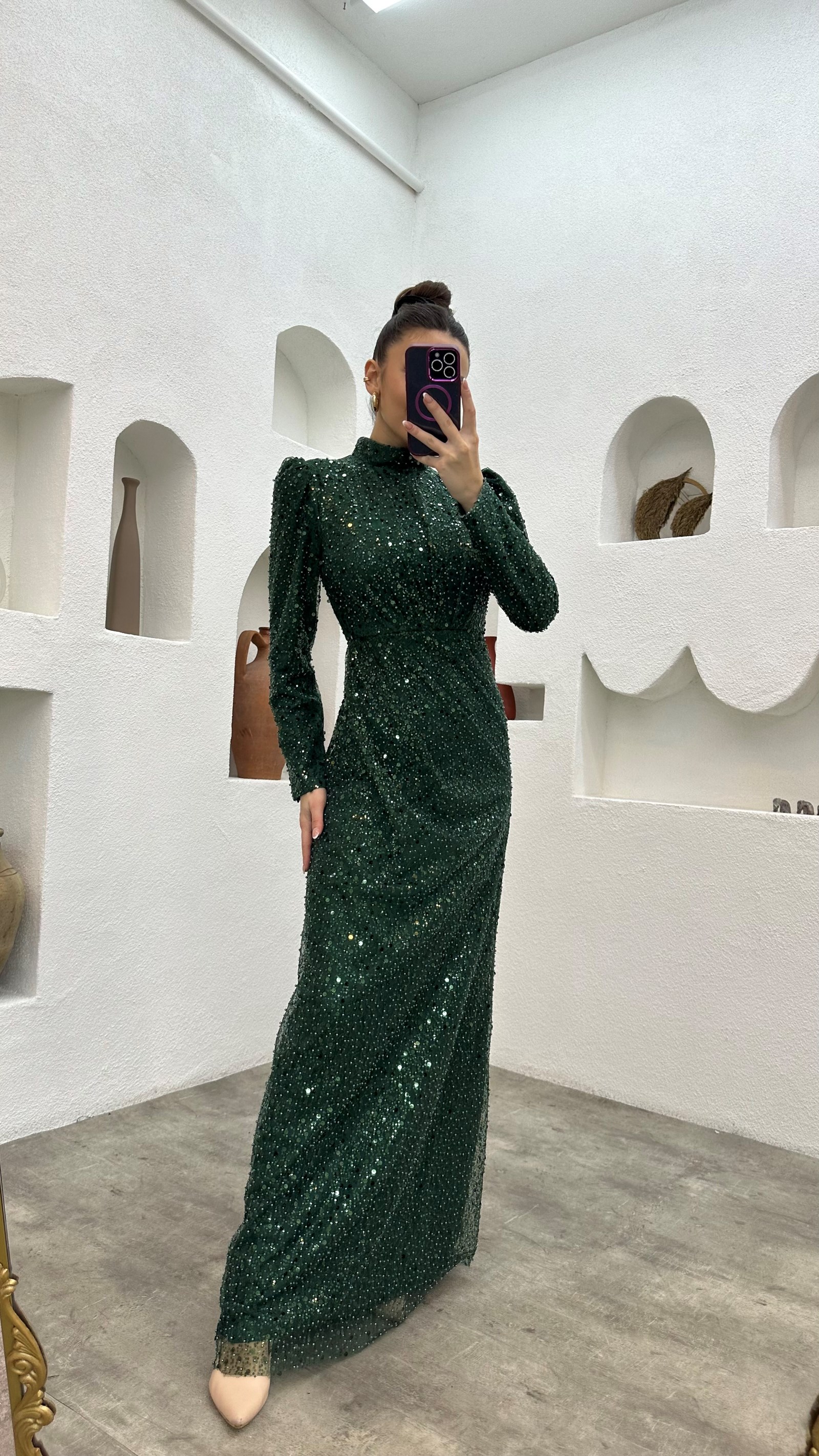 Zümrüt Uzun Kol Pul Payet Tesettür   Abiye Elbise