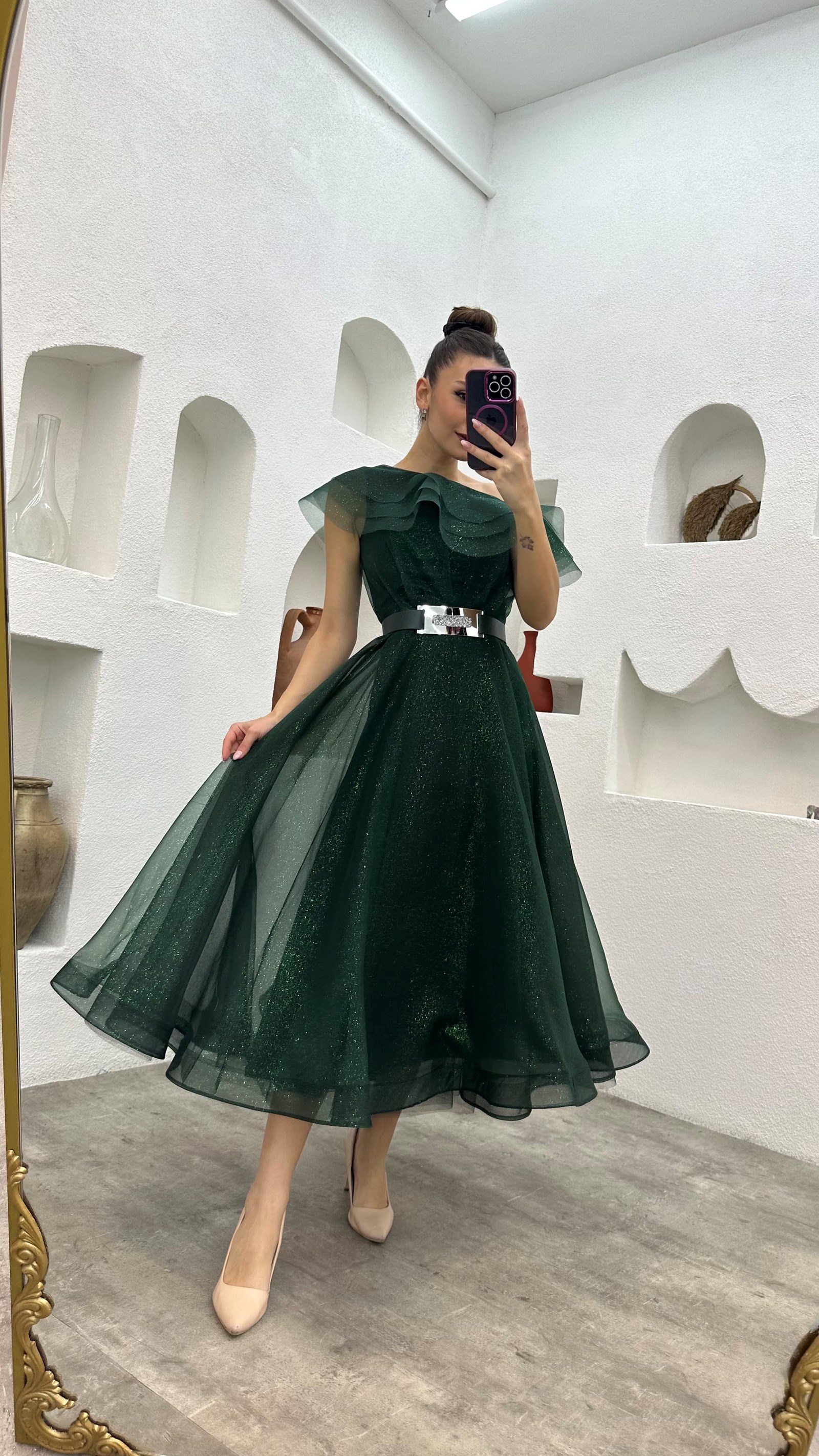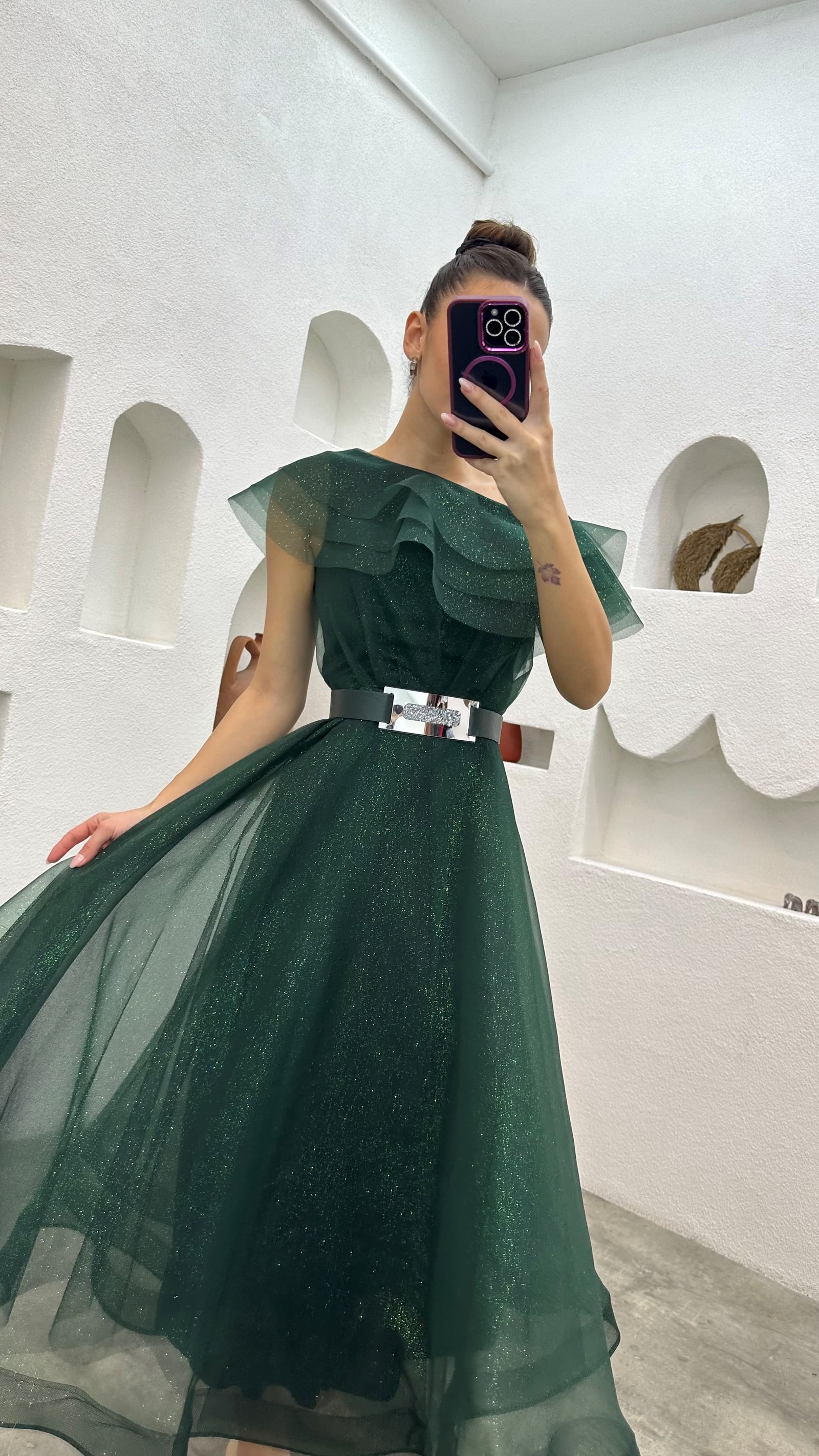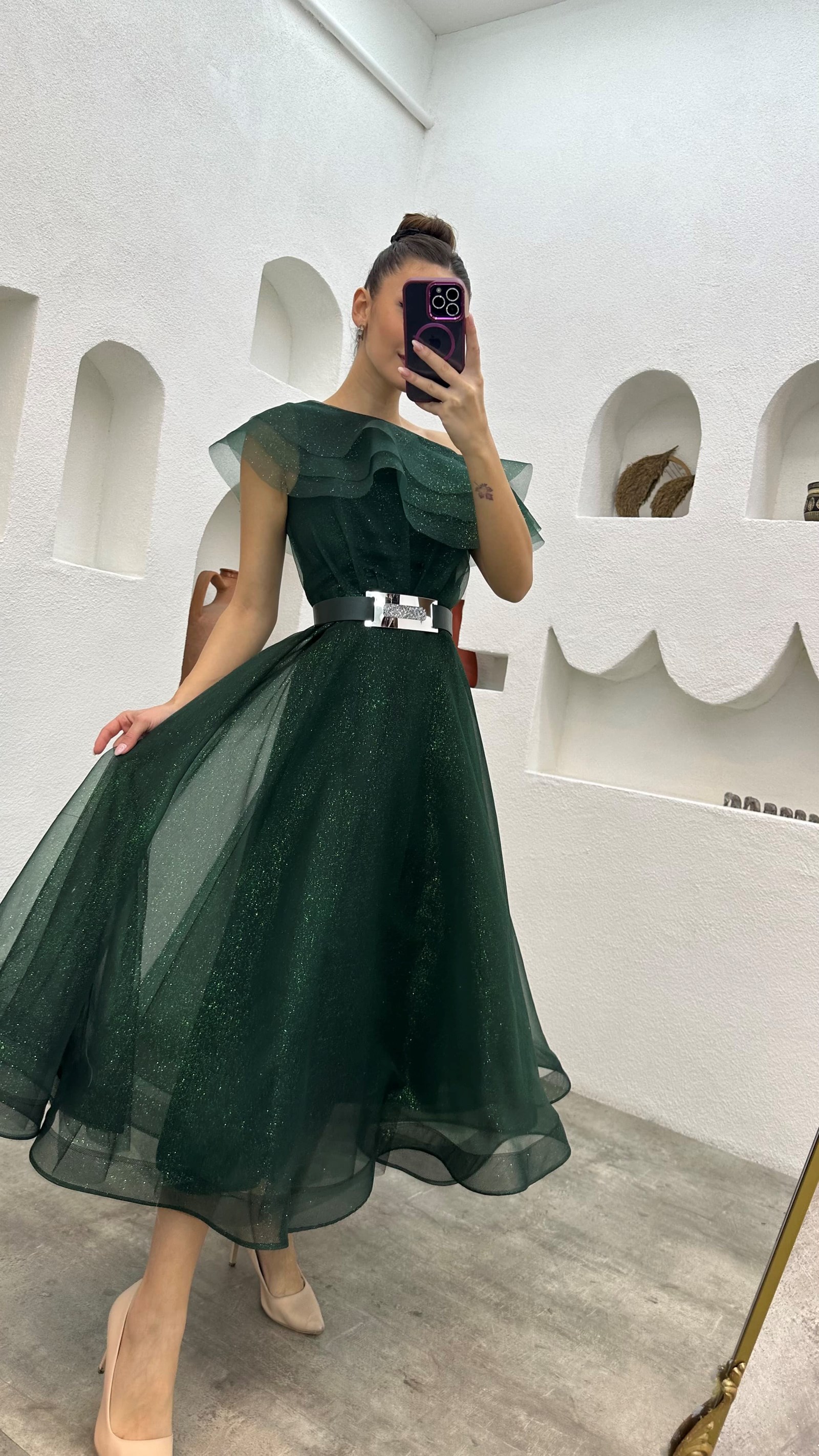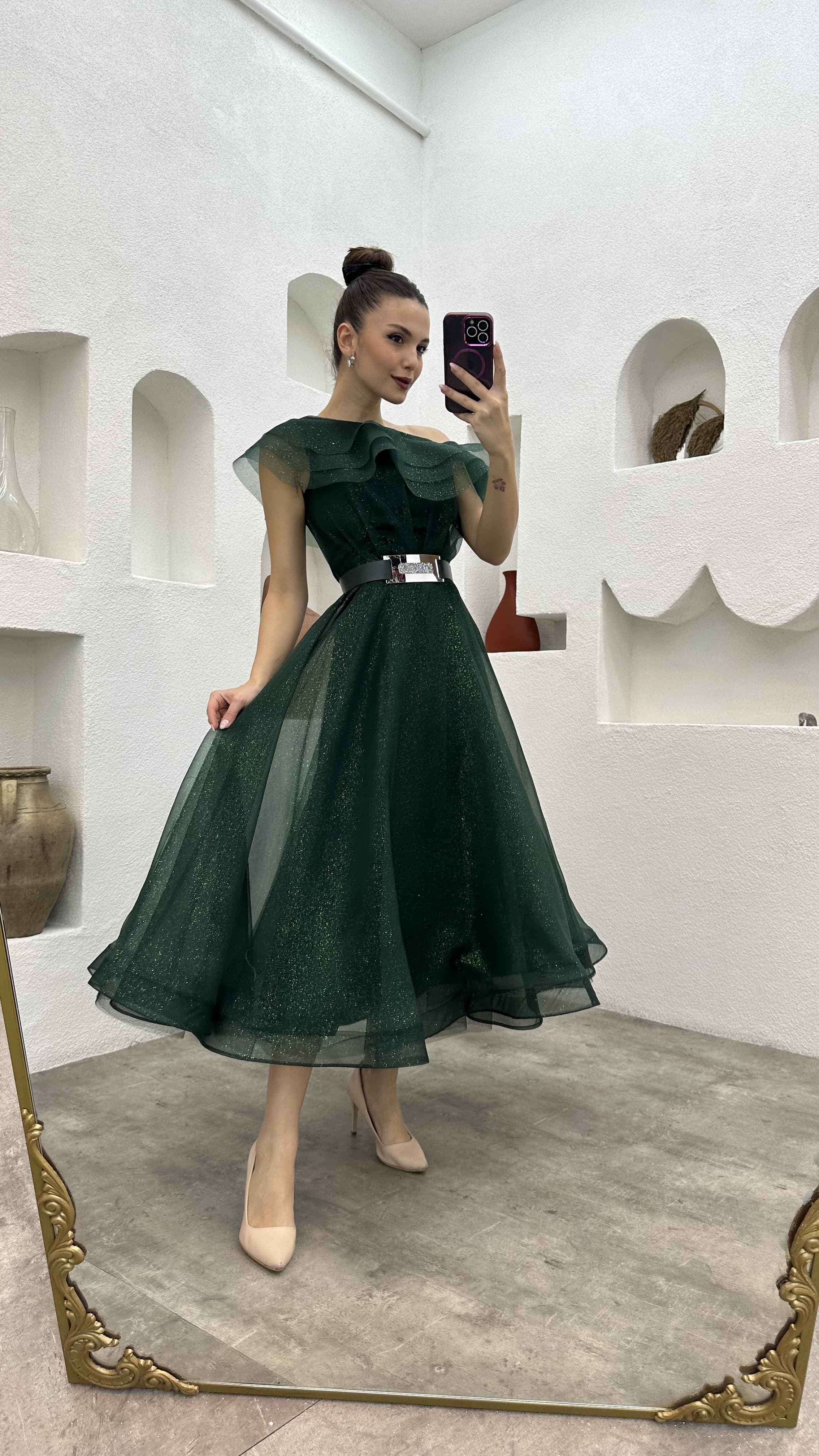 Zümrüt Volanlı Kemerli Midi Boy Tül Abiye Elbise