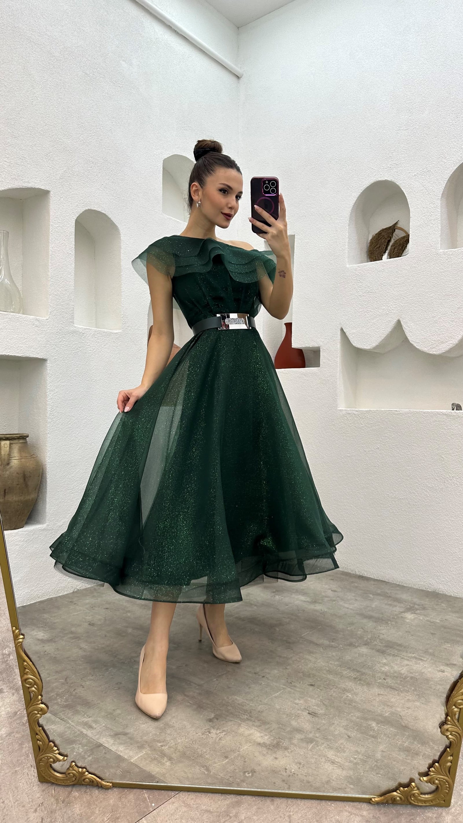 • Zümrüt Volanlı Kemerli Midi Boy Tül Abiye Elbise