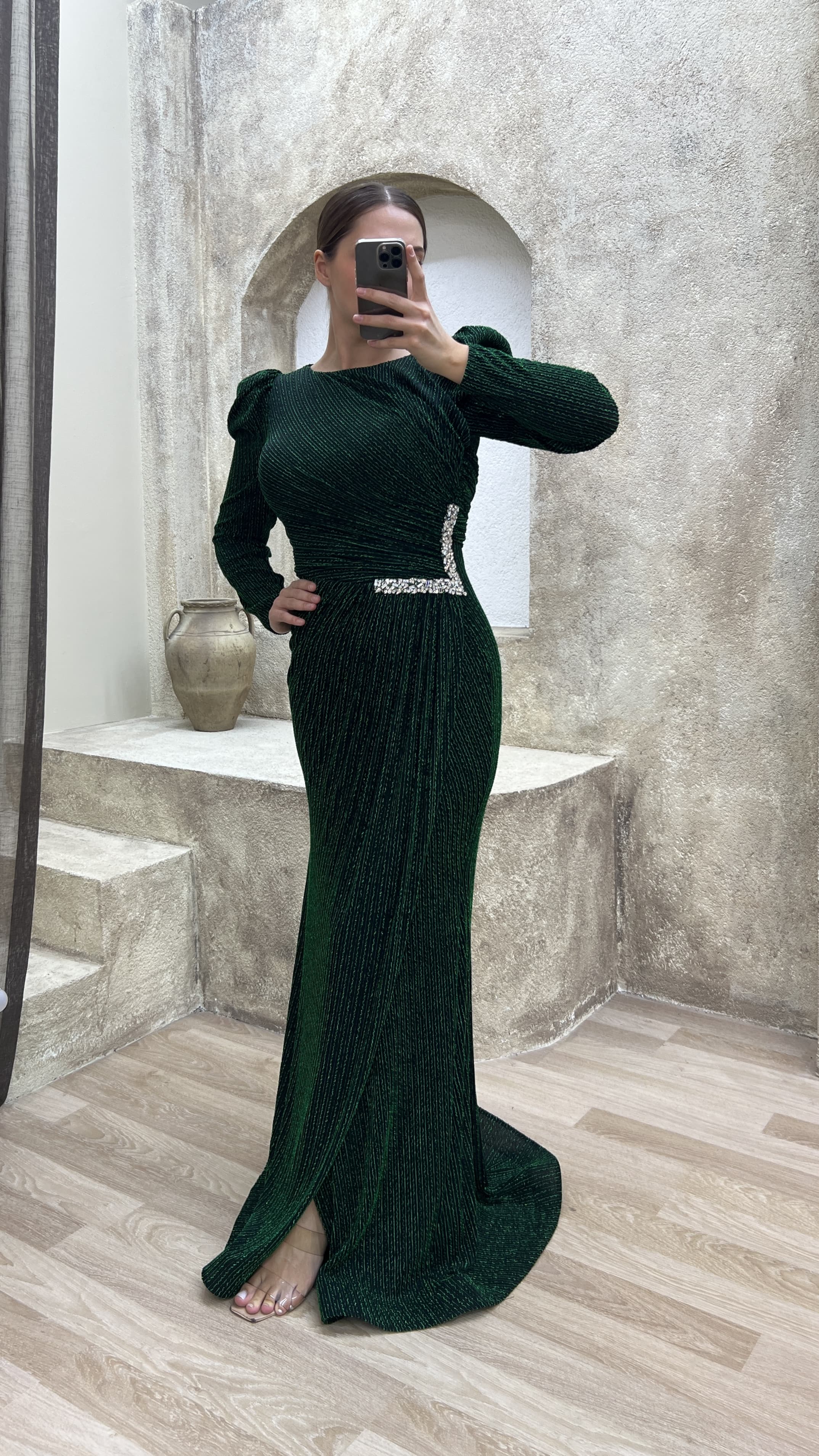 Zümrüt Yeşili Beli Taş Detay Vatkalı Tasarım Büyük Beden Abiye Elbise