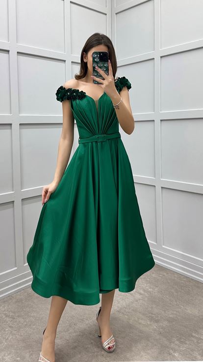 Zümrüt Yeşili Omuzları Gül Detay Kemerli Tasarım Elbise
