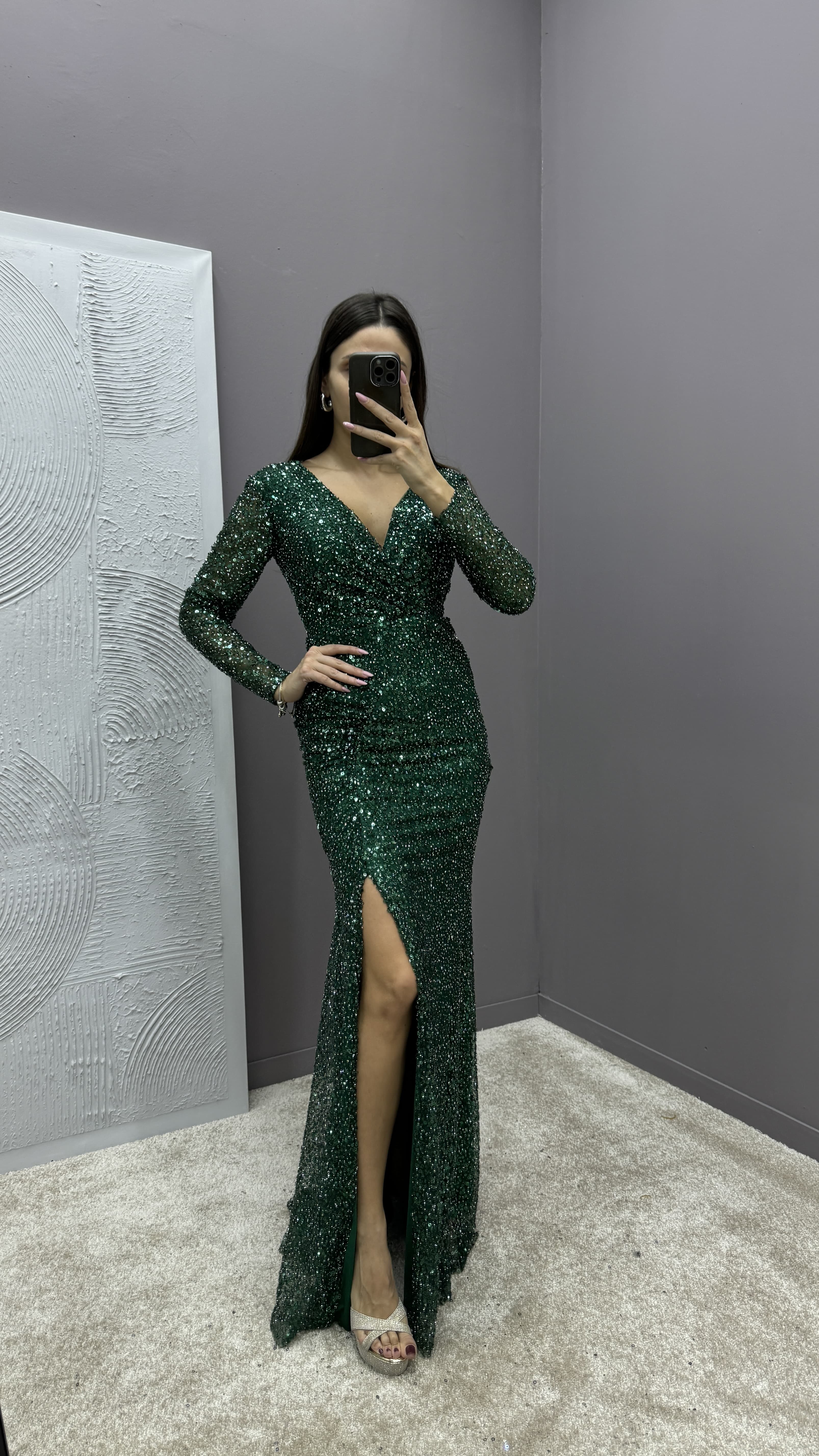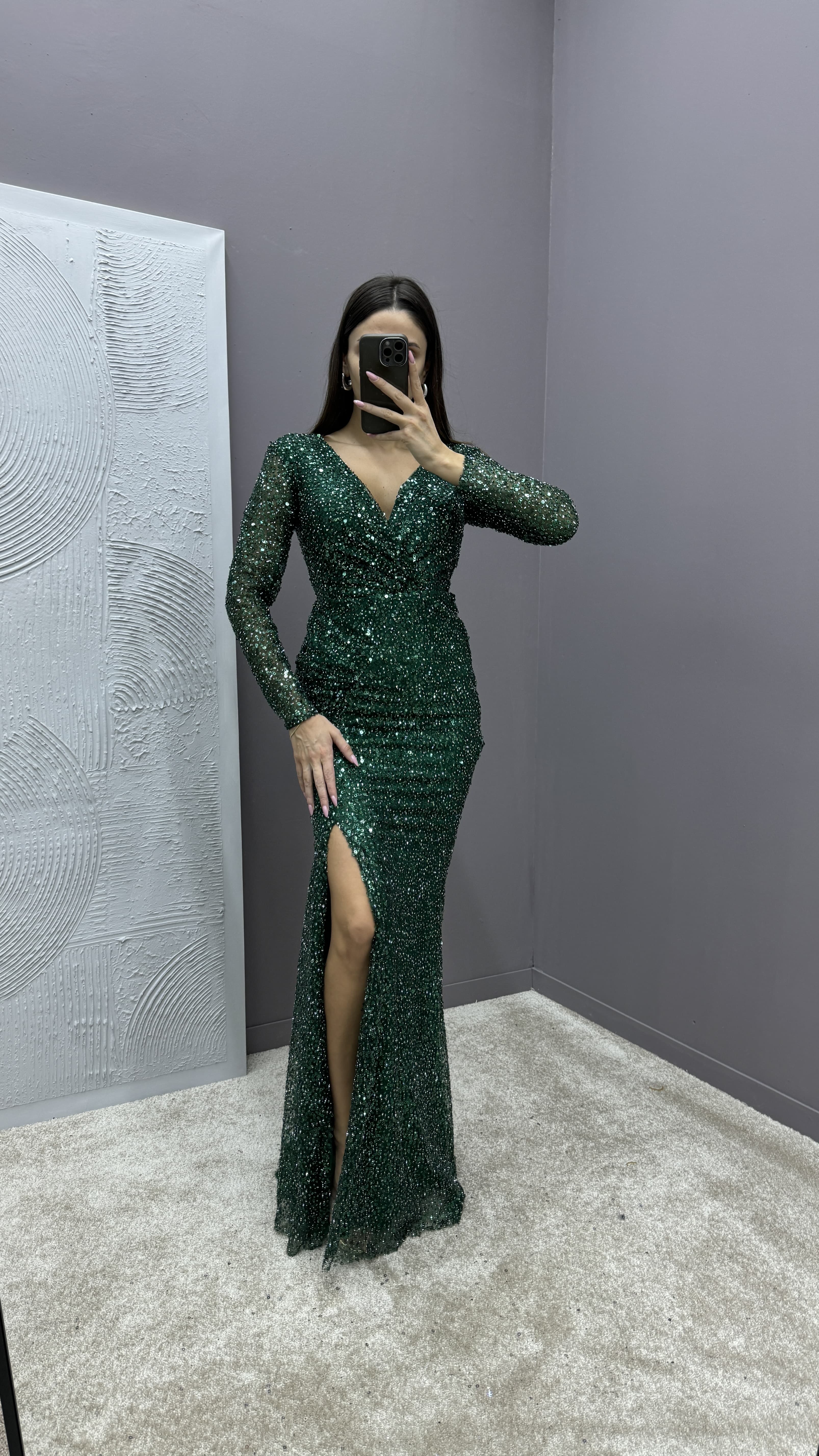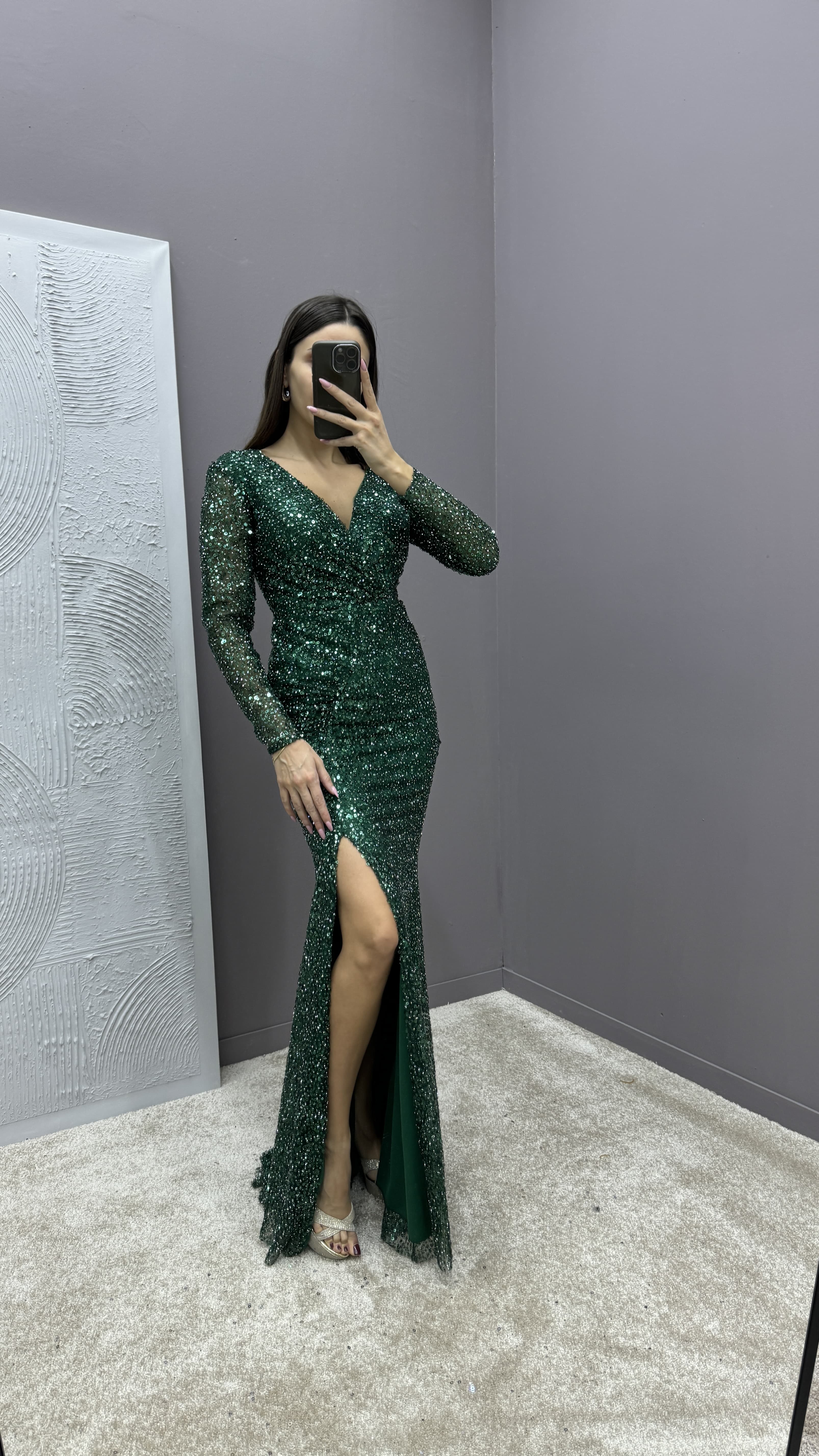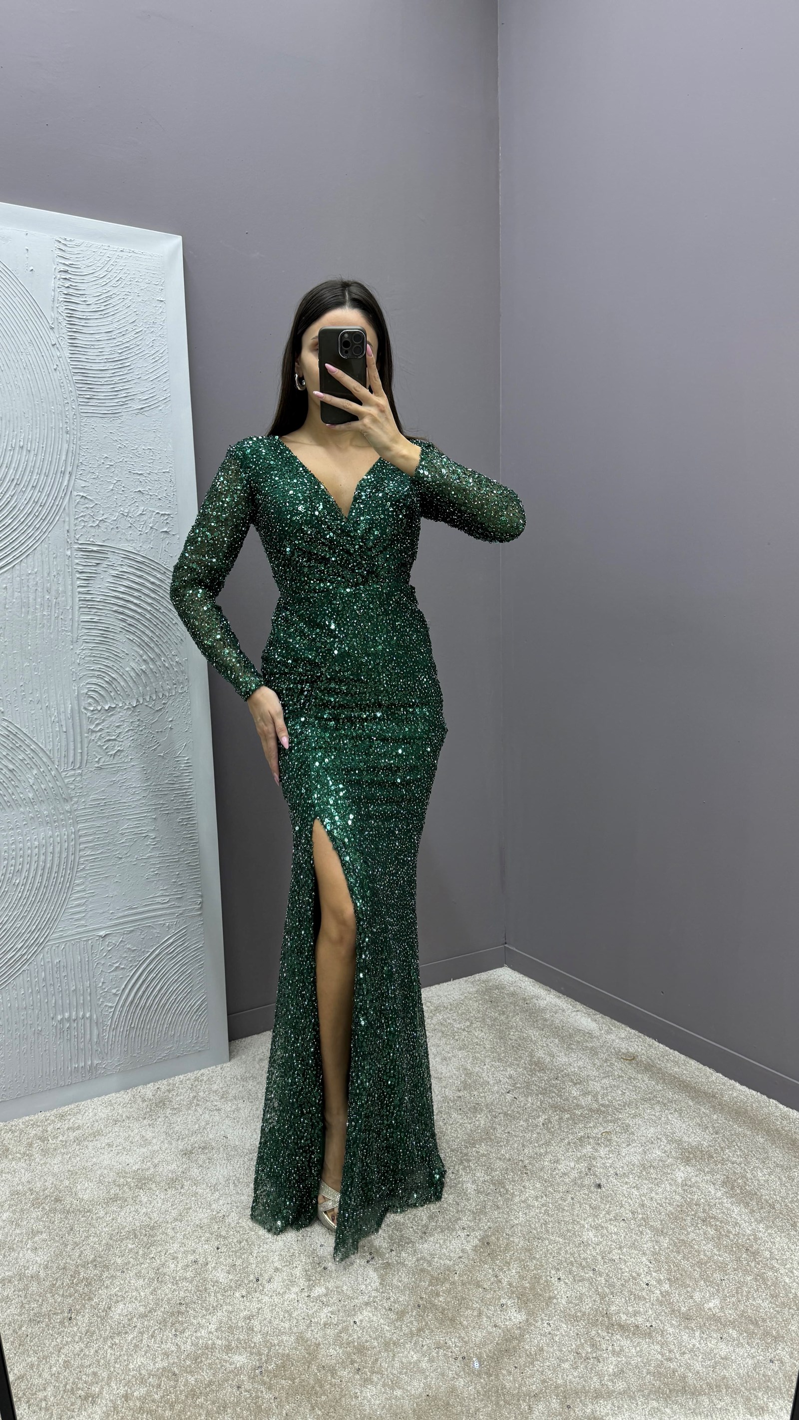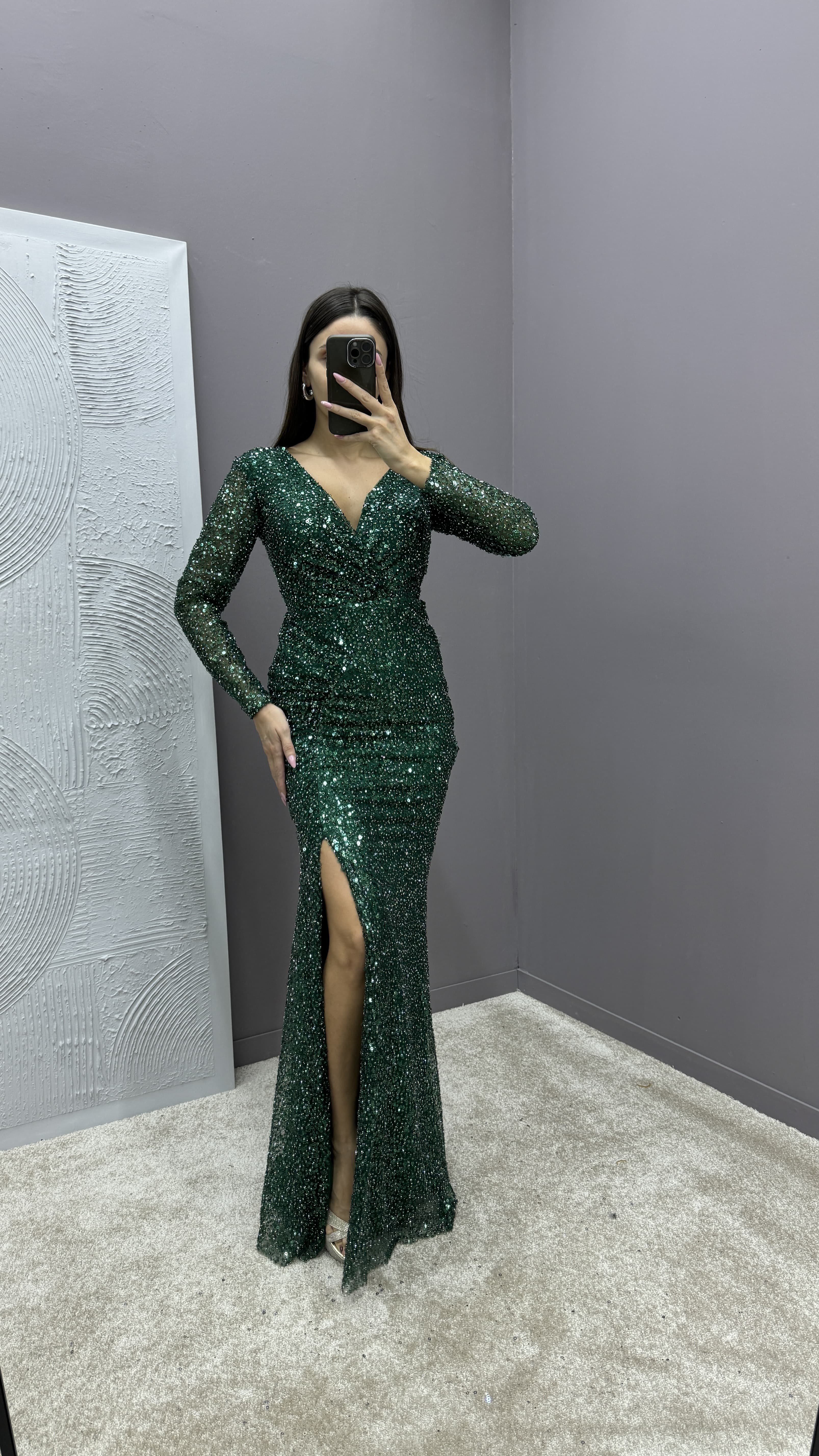 • Zümrüt Yeşili Pul Payet Kruvaze Yaka Tasarım Abiye Elbise