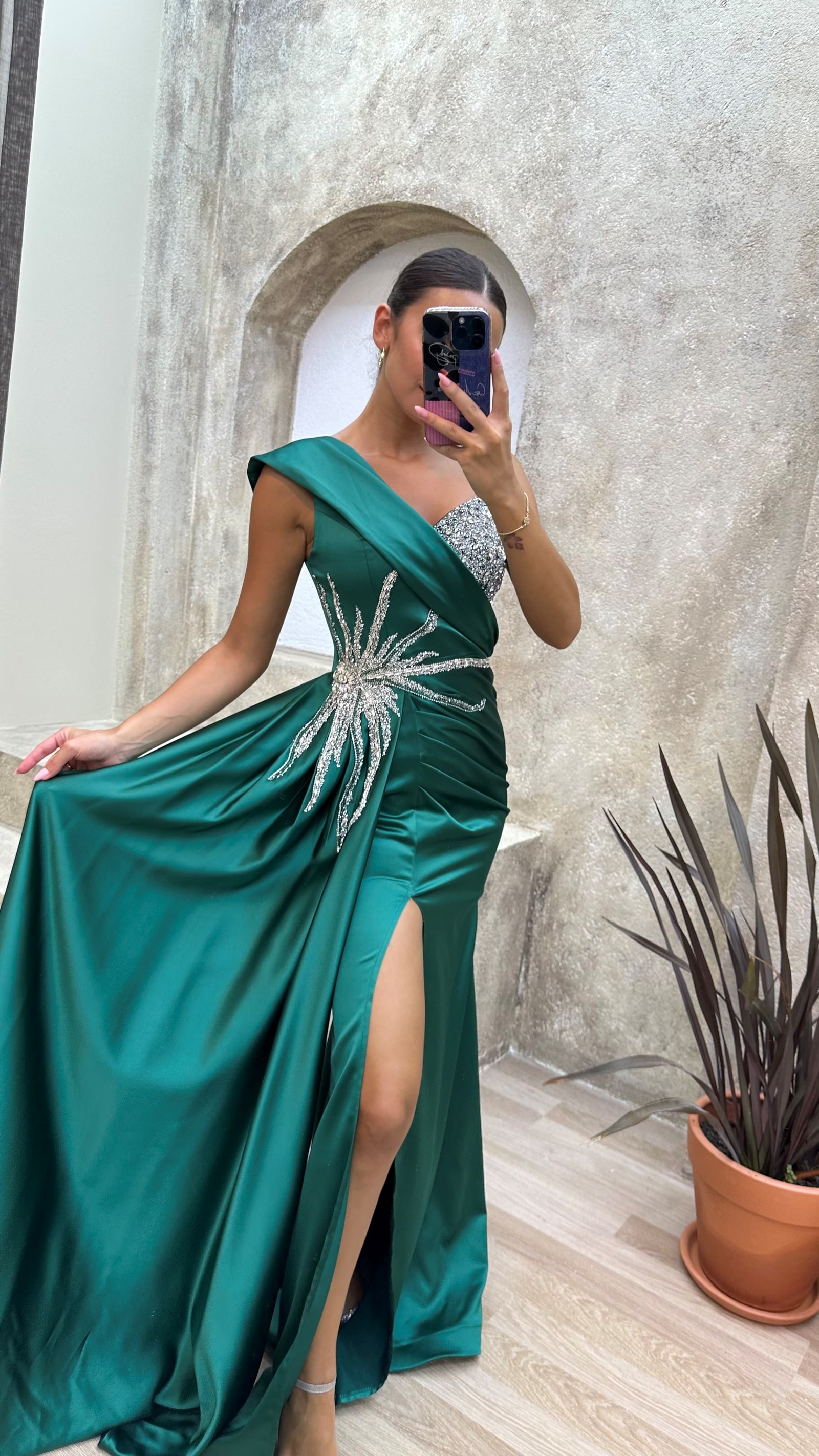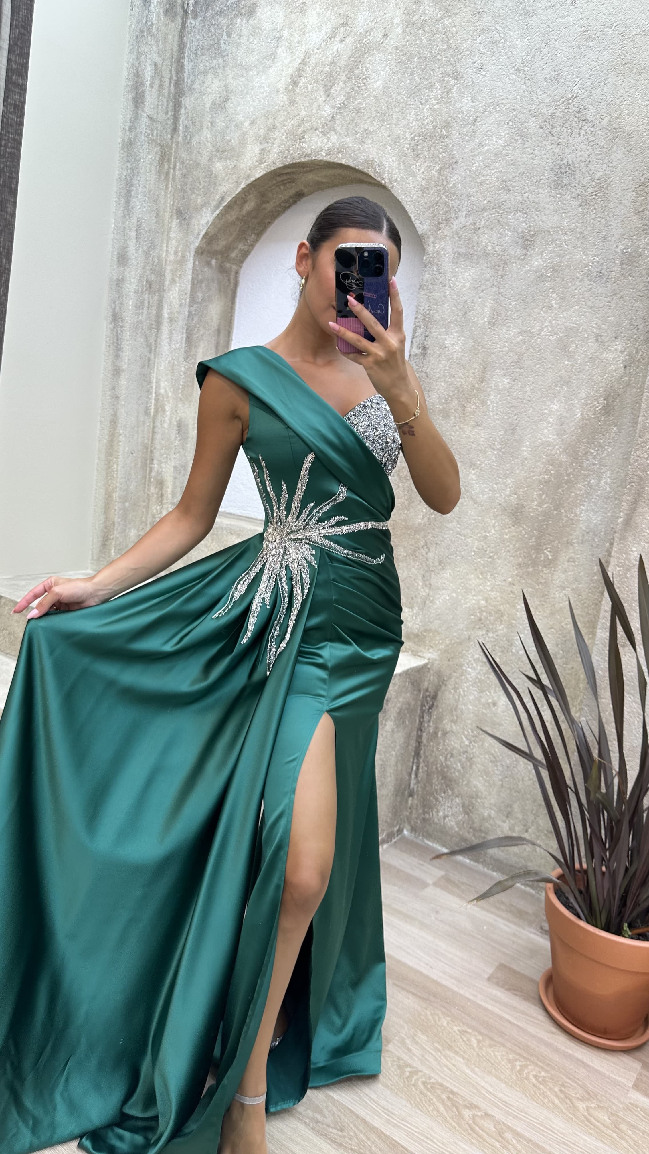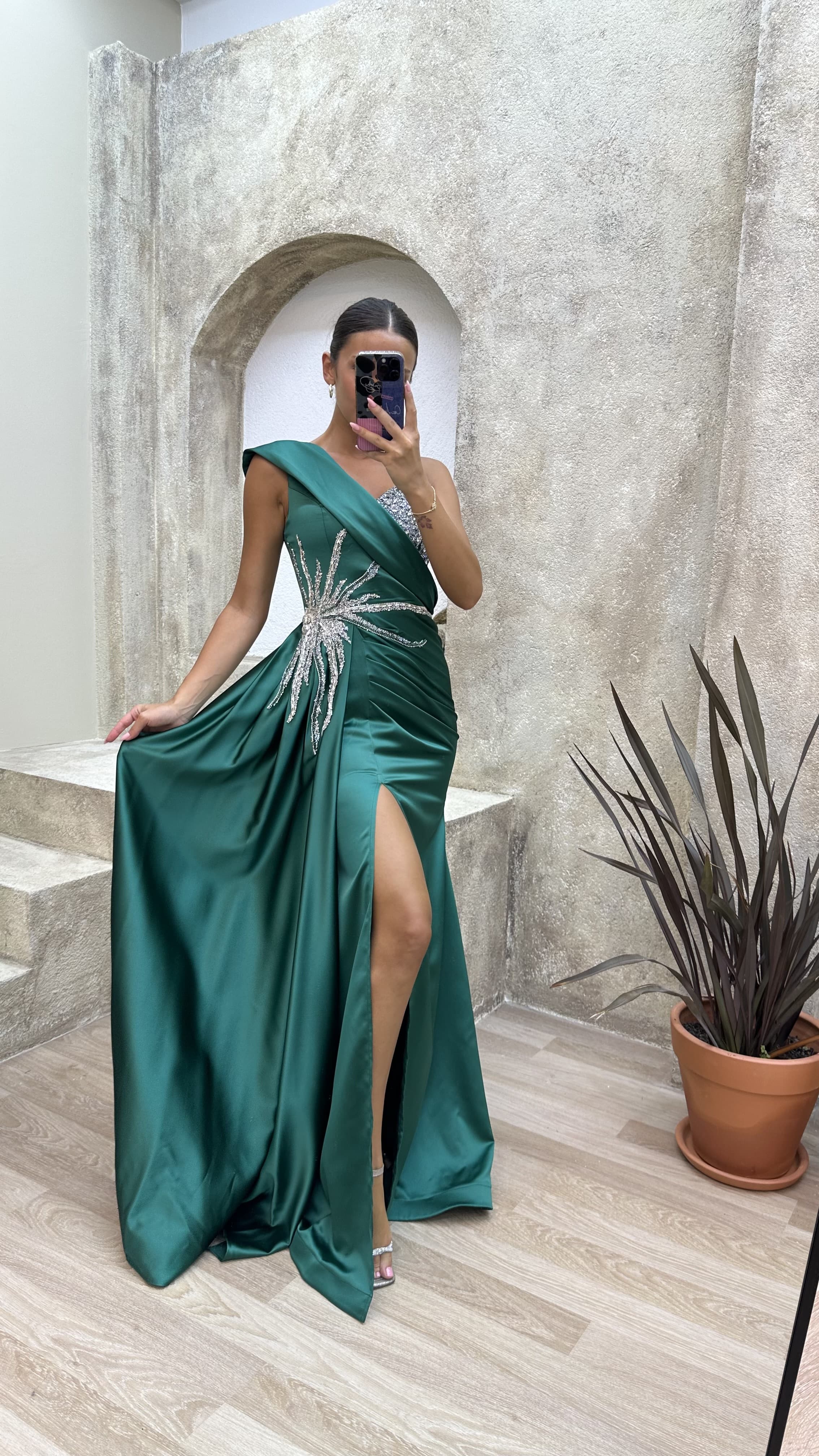 • Zümrüt Yeşili Tek Omuz İşlemeli Saten Abiye Elbise