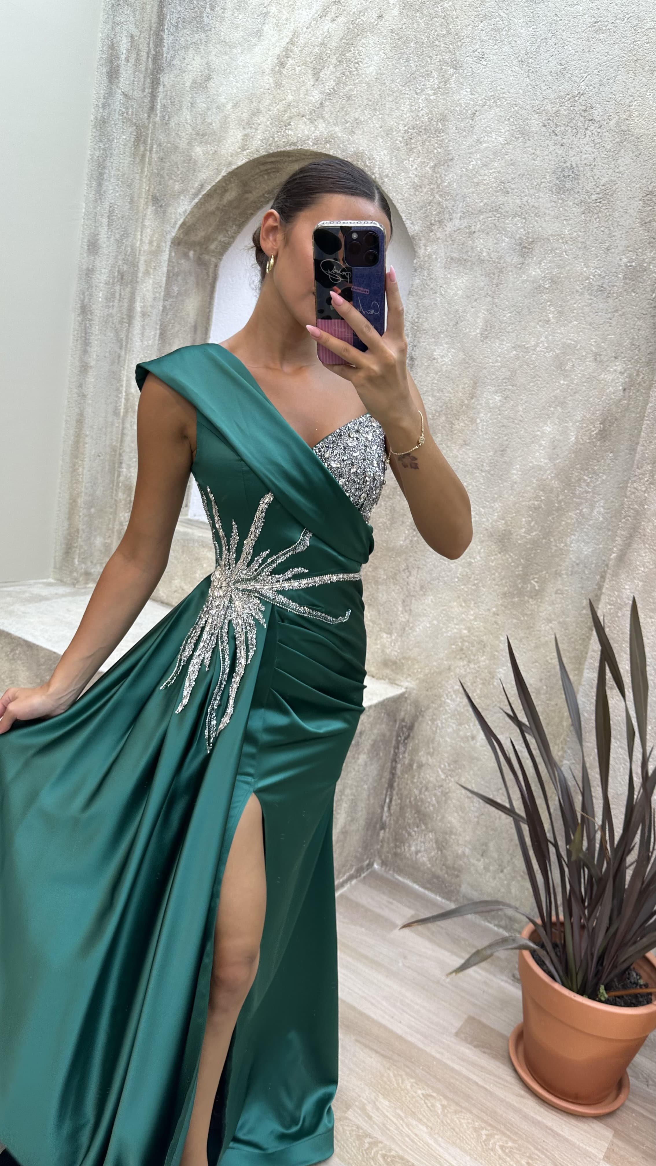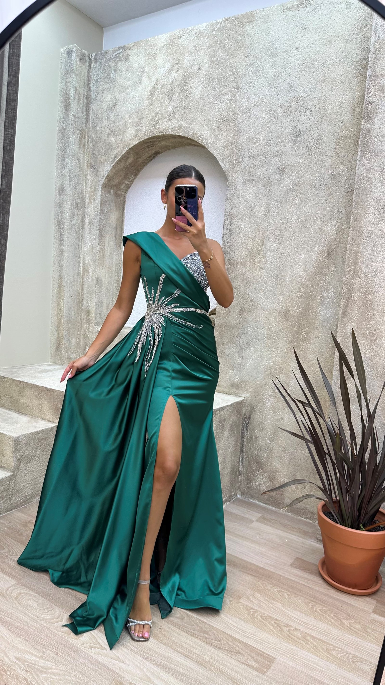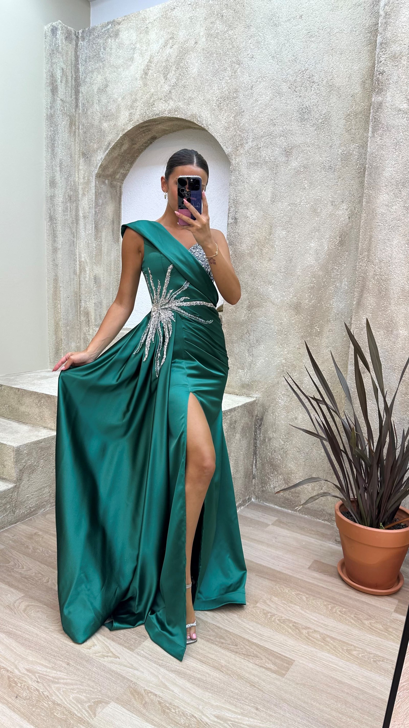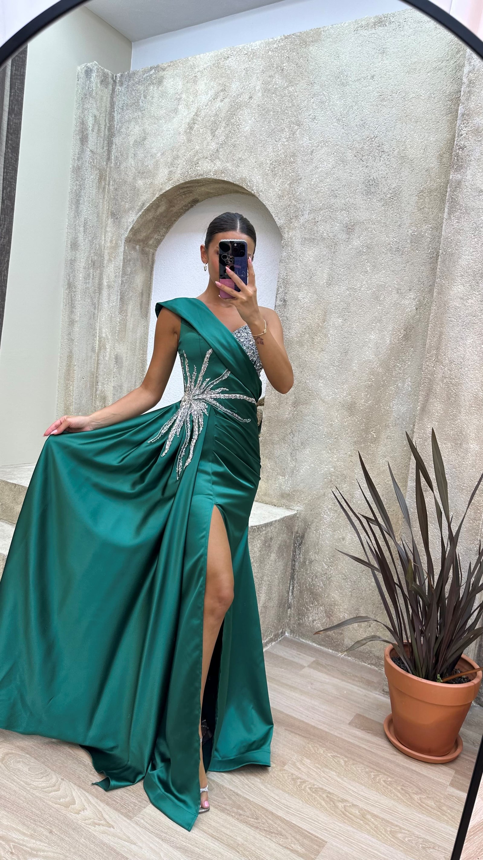 • Zümrüt Yeşili Tek Omuz İşlemeli Saten Abiye Elbise