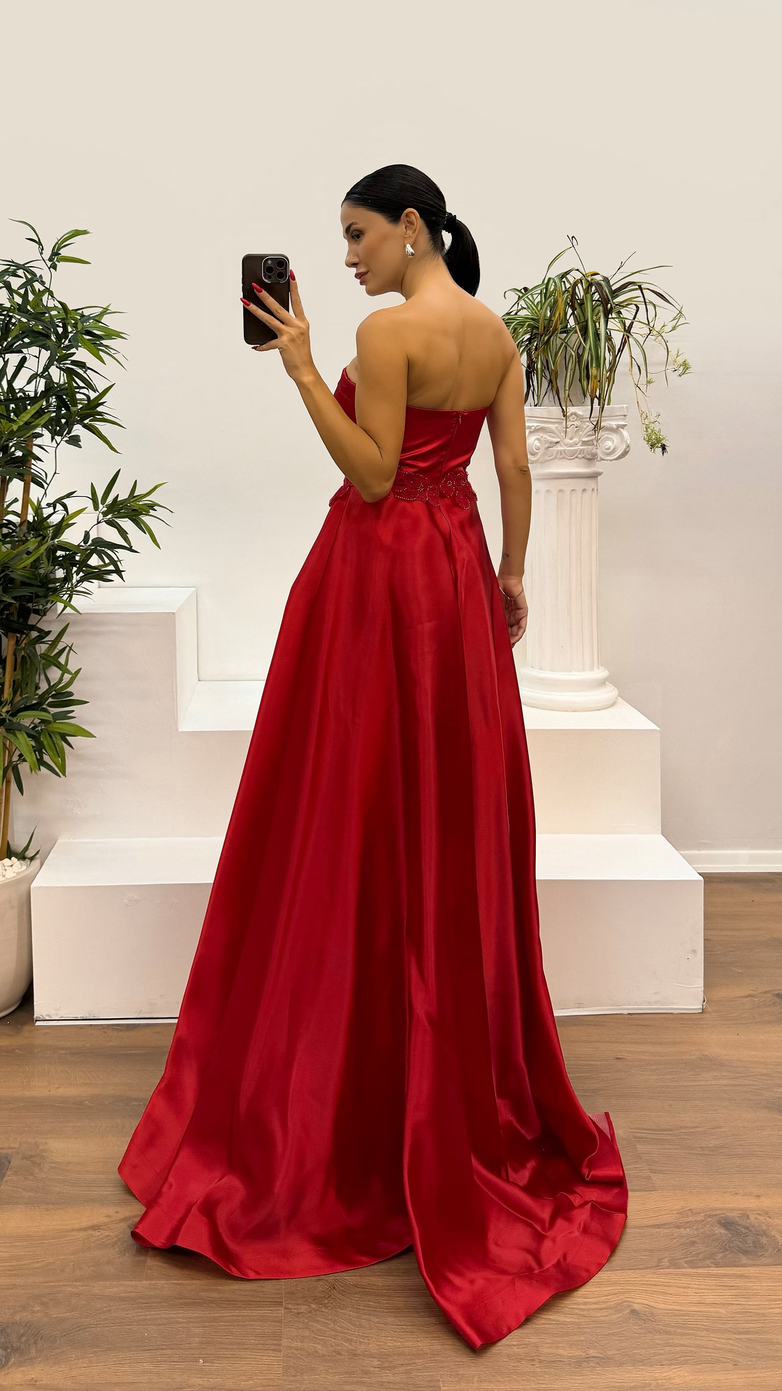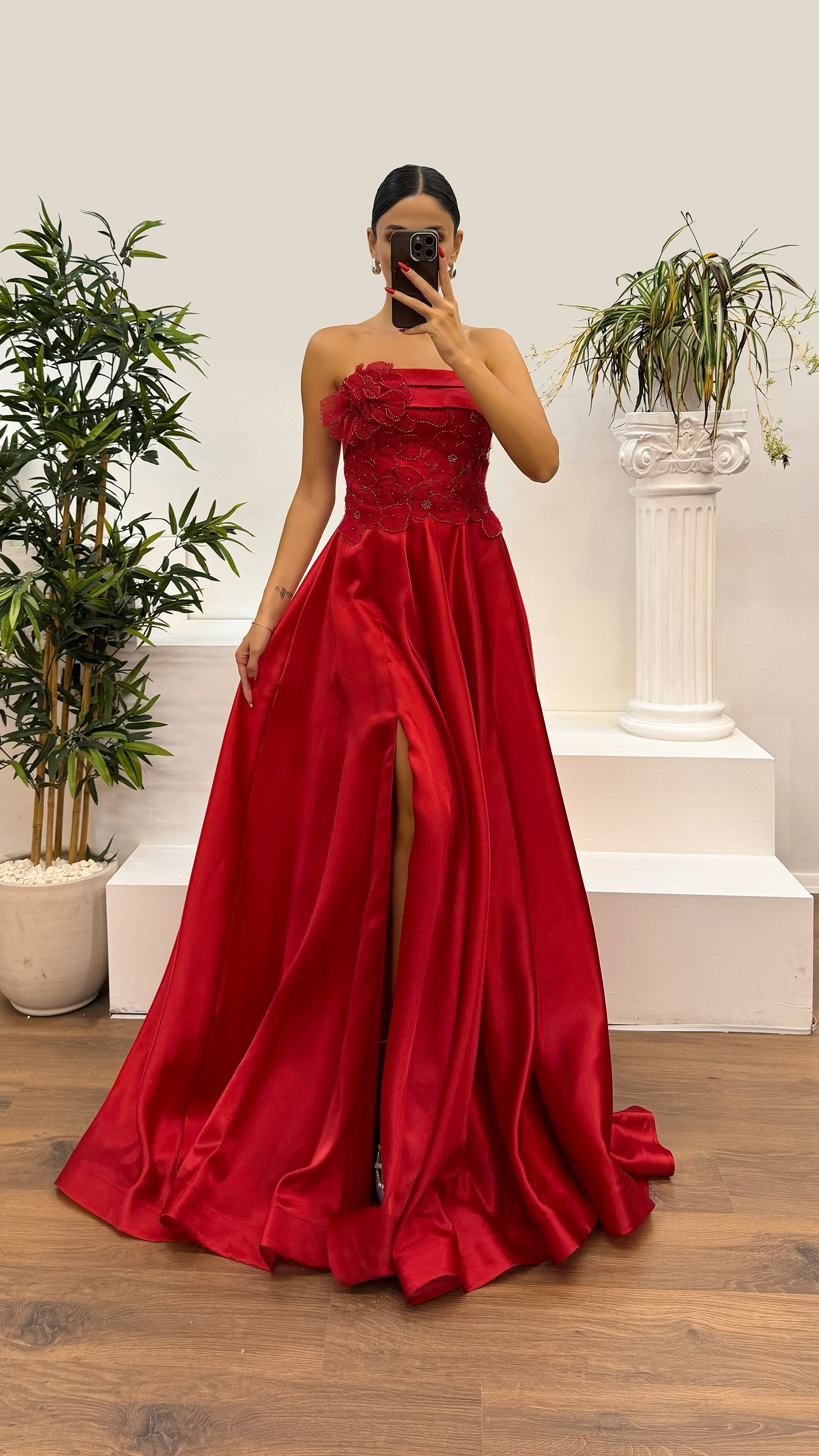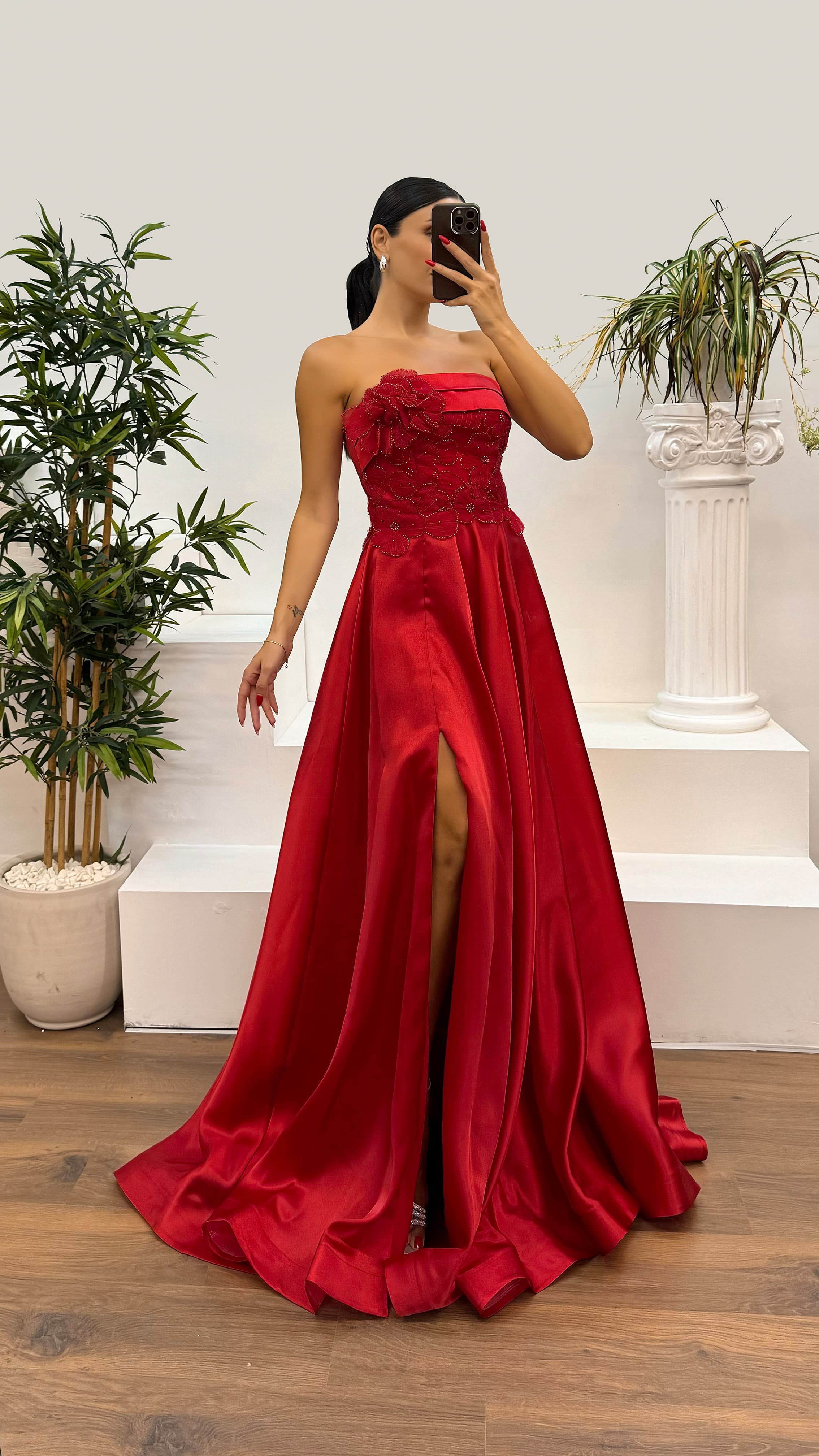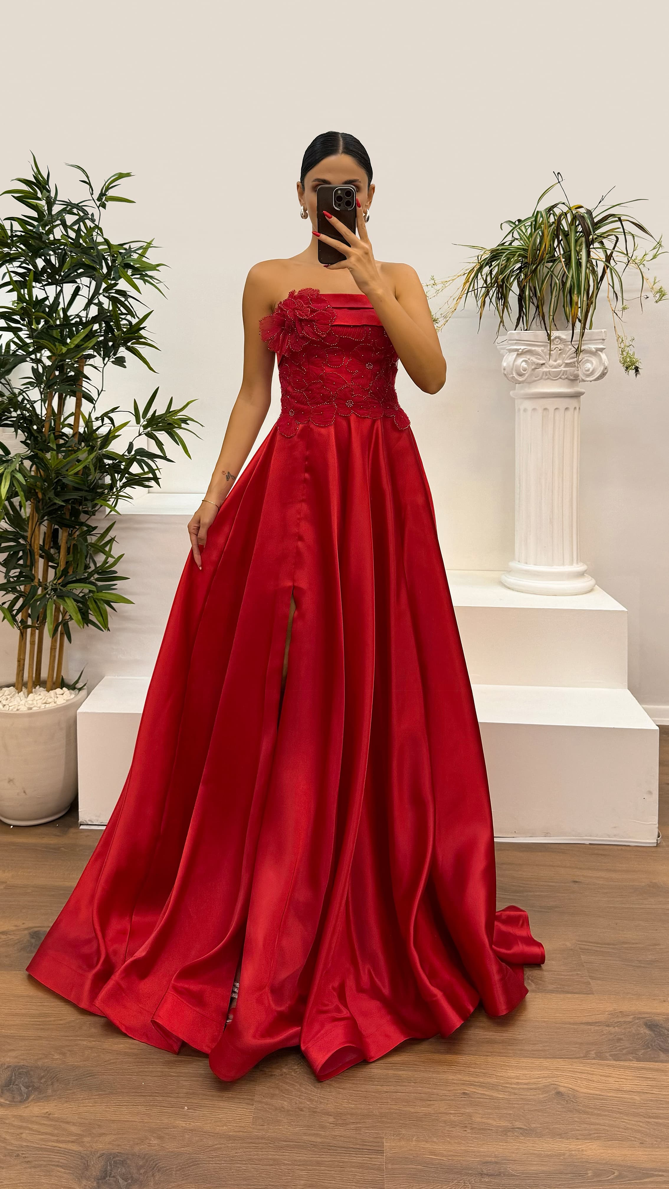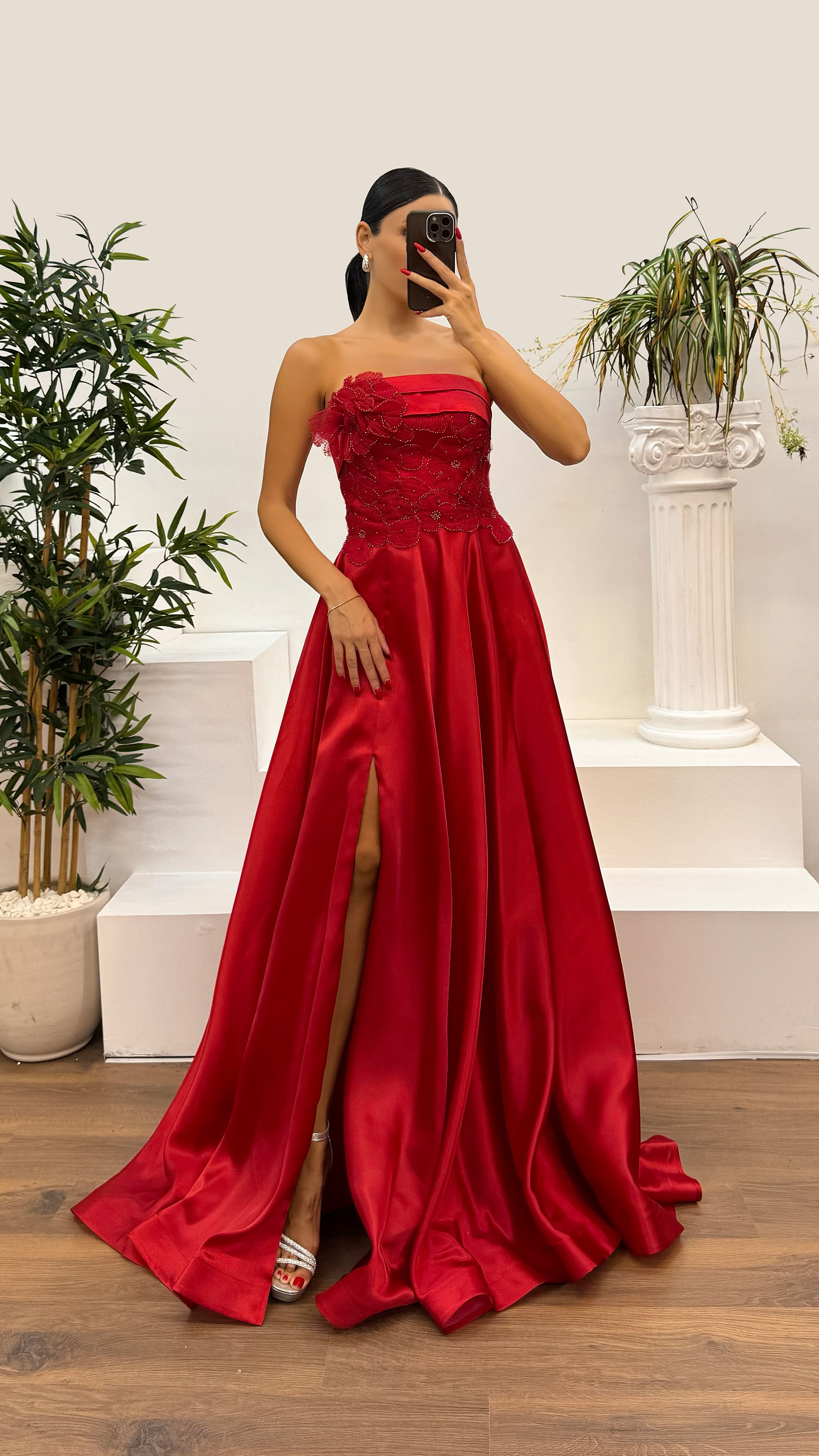 • Kırmızı Straplez Çiçek İşlemeli Saten Abiye Elbise