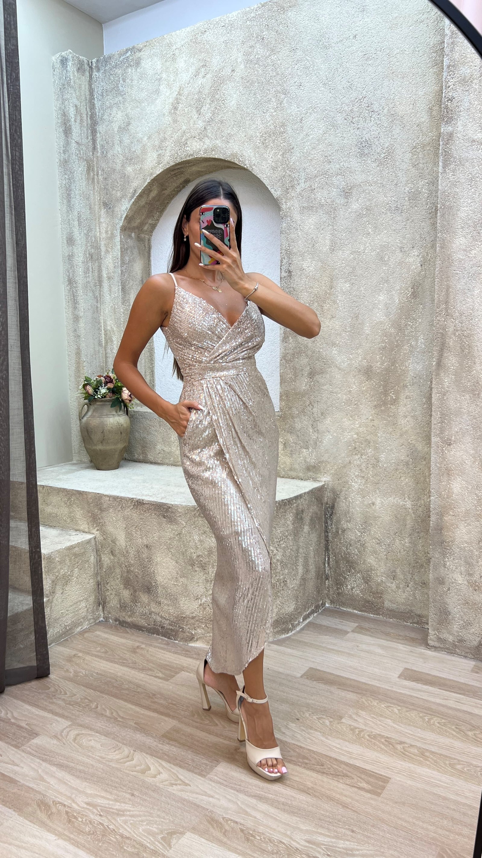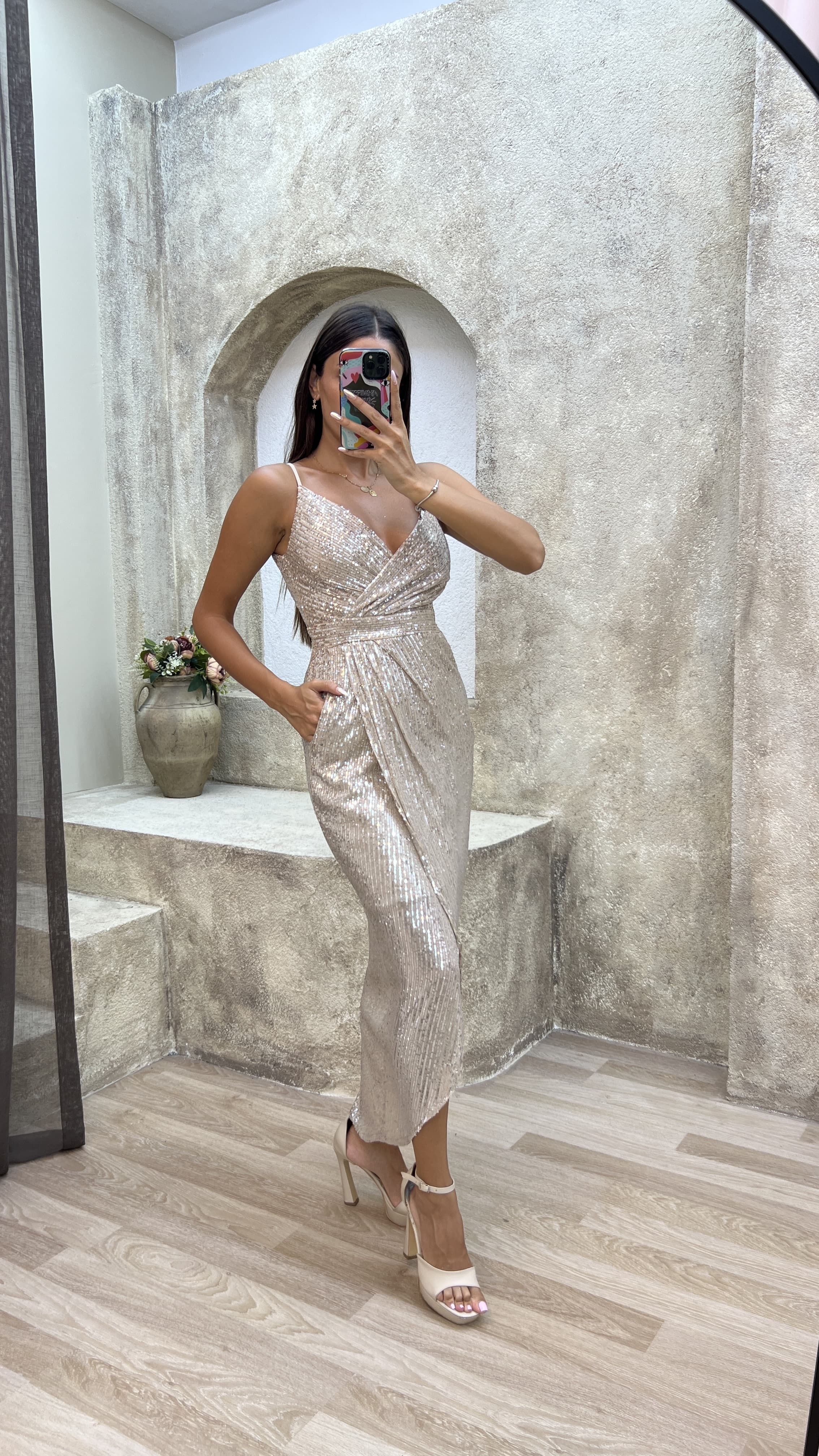 • Bej İp Askılı Sırt Detay Midi Payet Abiye Elbise
